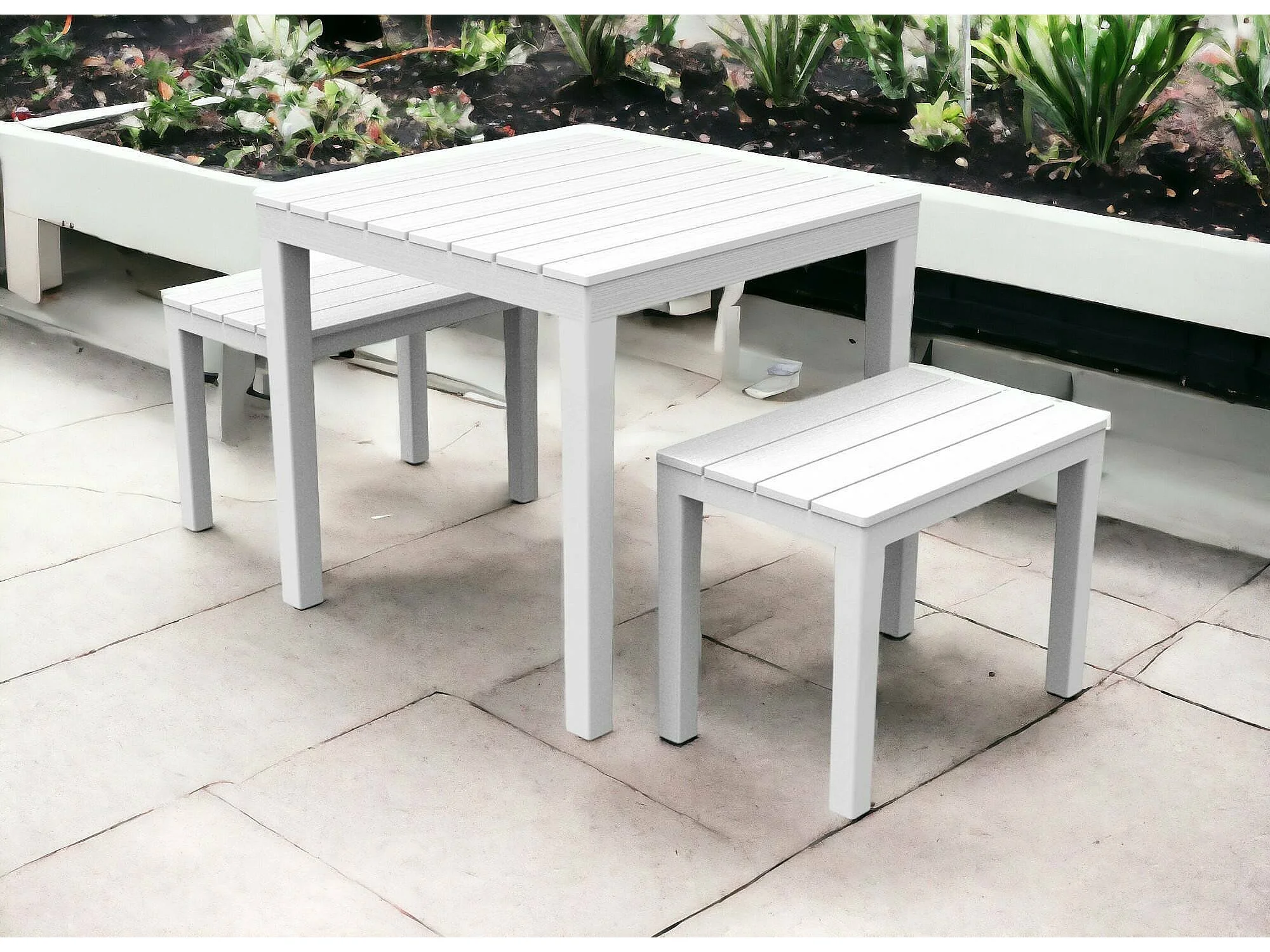 Ensemble de salon d'extérieur Moncalieri, Composition de jardin avec 1 table carrée et 2 bancs, Salon intérieur et extérieur de Pic Nic, 100% Made in Italy, Blanc