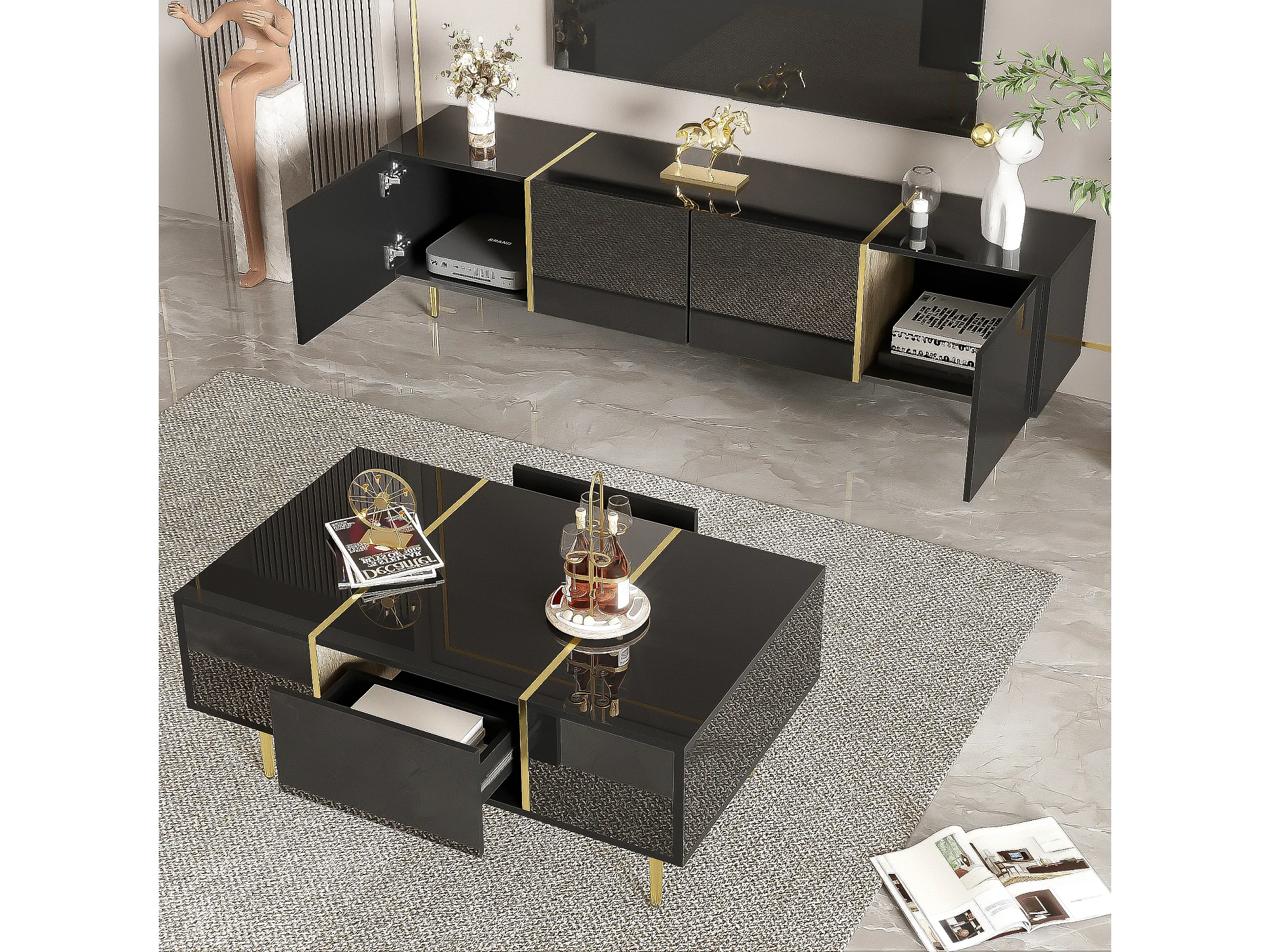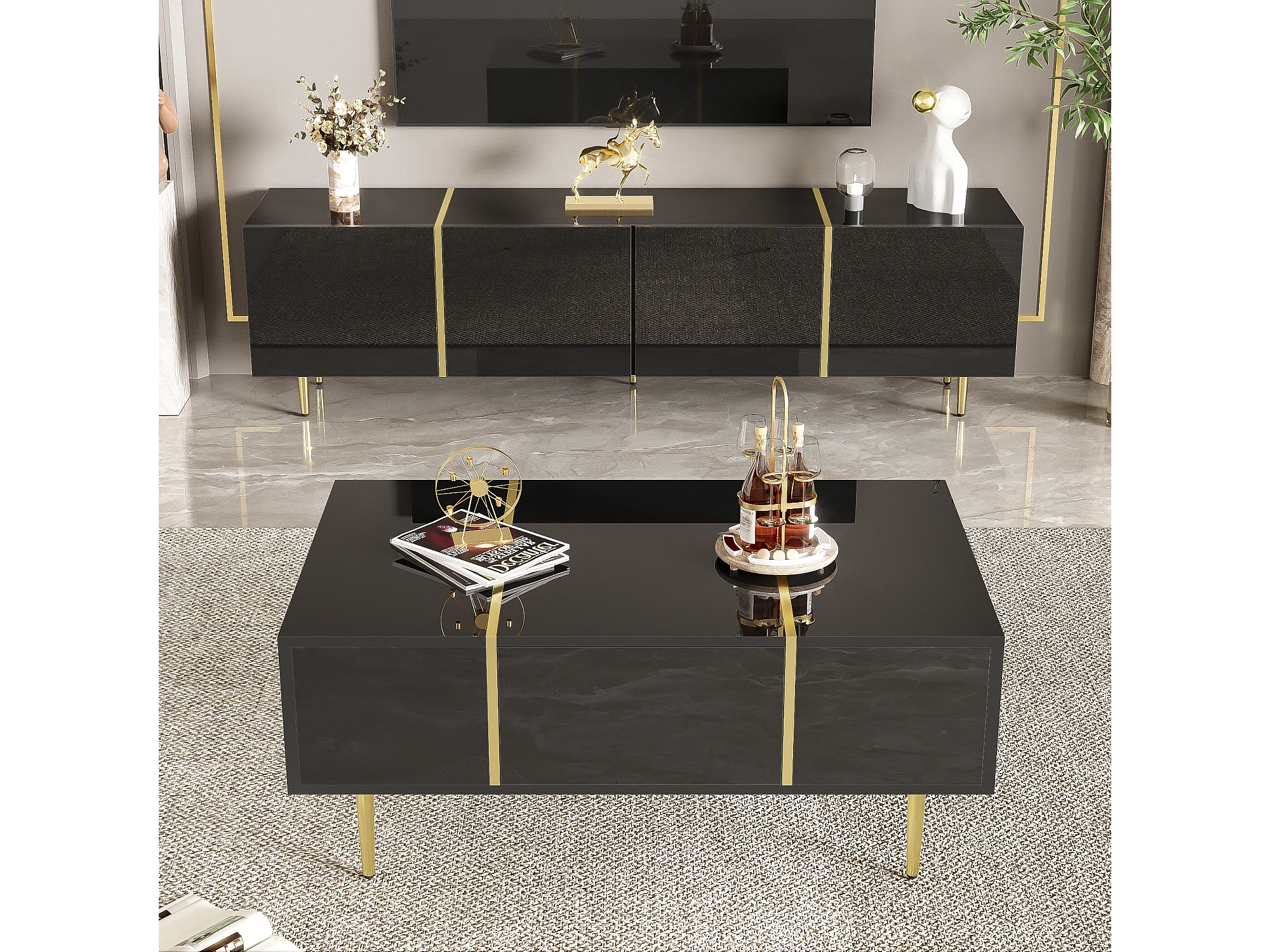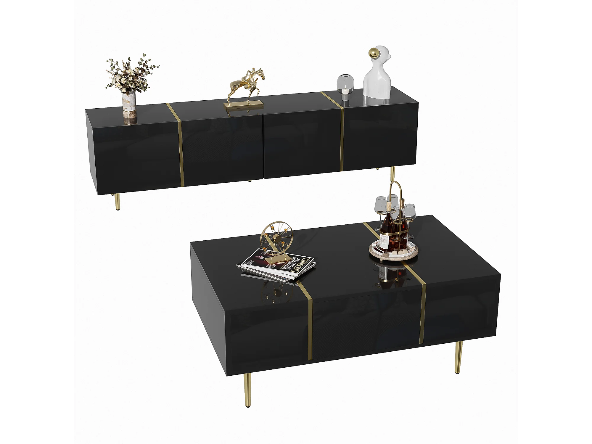 Set Meuble TV et Table Basse Haut Brillant Noir, Design Élégant, MDF (170x35x46cm / 100x60x41.5cm)
