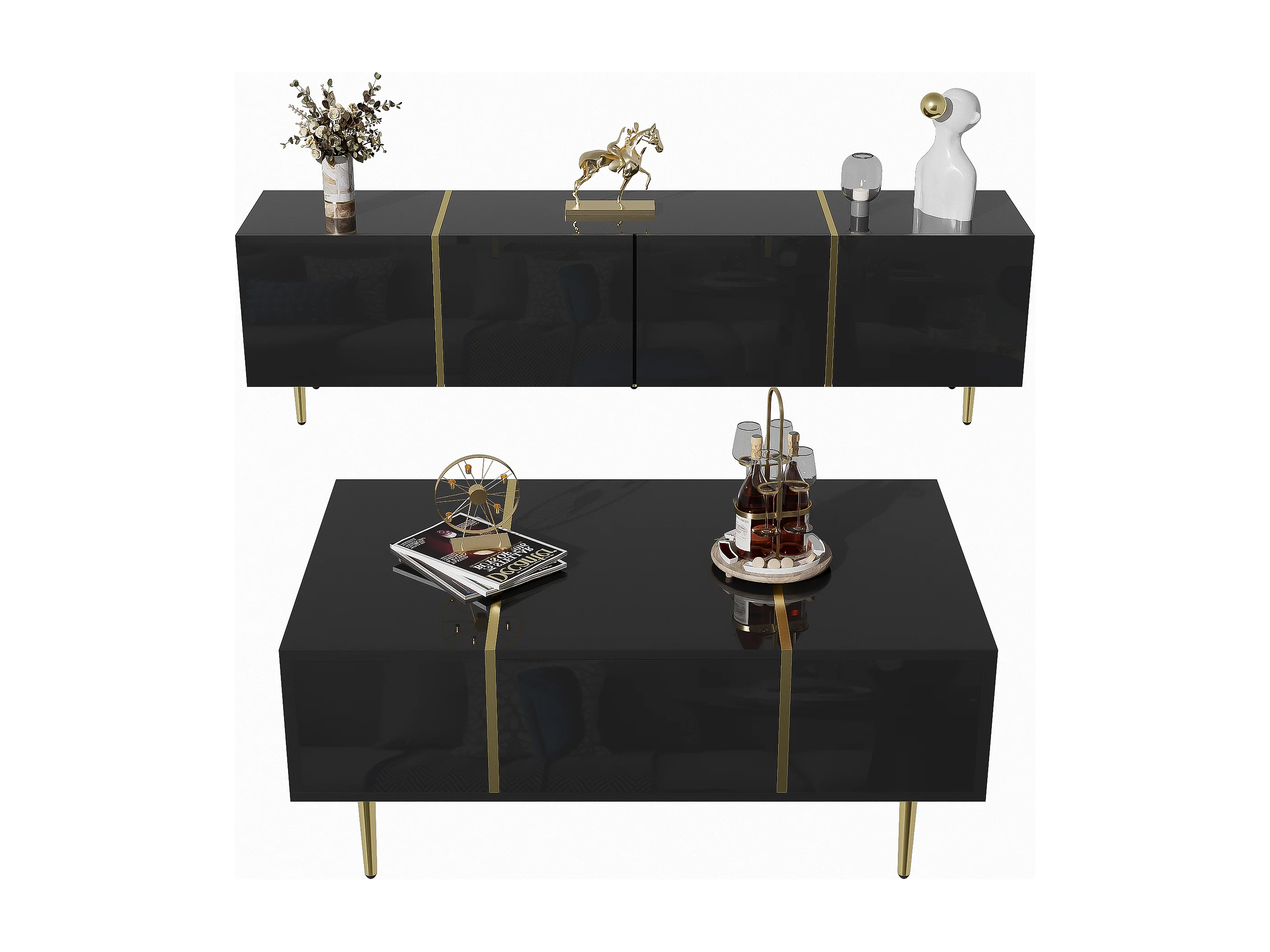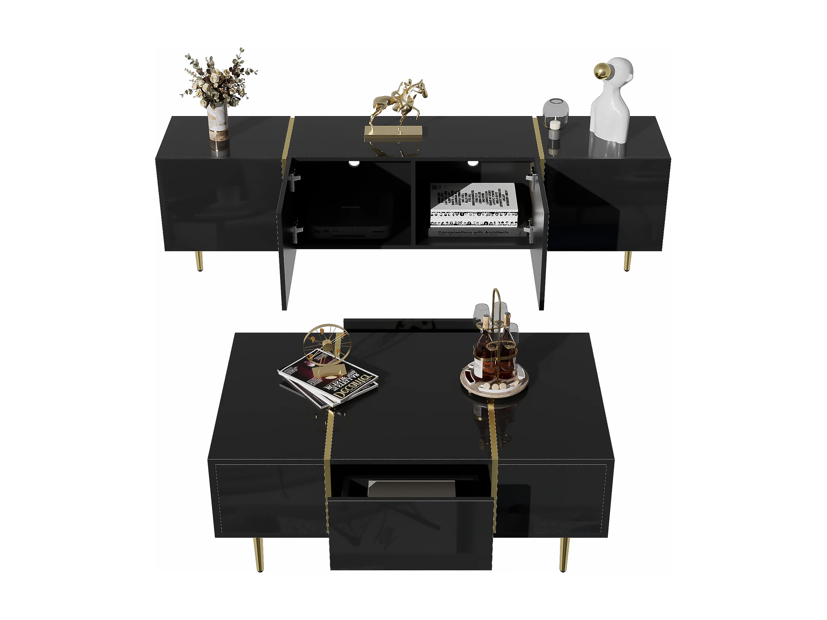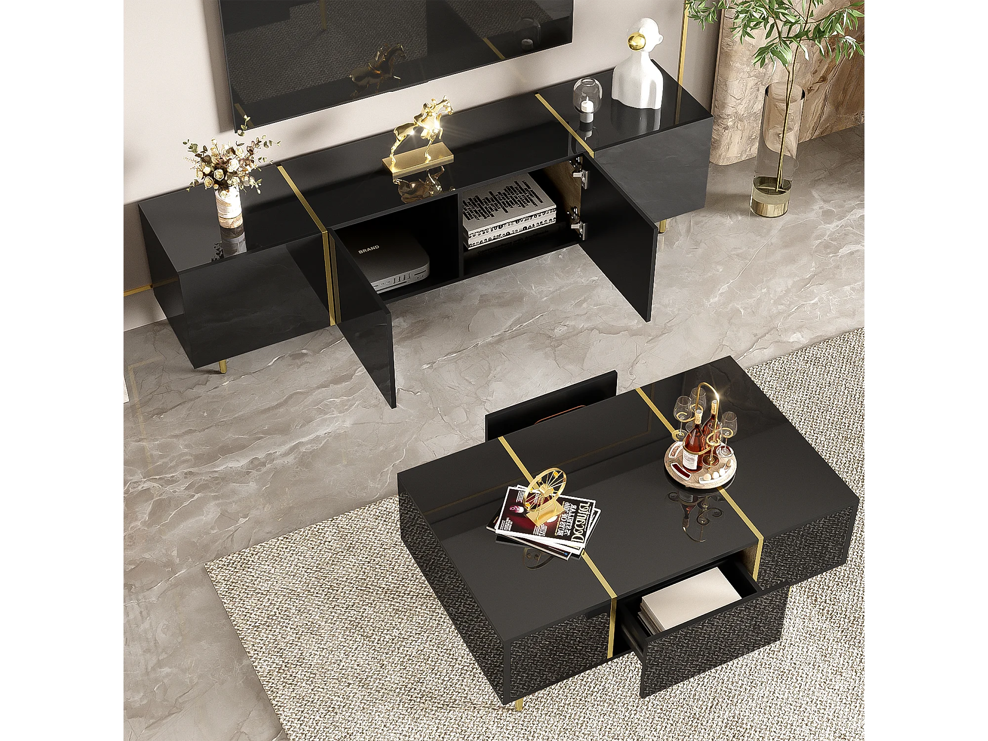 Set Meuble TV et Table Basse Haut Brillant Noir, Design Élégant, MDF (170x35x46cm / 100x60x41.5cm)