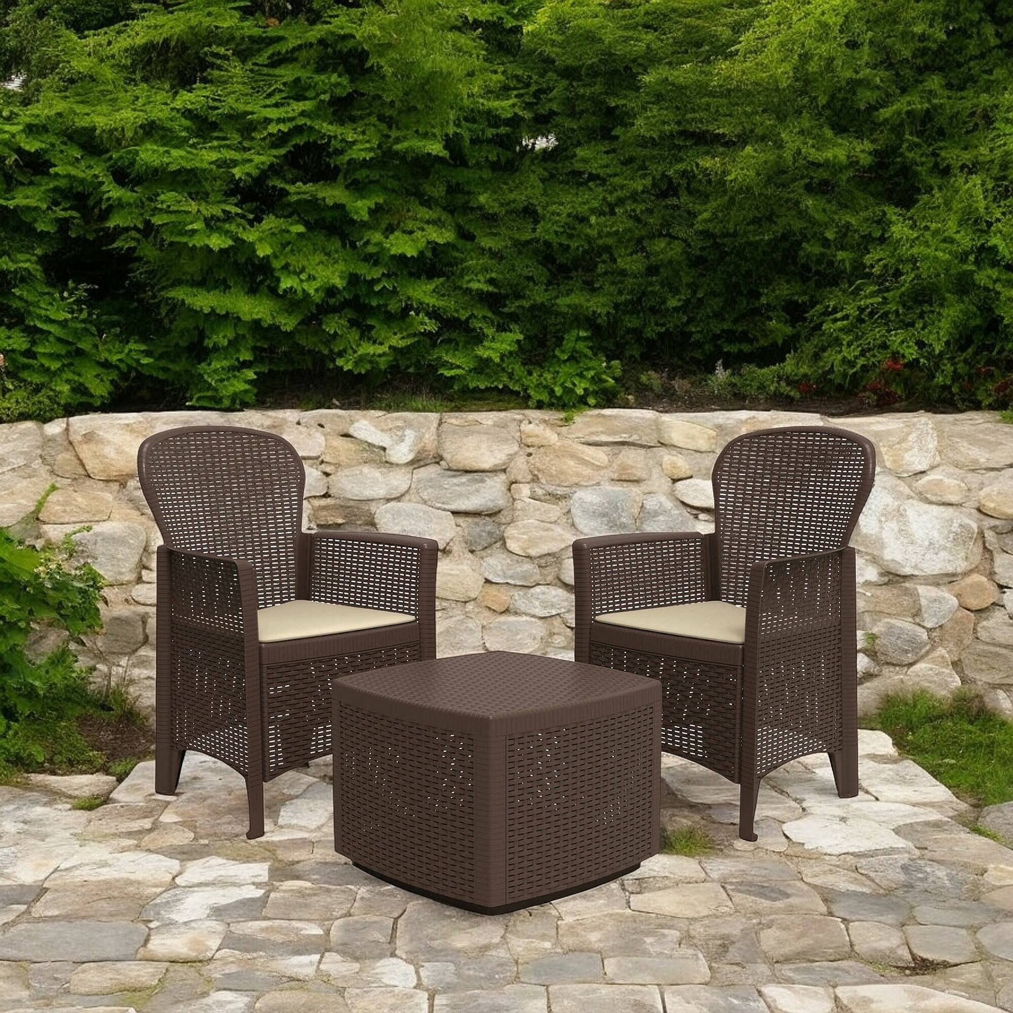 STRUCTURE ET UTILISATION - Article formé par un élégant ensemble d'extérieur pour deux personnes, composé de deux chaises avec dossiers et accoudoirs et d'une table conteneur, coussins inclus - Les sièges spacieux et accueillants garantissent détente et confort dans votre propre maison - Le plateau de la table peut être enlevé, le transformant en un contenant intelligent - Le coin salon parfait pour meubler votre espace extérieur ou intérieur, grâce à la composition en plastique renforcé avec un effet rotin qui rehausse son style - Parfait pour les brunchs et apéritifs sur la terrasse, la véranda, le jardin ou pour se détendre au bord de la piscine.