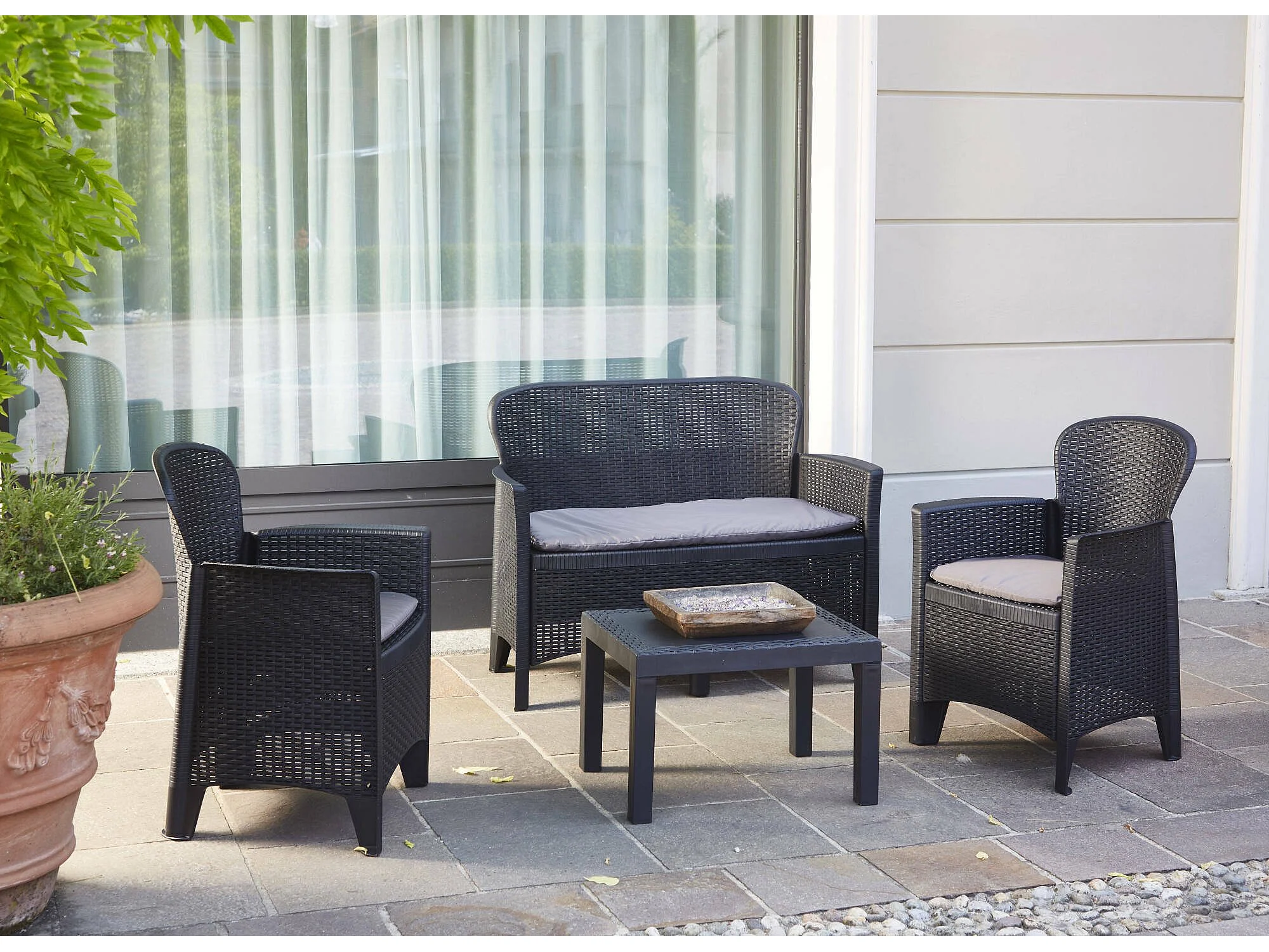 Set salon d'extérieur Debois, composé de 2 fauteuils, 1 canapé et 1 table basse, 100% Made in Italy, Anthracite