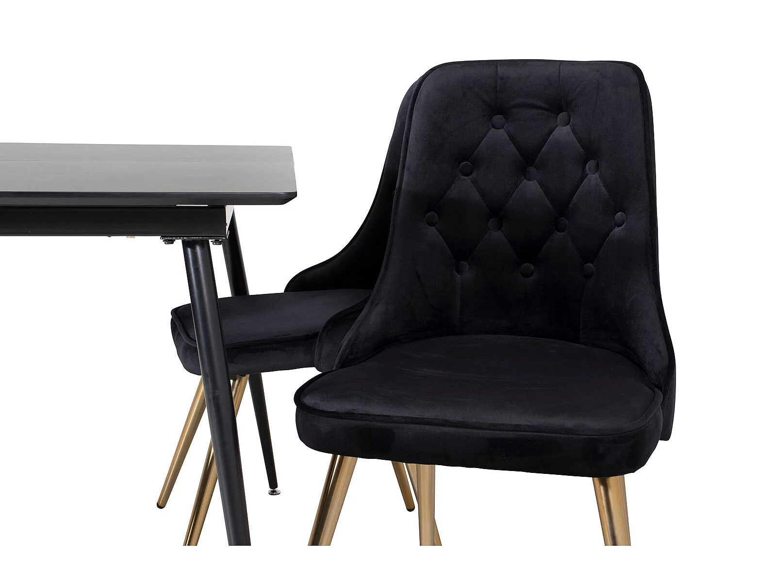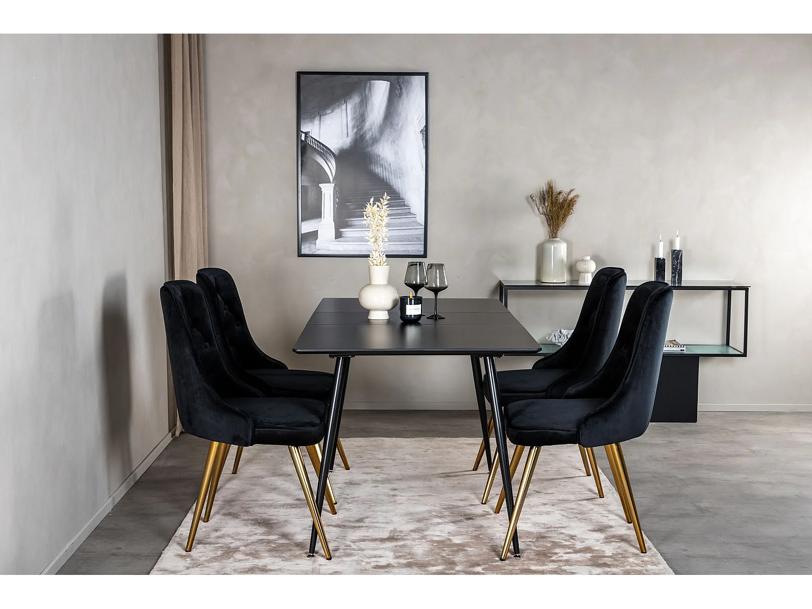 SilarBLExt ensemble table, table extensible longueur cm120 / 160 noir et 4 Velvet Deluxe chaises Velours noir, laiton décor.