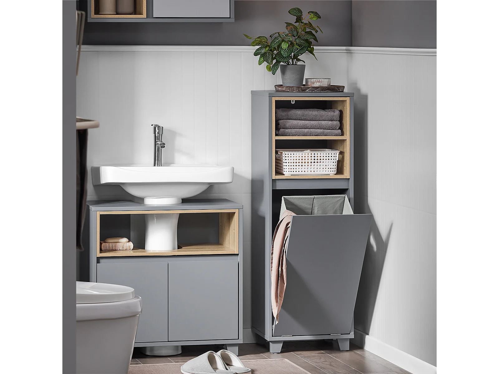 SoBuy BZR146-DG Meuble Bas de Salle de Bain, Meuble Demi-Colonne sur Pied, Placard WC Étroit avec 1 Panier à Linge