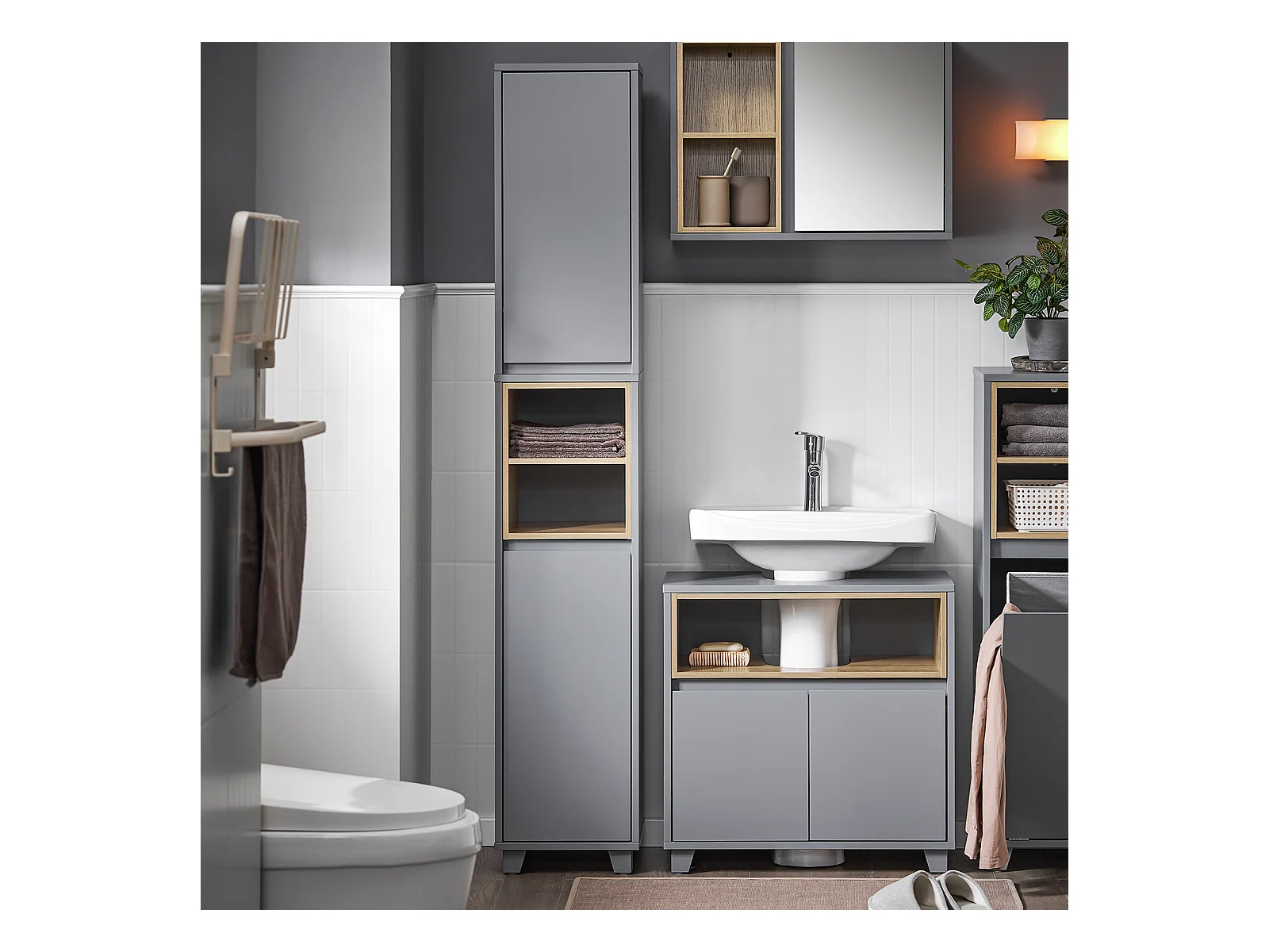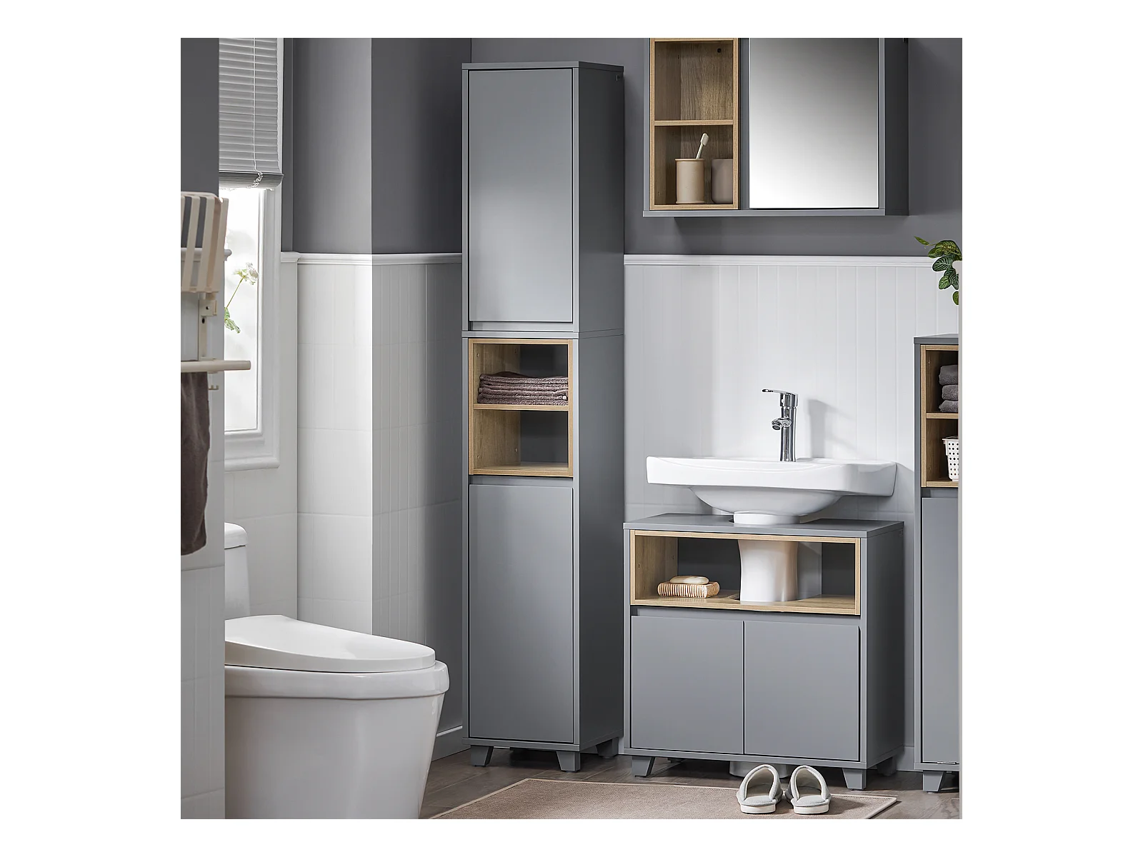 Armoire de de salle de bain avec miroir meuble rangement avec 3 etagères et 2 portes 56,5 x 13 x 58,5 cm gris