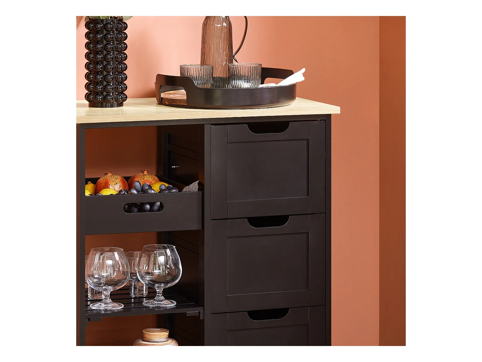 Servierwagen avec table rabattable, 3 tiroirs, porte-serviette, roulettes et pieds en bois interchangeables (112x40(70)x94 cm)