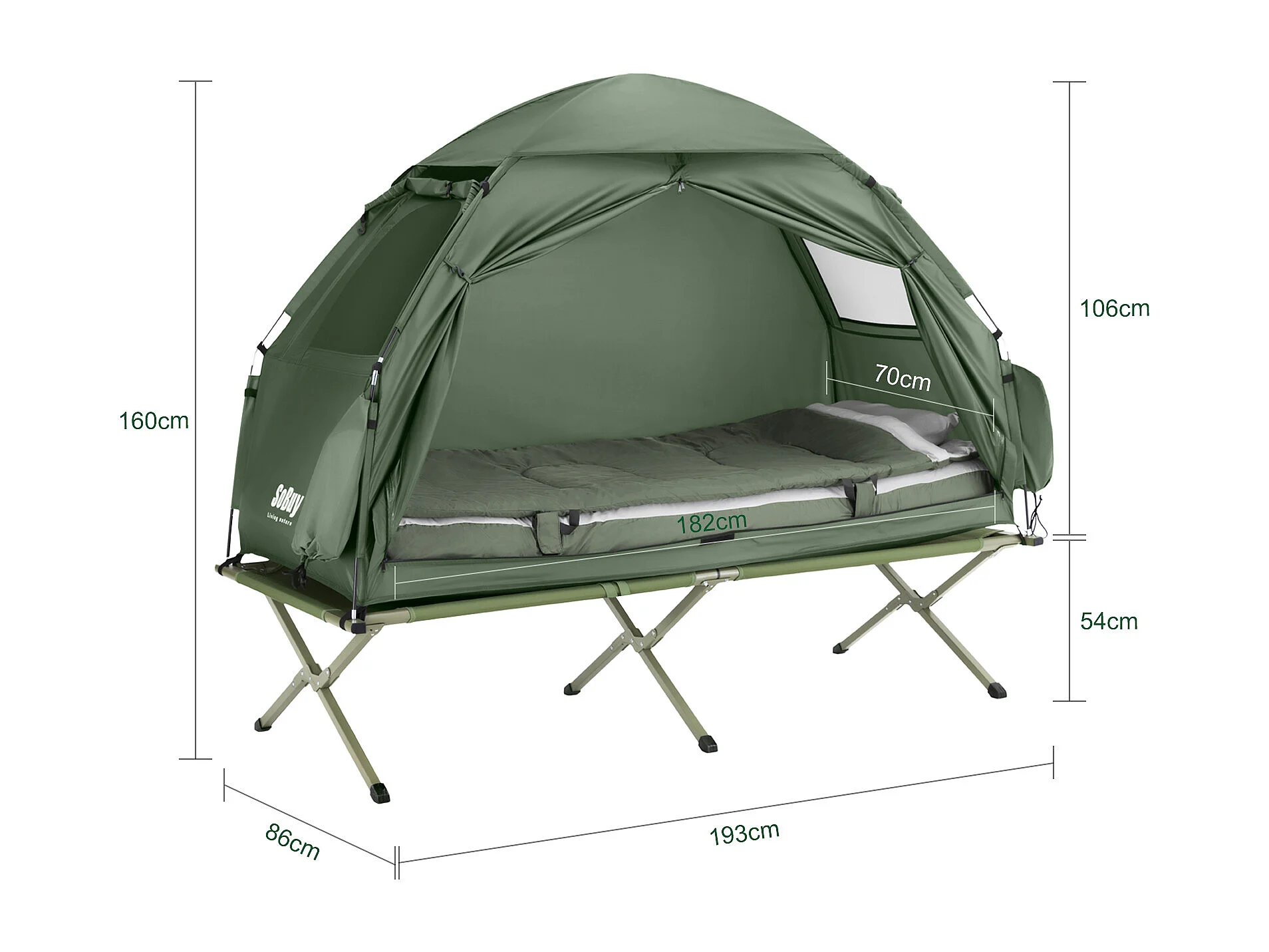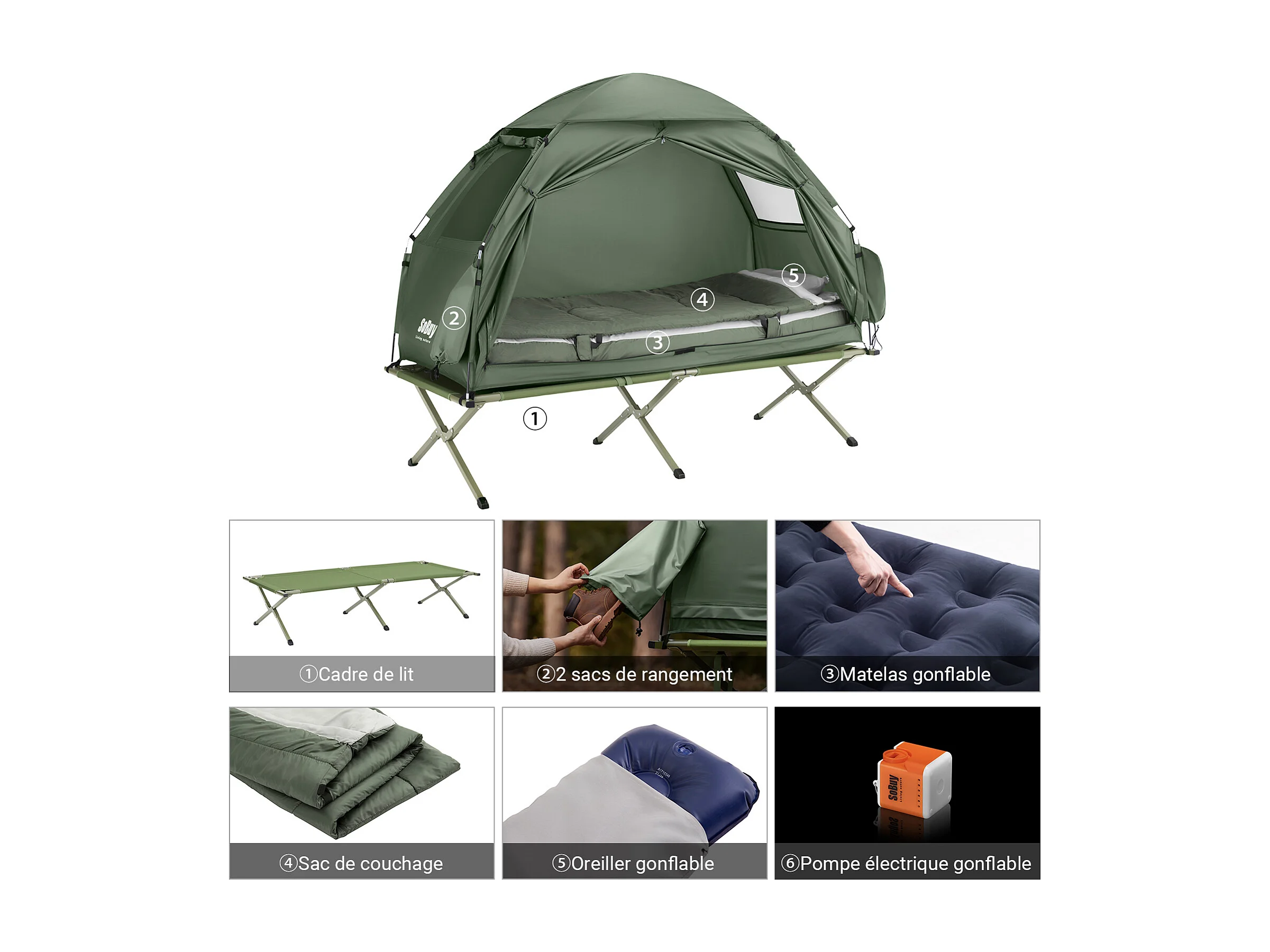 SoBuy Tente de Camping 4 en 1 Pliable Lit Surélevé, Toit, Sac de Couchage, Matelas Gonflable -1 Personne - Idéal pour Randonnée, Festival et Plein Air, OGS32-GR