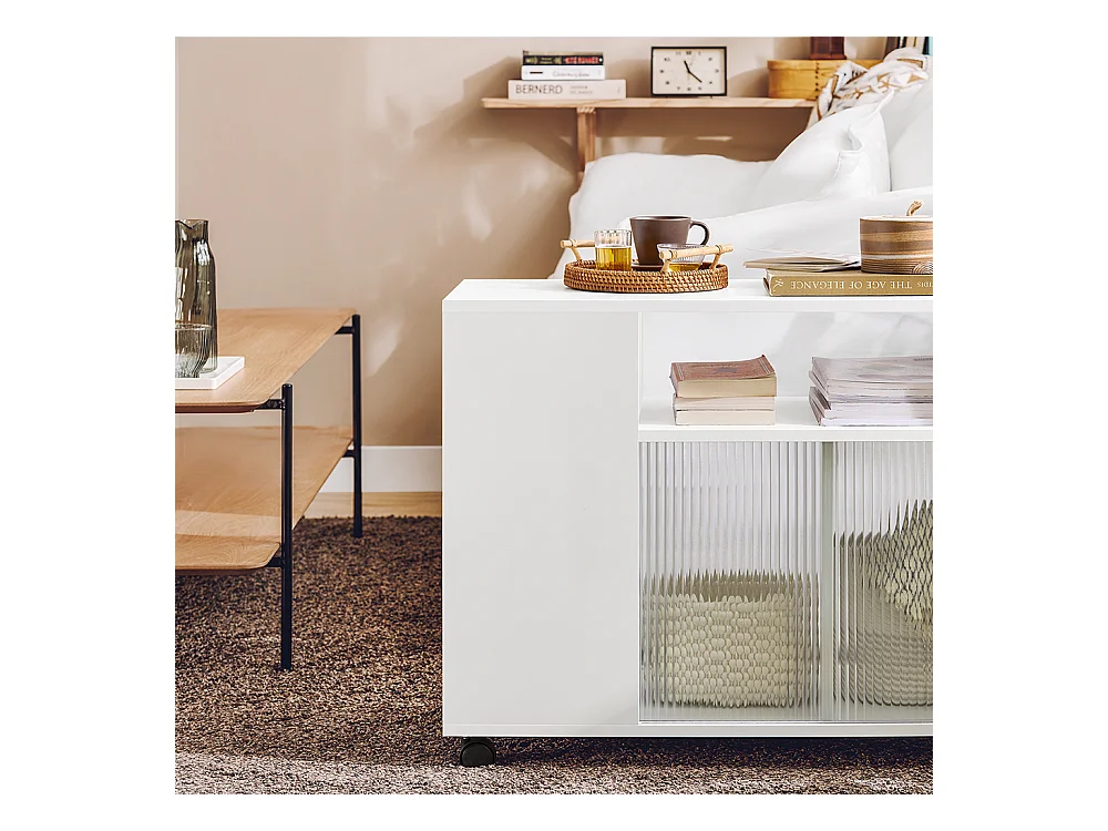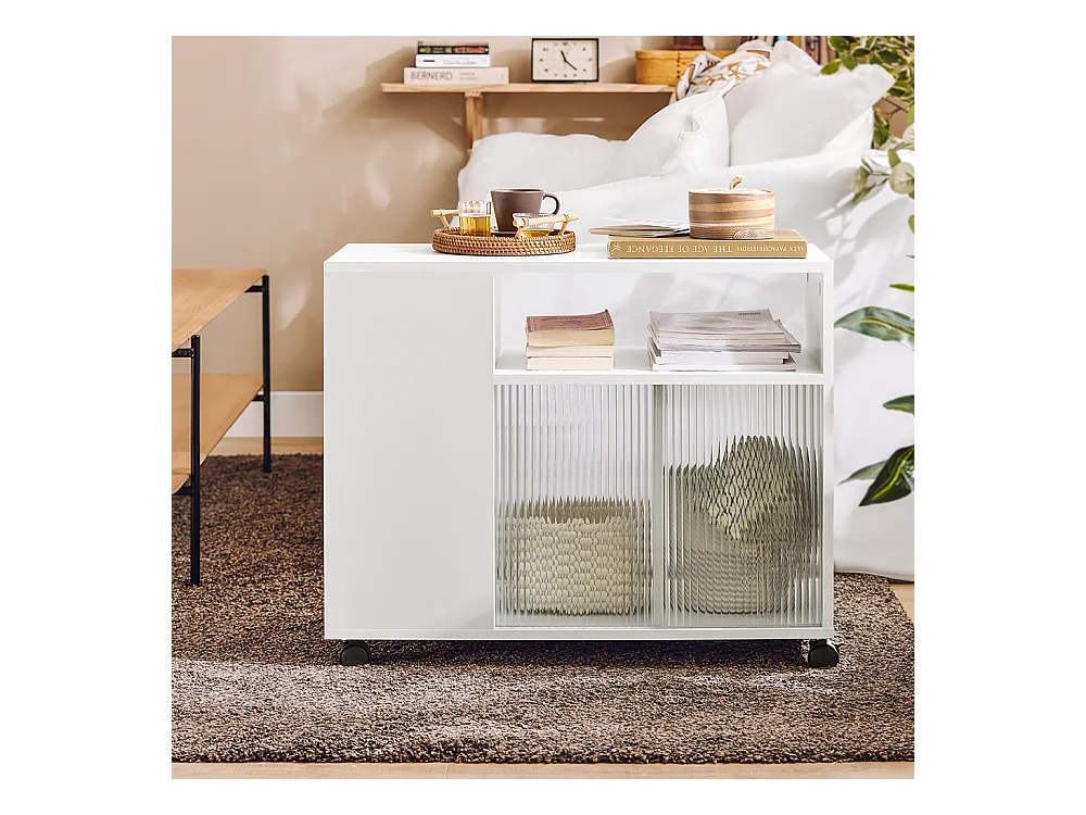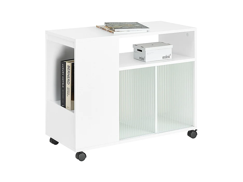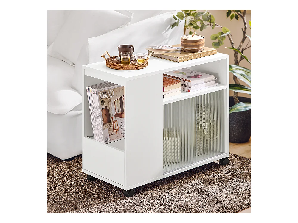 SoBuy FBT142-W Table d'Appoint, Bout de Canapé de Salon, à roulettes, Chariot de Bureau avec tiroir et Portes en Verre