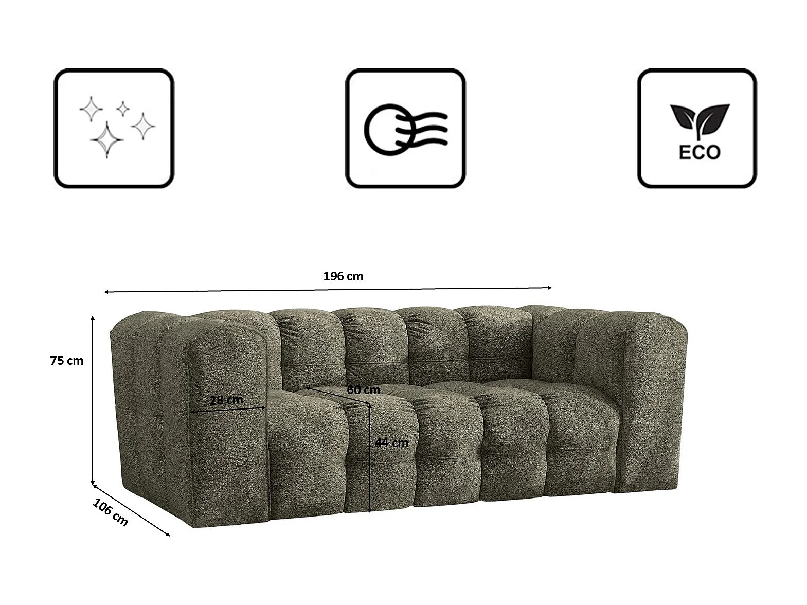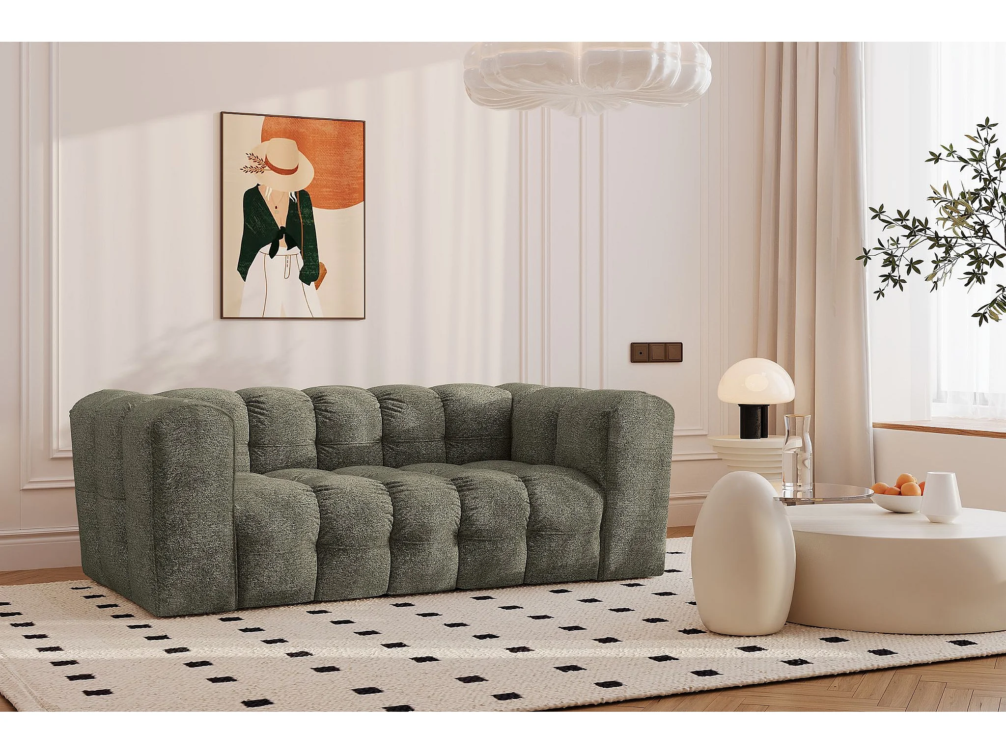 Canapé 2 places en tissu bouclette avec coussins vert