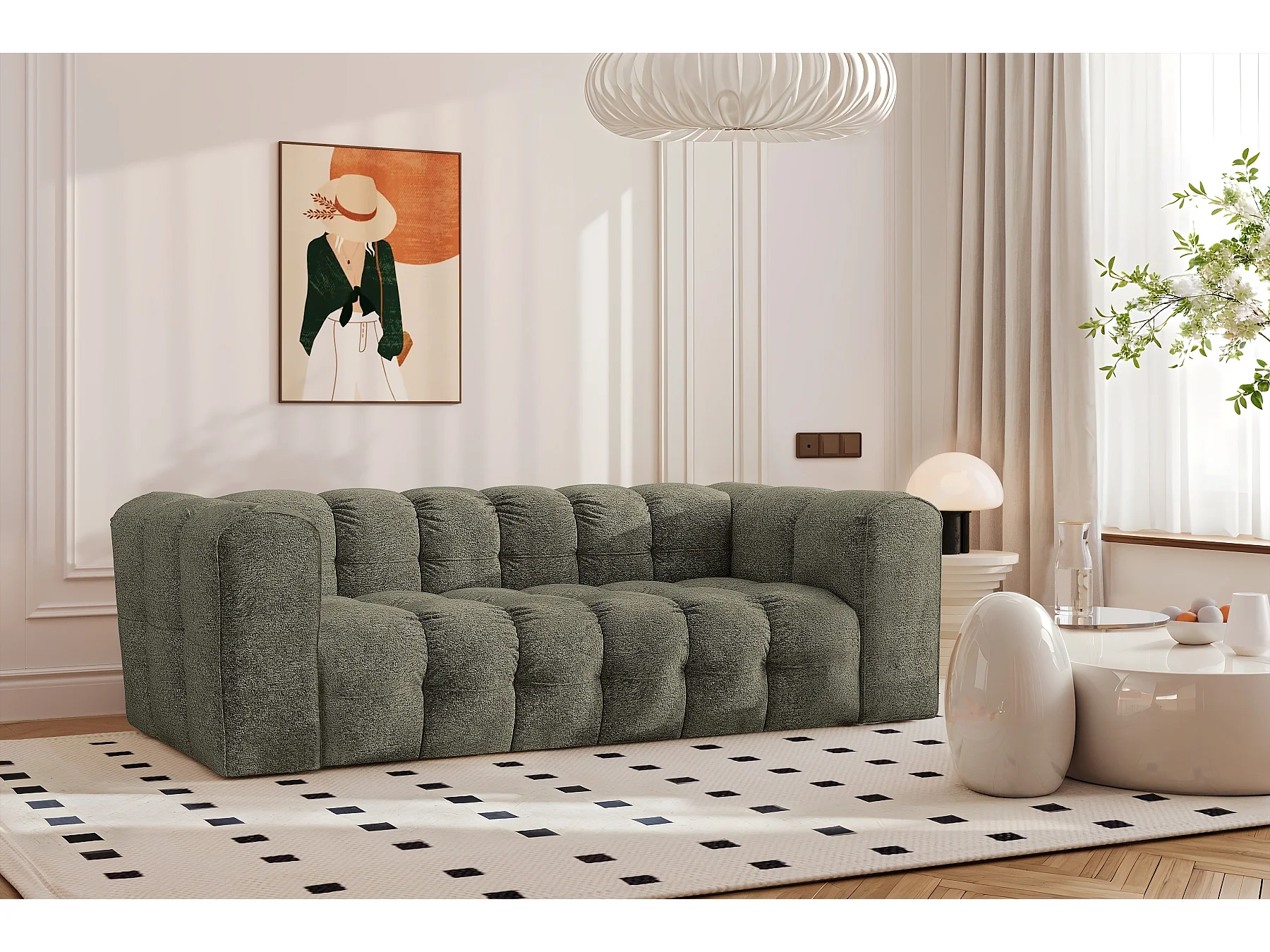 Canapé 3 places en tissu bouclette avec coussins vert