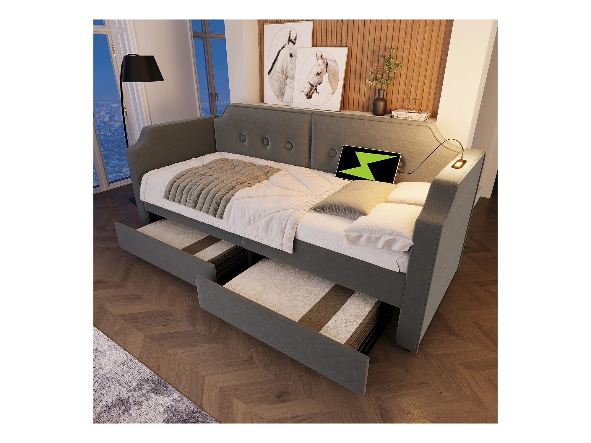 Canapé-lit 90x200 cm avec tiroirs, grand espace de rangement et port USB, en bois, gris (192.3x110x100 cm)