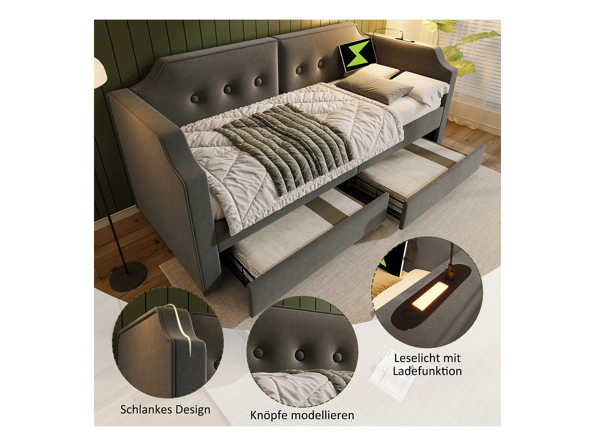 Sofabett 90x200 cm avec USB Type-C et lampe de lecture, lit avec 2 tiroirs de rangement, cadre en velours gris, sommier en bois (217x99x76 cm)