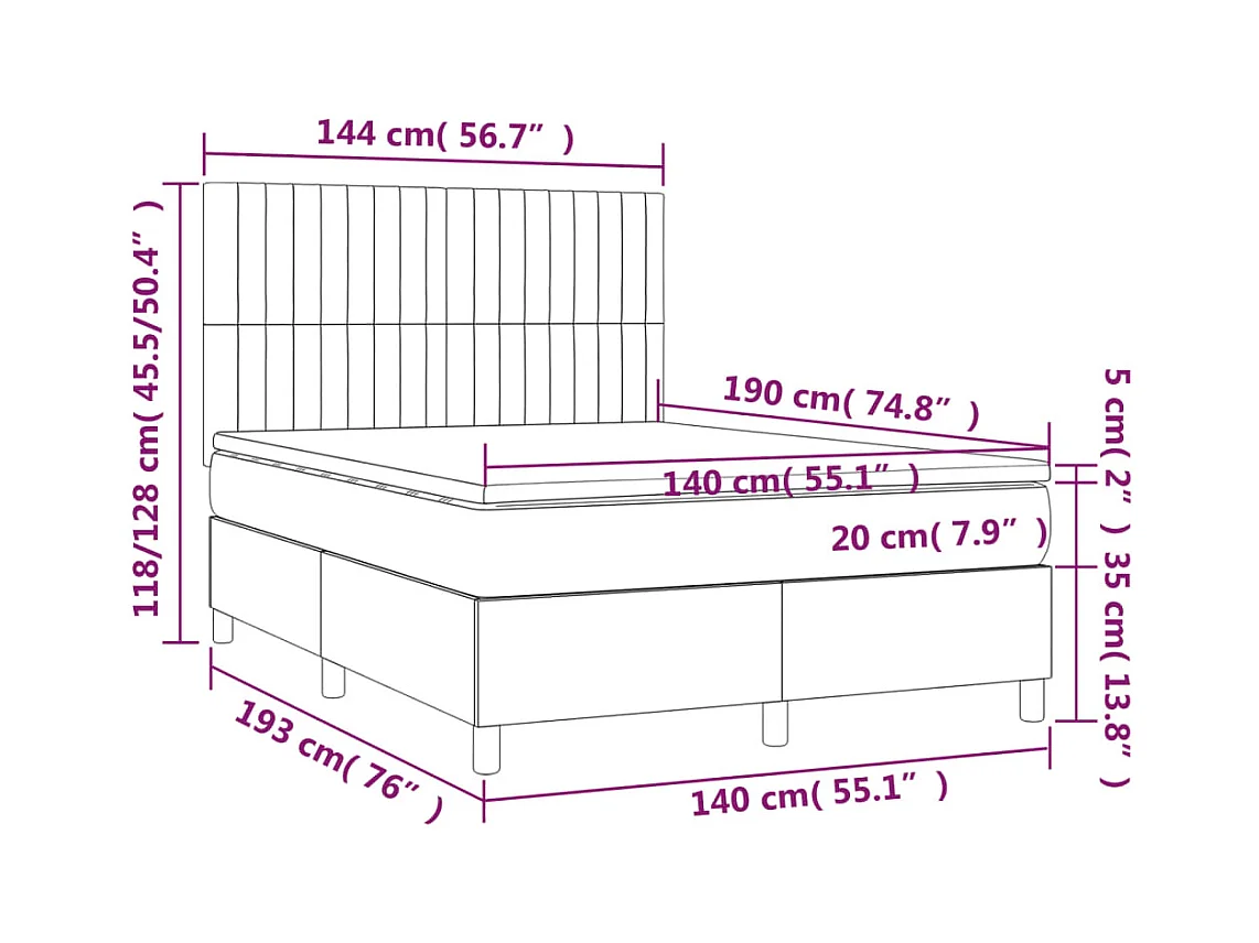 Sommier tapissier et matelas et LED Gris clair 140x190 cm Tissu