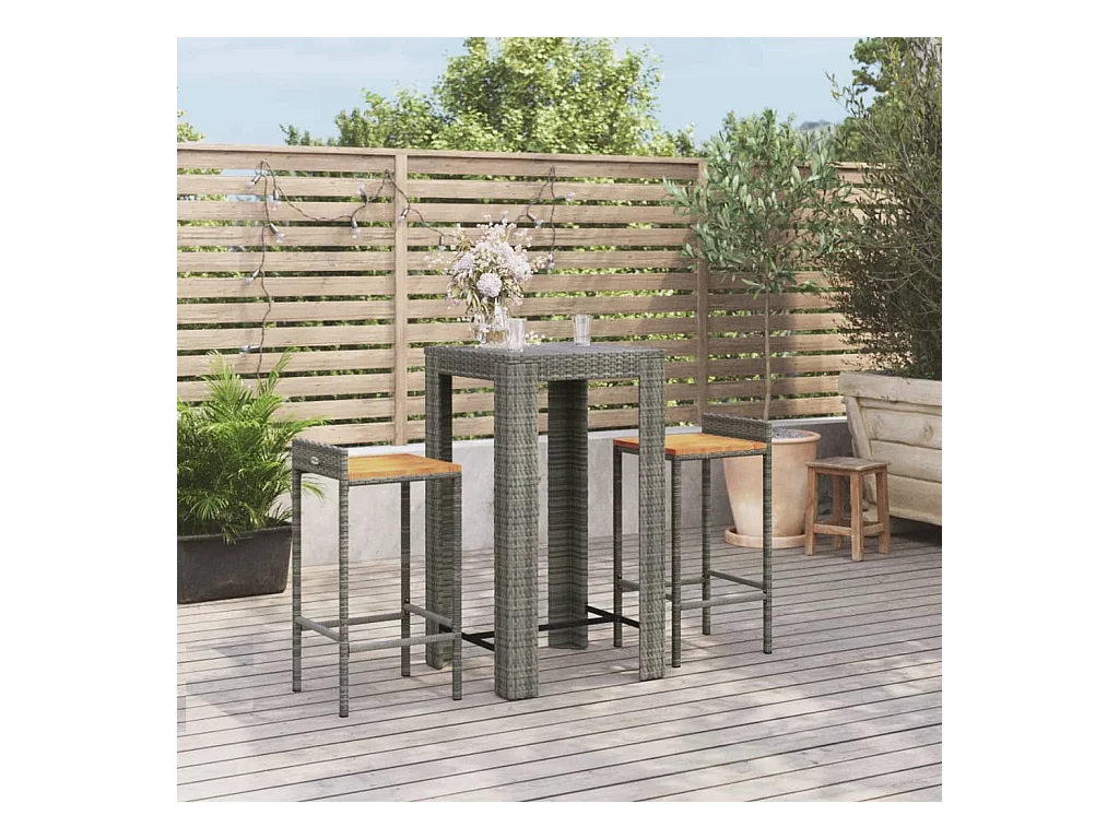 Arvind Ensemble de bar jardin 3 pcs gris poly rotin/bois massif acacia