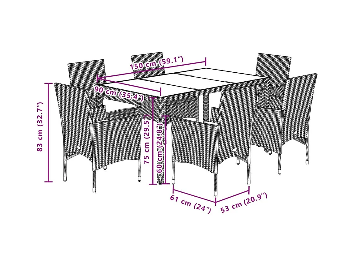 Bakersfield Ensemble à manger de jardin et coussins 7 pcs gris rotin verre