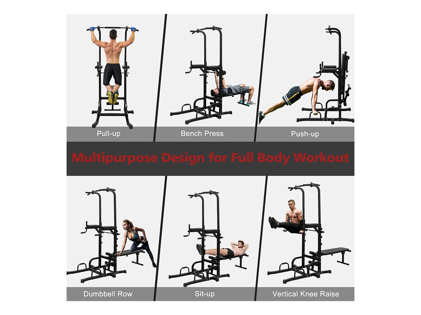 Station de fitness multifonction avec banc, barre de traction et barres parallèles, hauteur réglable, acier, noir (224.8x97x207cm)