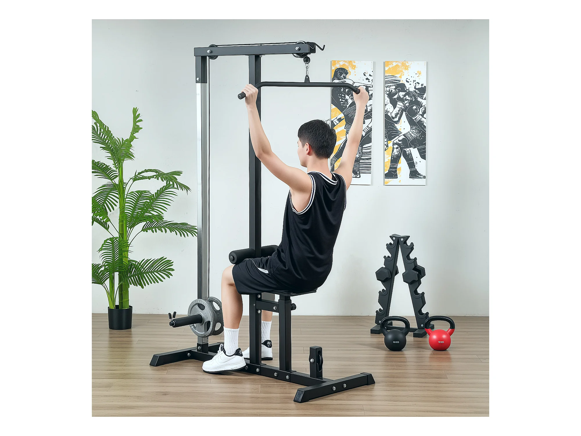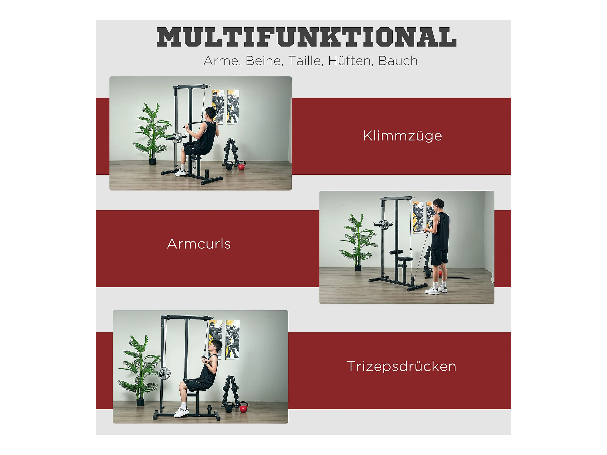 Station de fitness multifonction avec siège réglable et poulie, acier, noir (107x120x190cm)