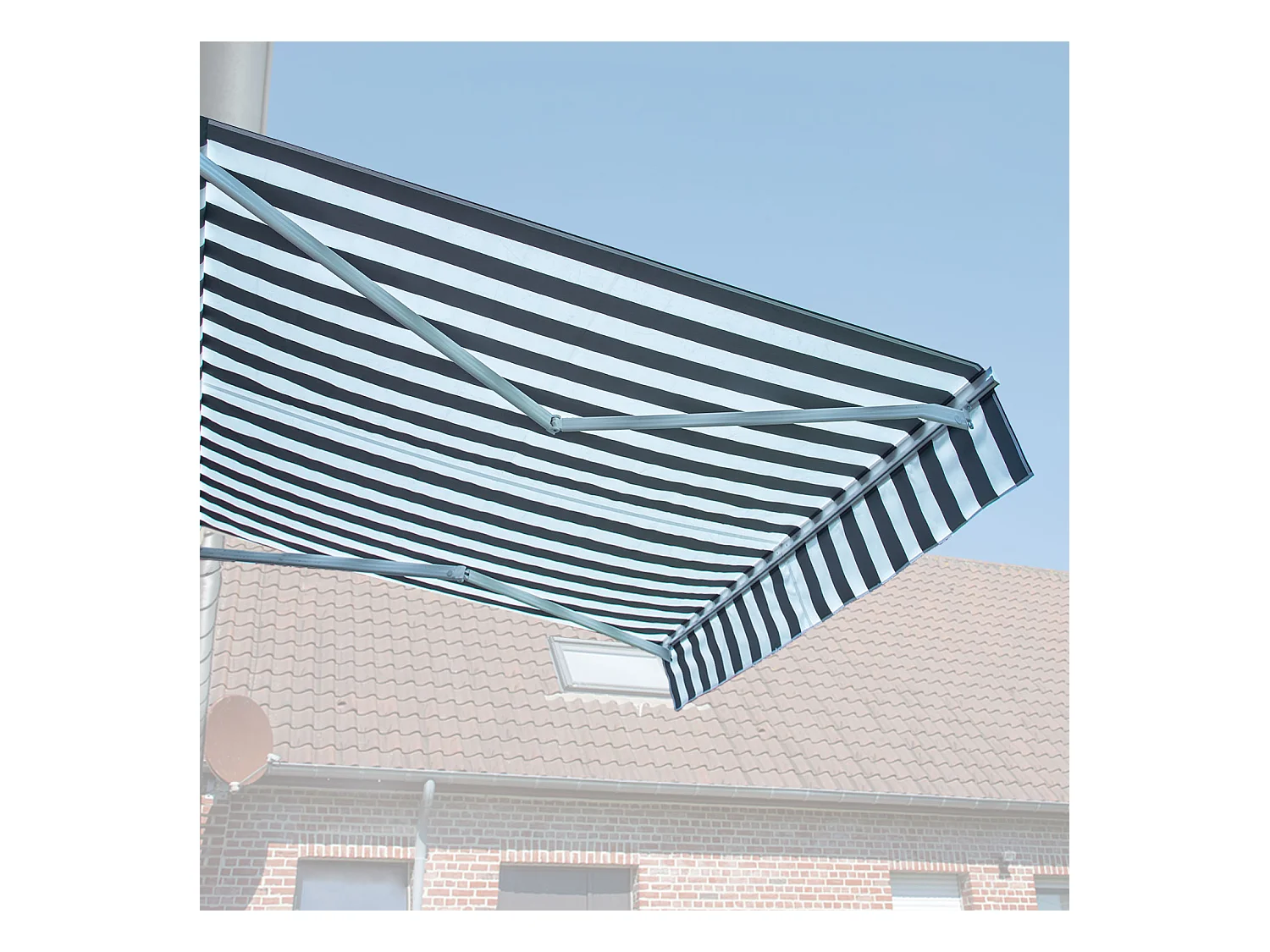 Store banne SAULE 3,5 × 3m avec semi-coffre - Toile rayée blanche/grise et structure blanche - HAPPY GARDEN