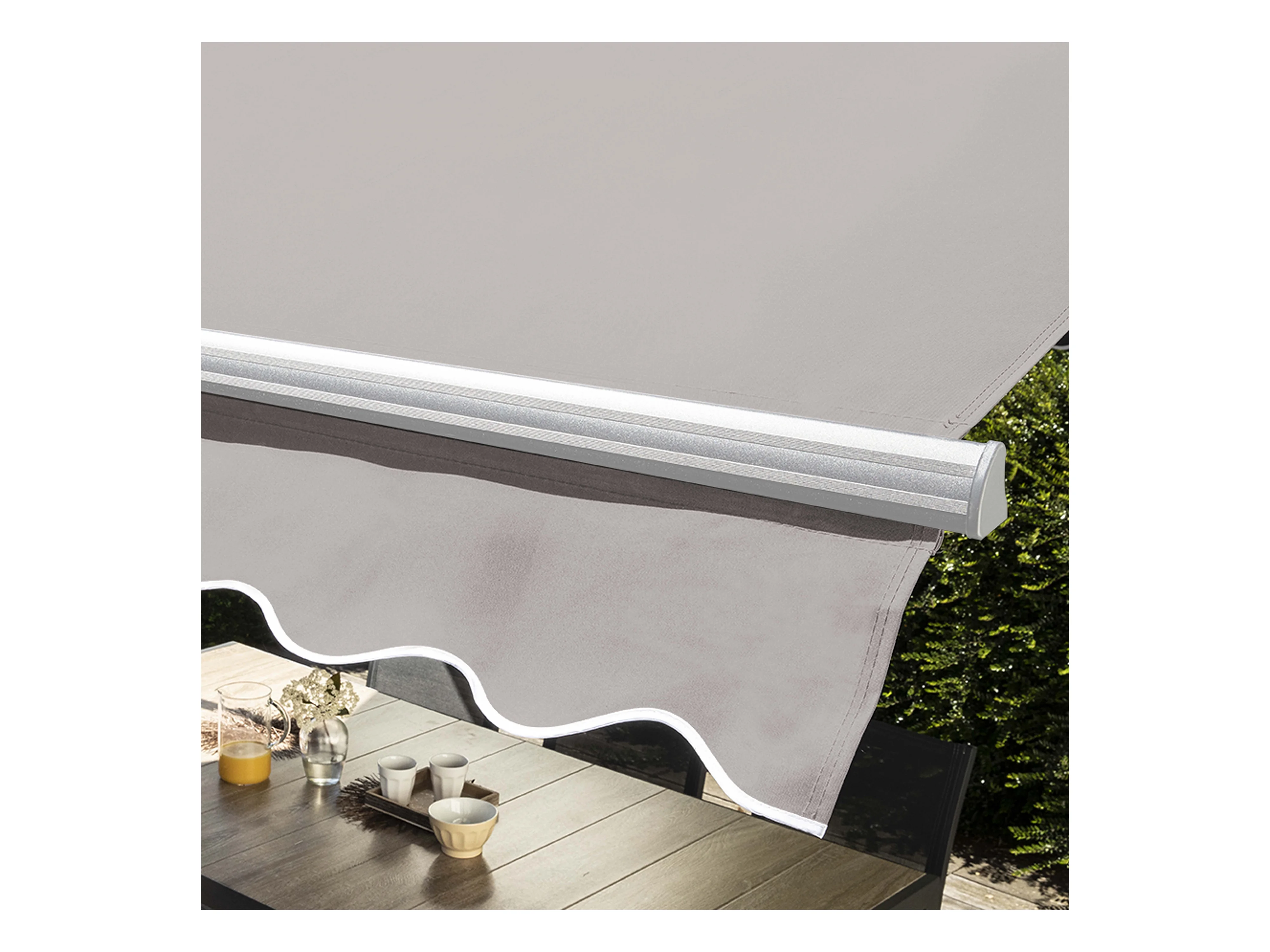 Store banne SAULE 3,95 × 3m avec semi-coffre - Toile rayée blanche/grise et structure blanche - HAPPY GARDEN