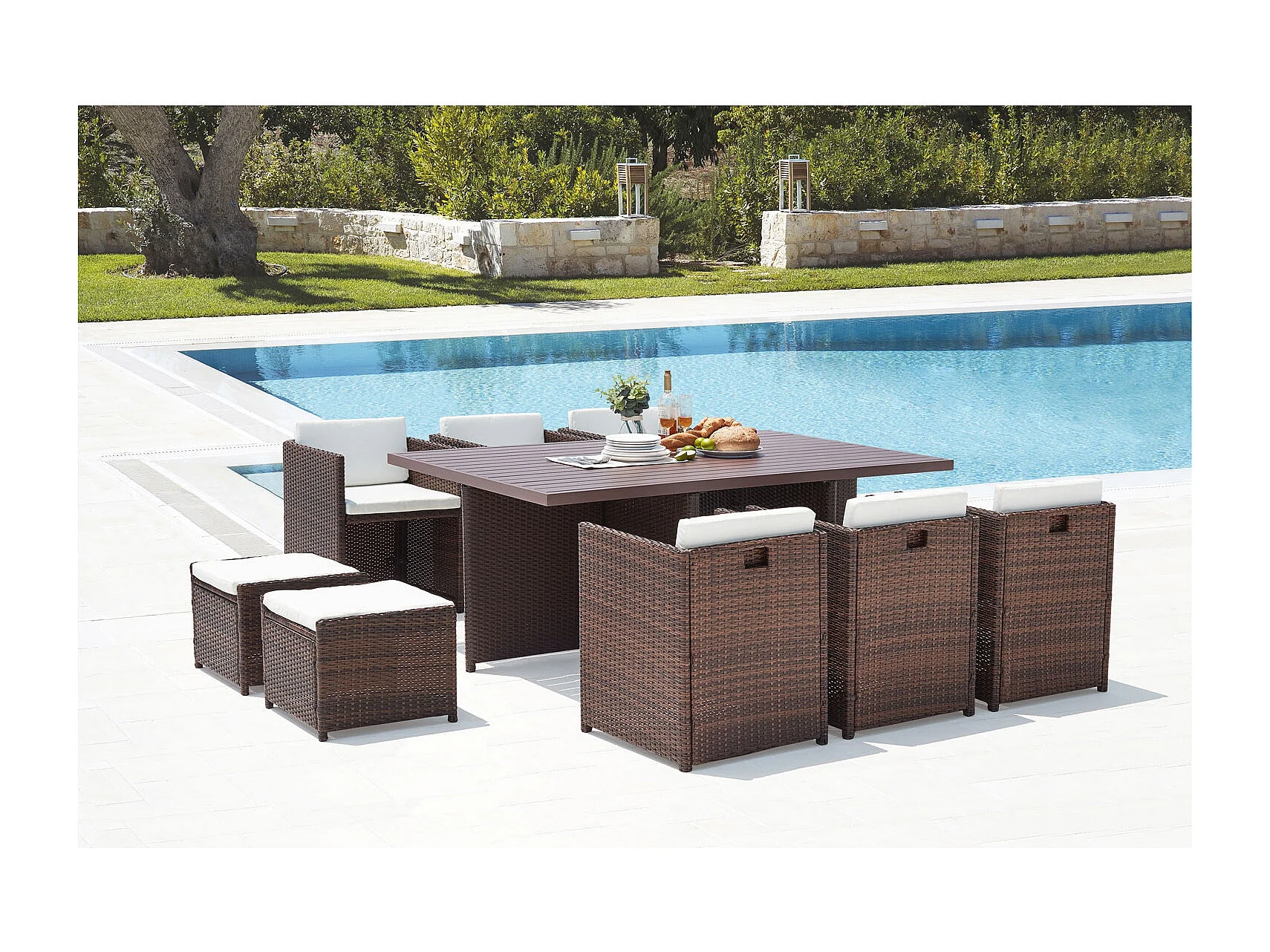 Table et chaise 10 places encastrables alu résine marron-blanc SUNSET