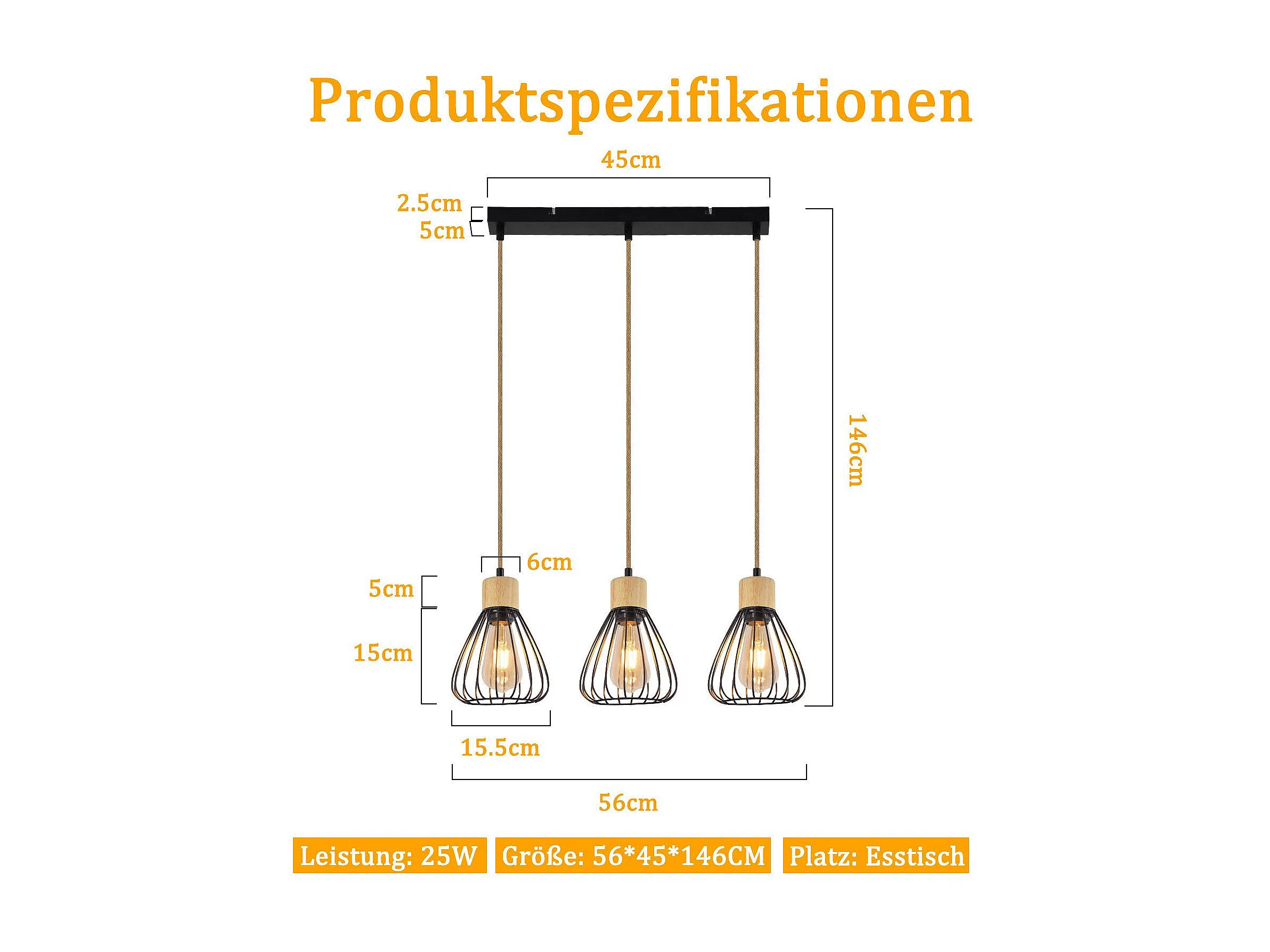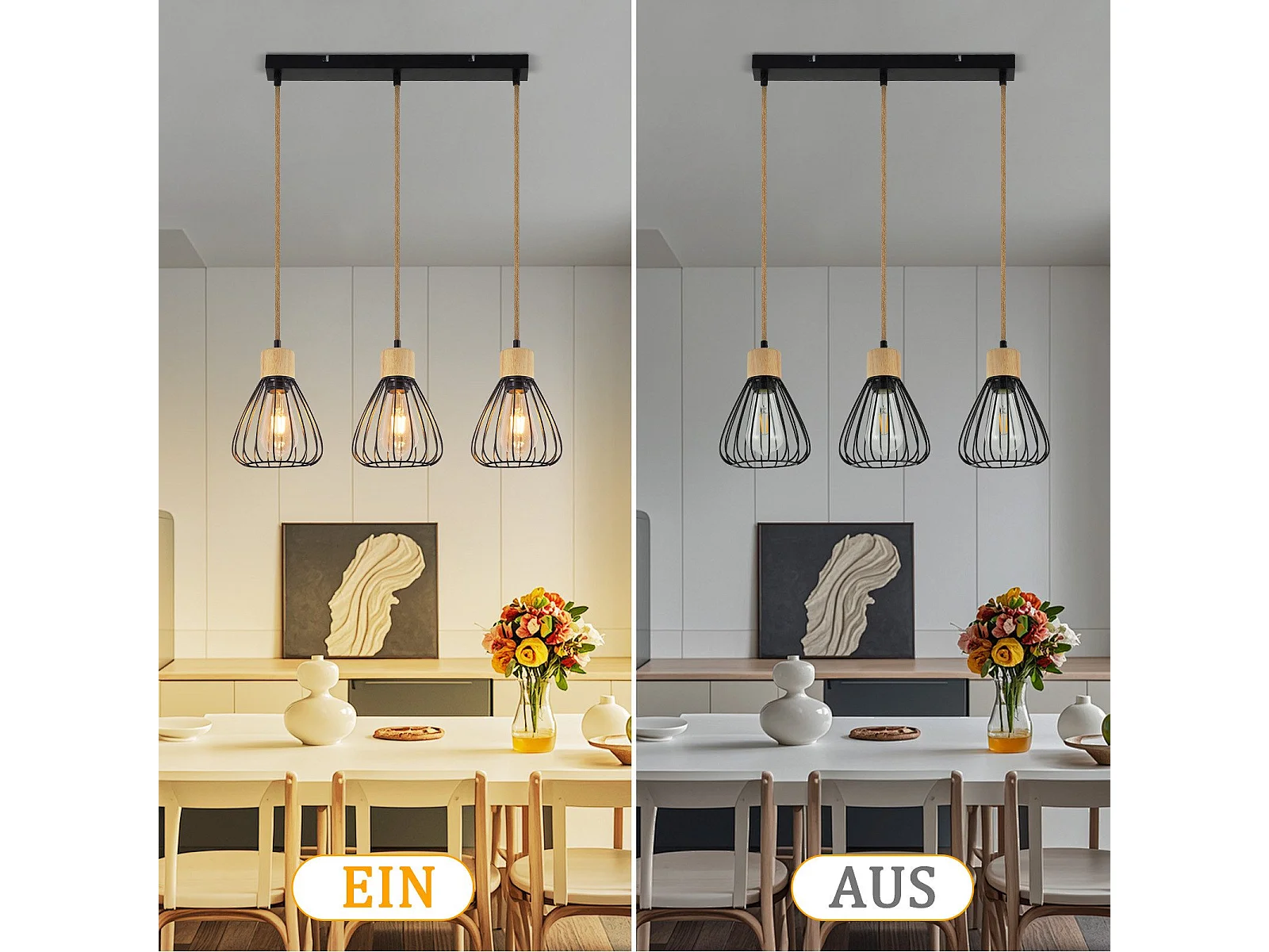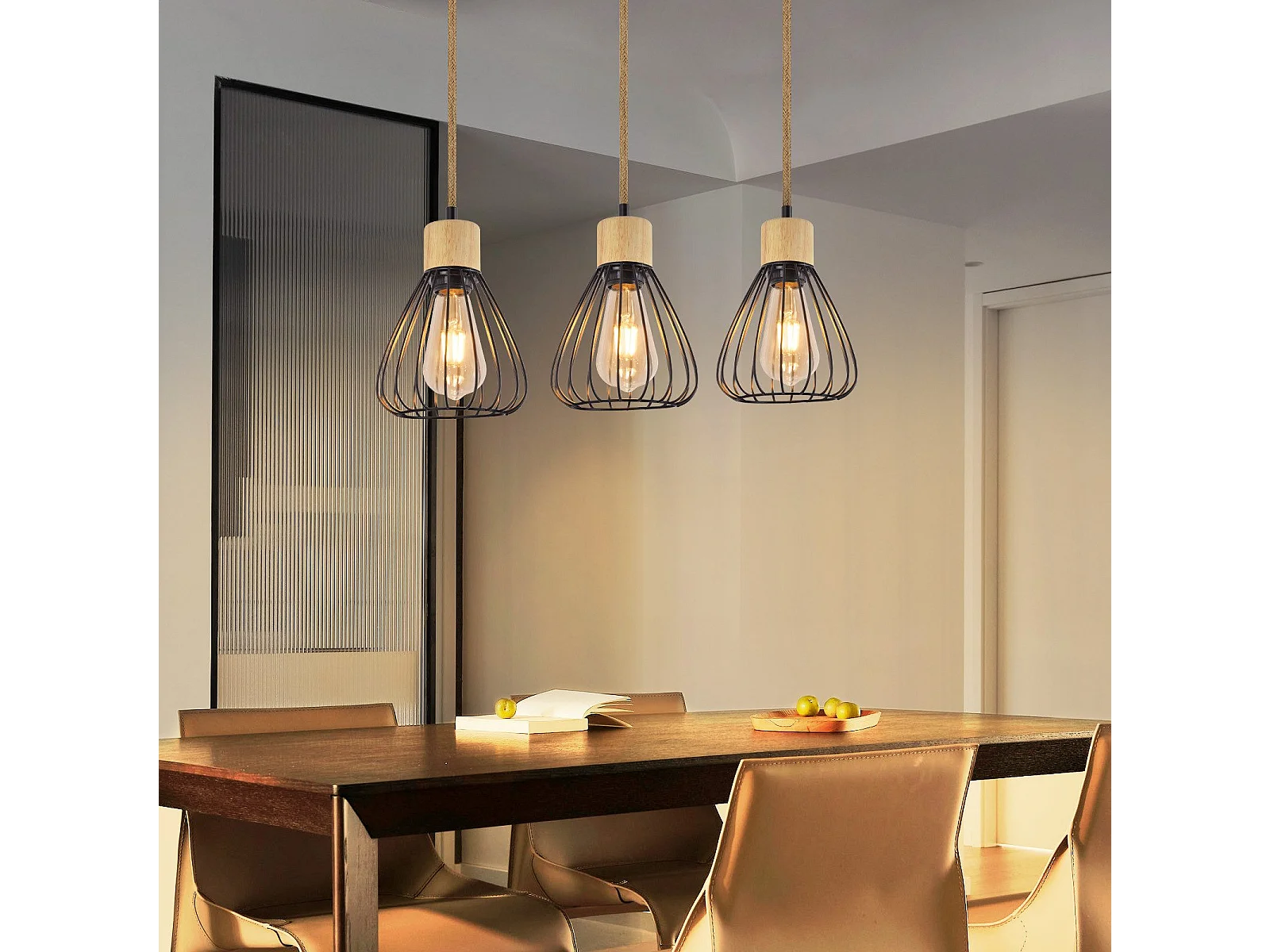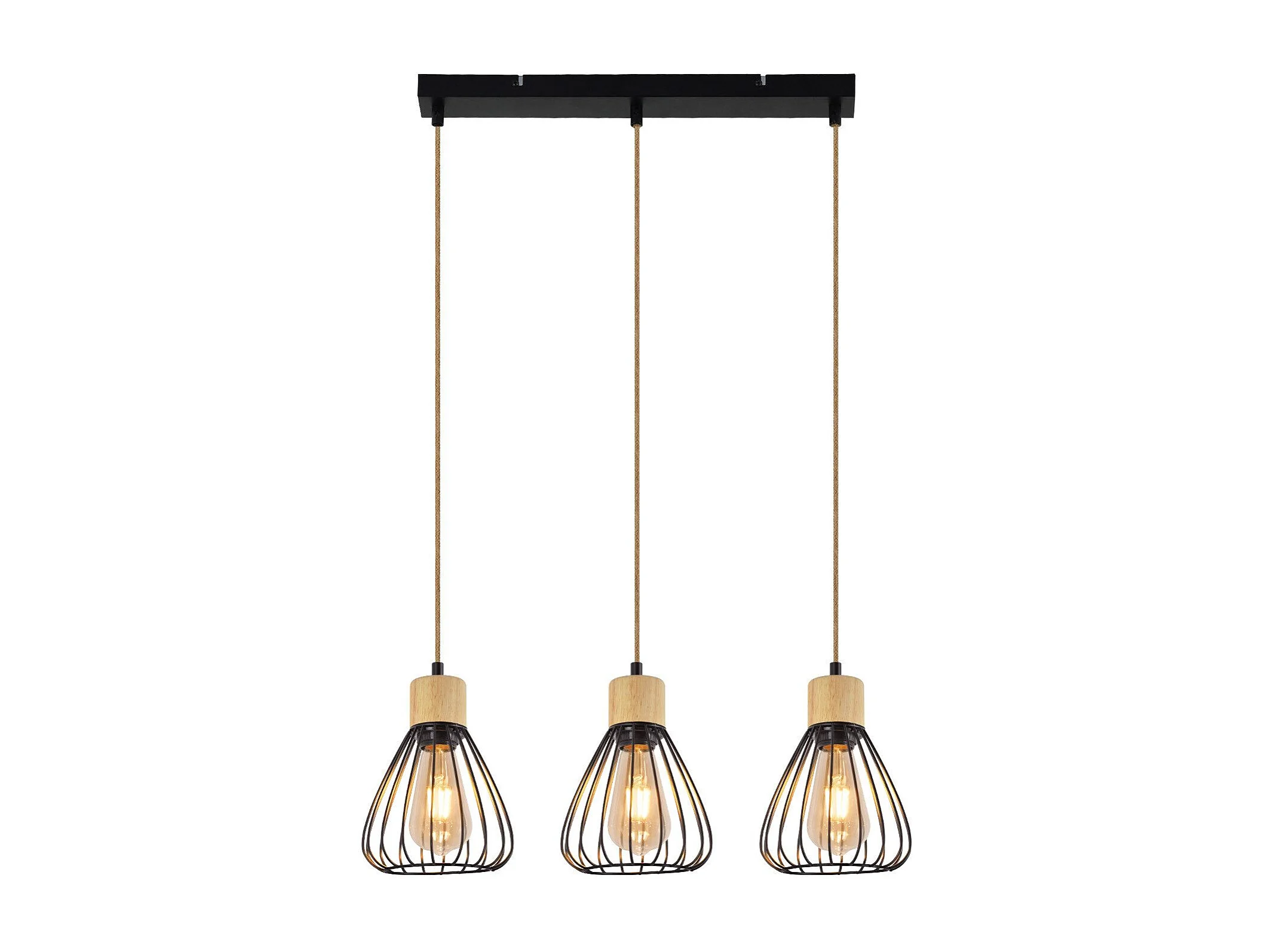 Suspension NETTLIFE Lampe suspension vintage pour salon industrielle rétro en bois et corde de chanvre en métal noir 3 flammes E27