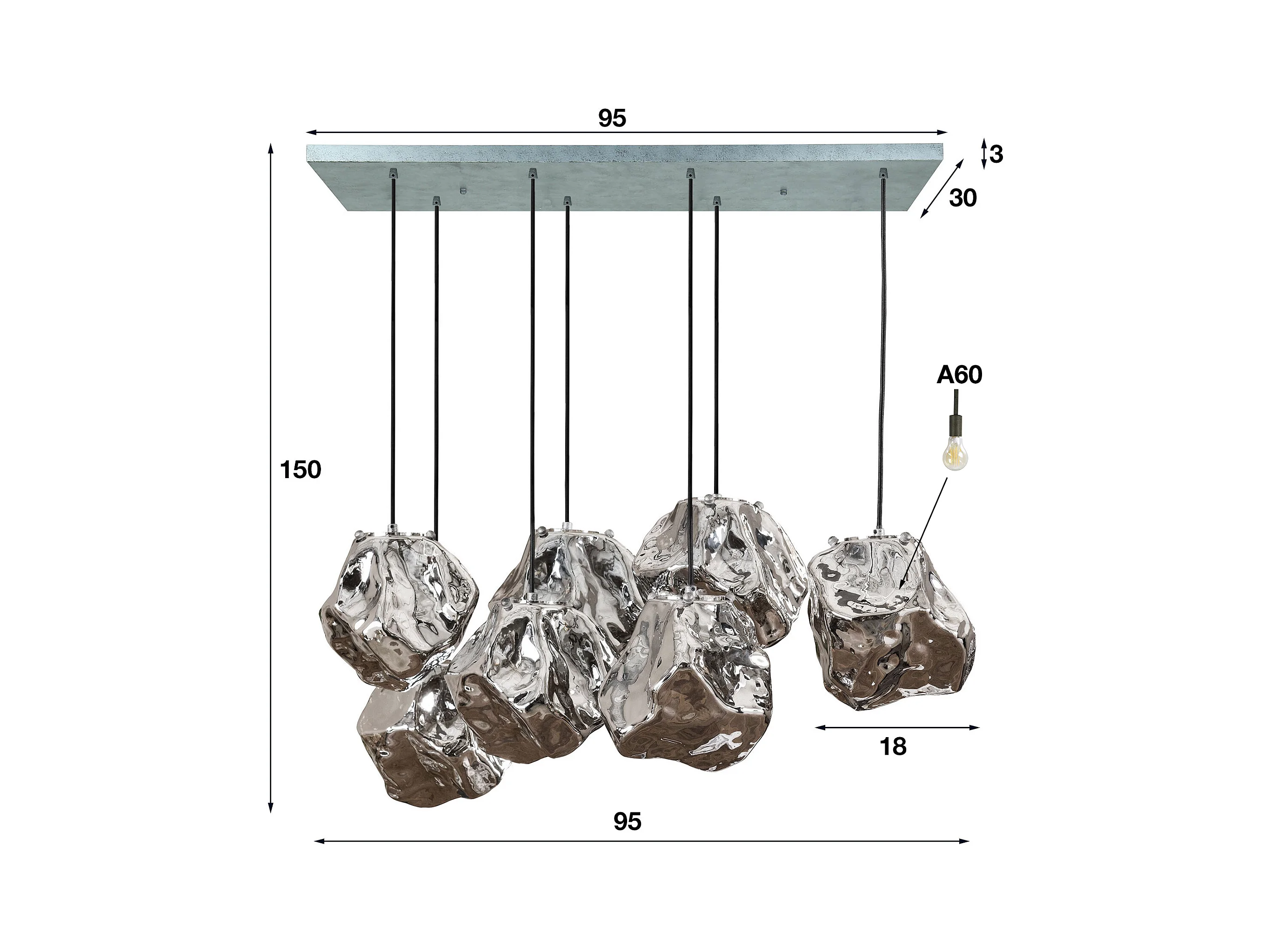 Suspension Rock Chromée - 3 Lampes - Industrielle - 50x50x150