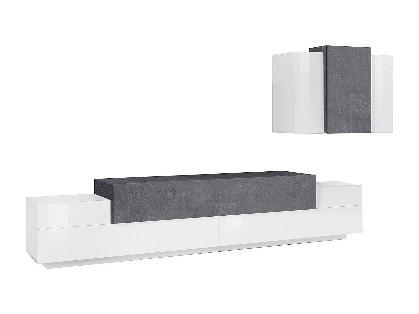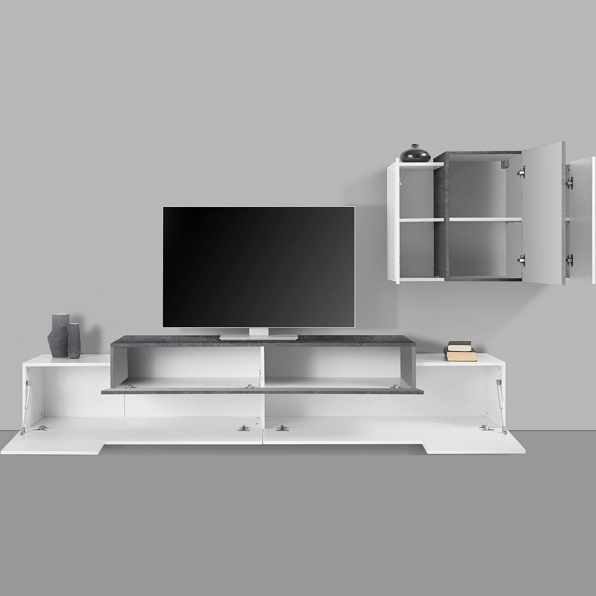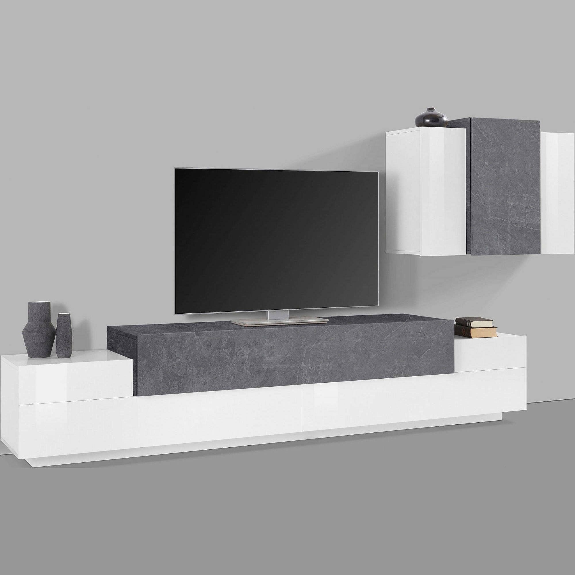Système mural Djazir, ensemble de salon meuble TV, meuble de salon polyvalent, 100% Made in Italy, 280x45h121 cm, blanc brillant et béton