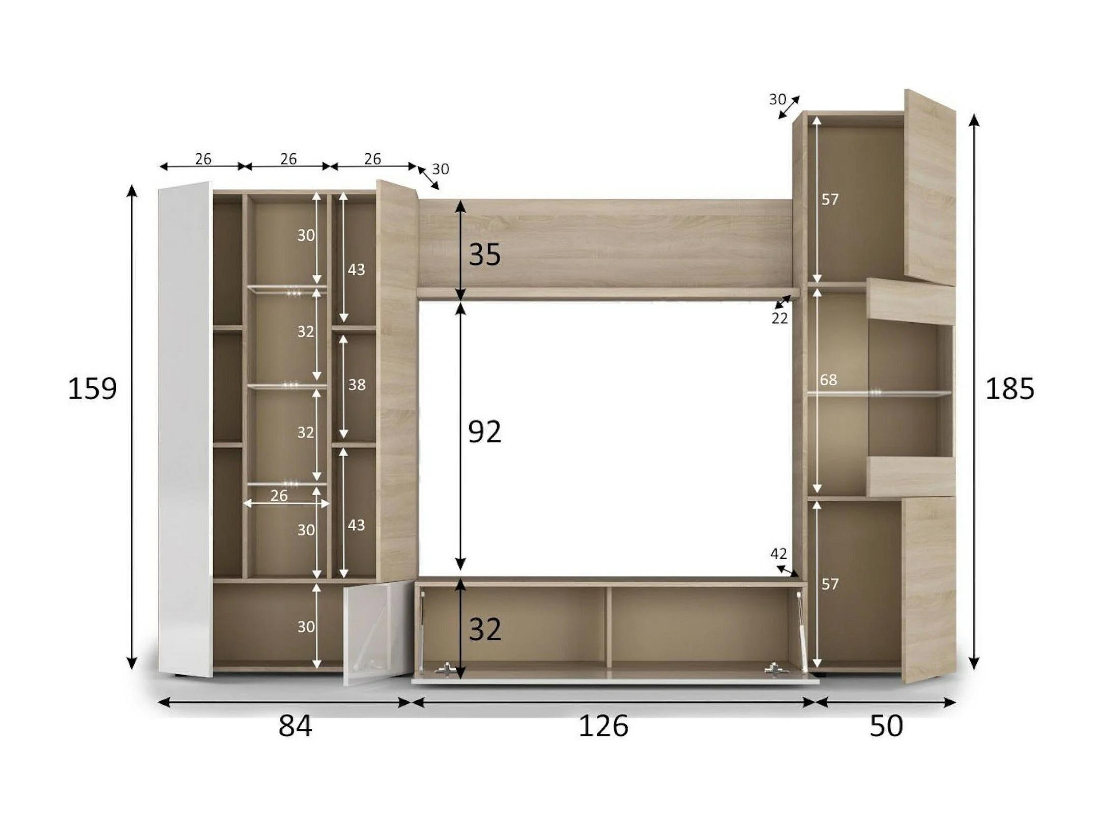 Système mural Dmaj, Meuble TV modulaire pour salon, Composition de salon avec éléments muraux et vitrines et lumière LED, 260x42h185 cm, Chêne et Blanc