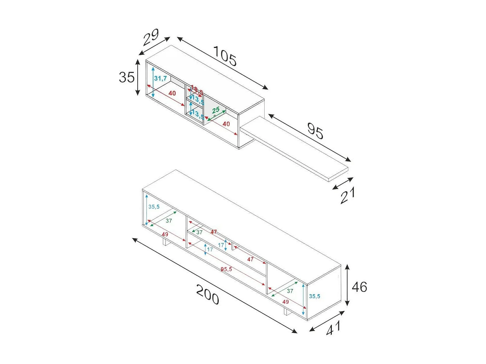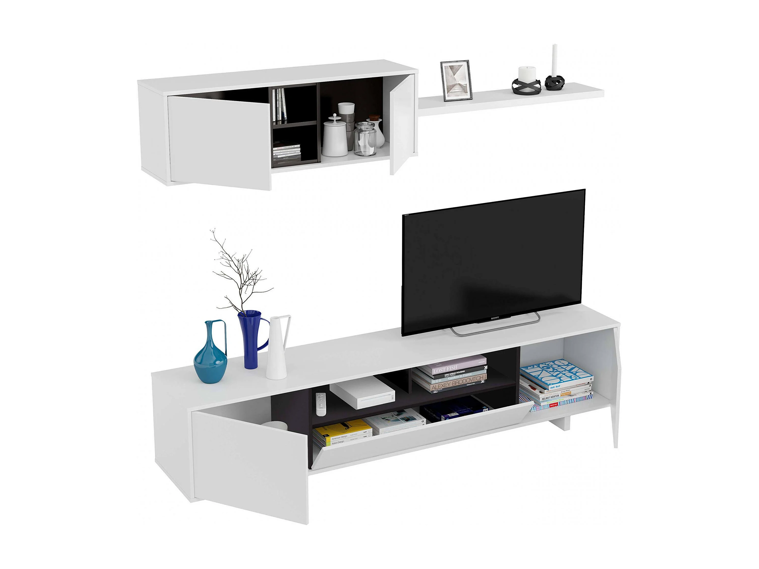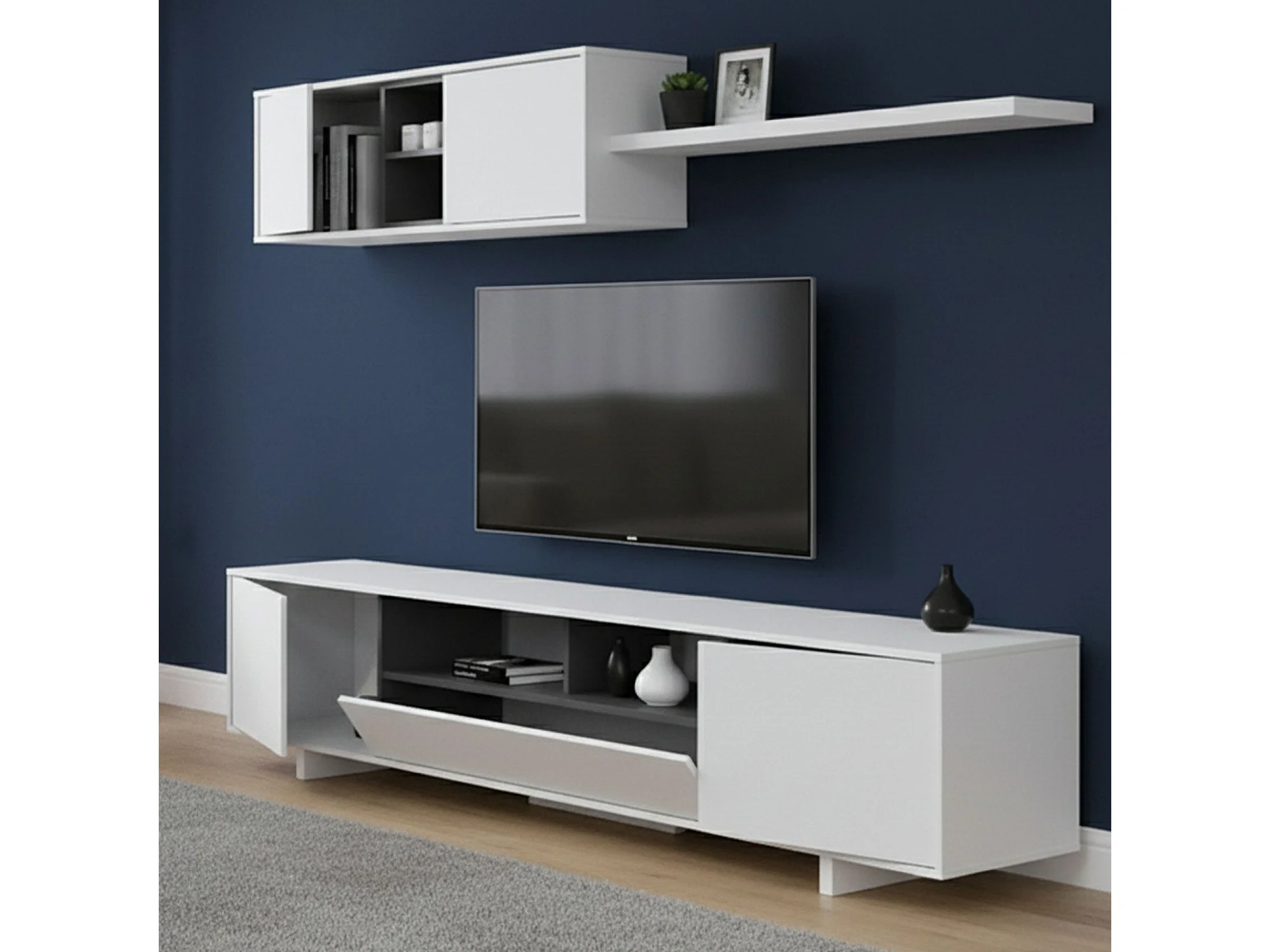 Système mural Hartford, meuble TV, composition d'ensemble de salon, ensemble de salon avec unité murale, 200x41h46 cm, blanc brillant