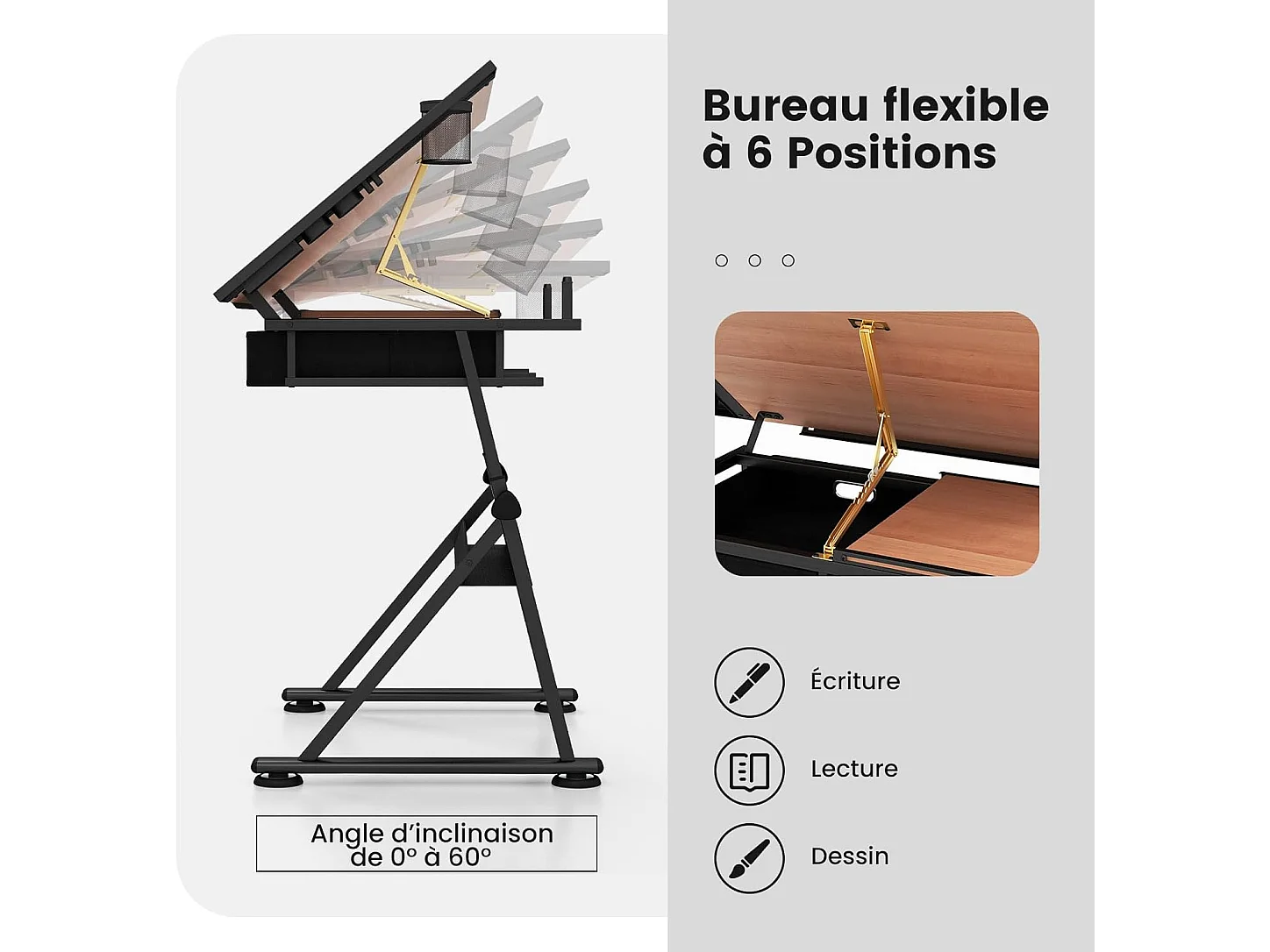 Table à Dessin Inclinable, Bureau à Dessin avec Tabouret, 2 Grands Tiroirs, Porte-Stylo, Hauteur Réglable, pour Peinture, 61,5 x 119 x (73,5-98) cm