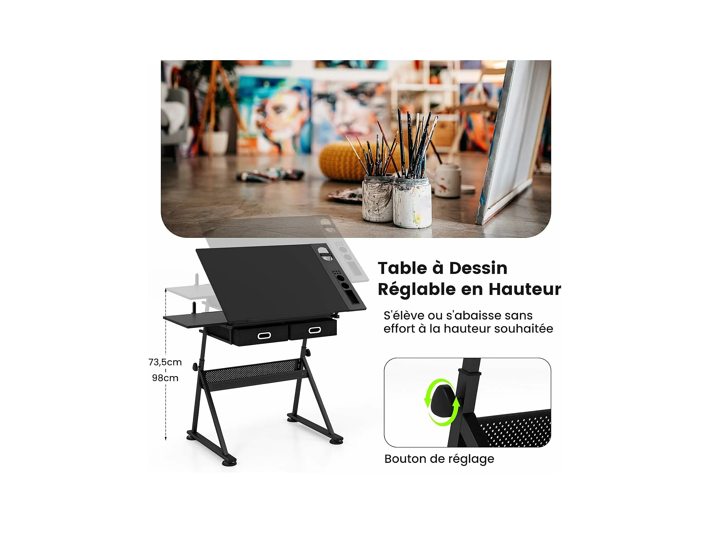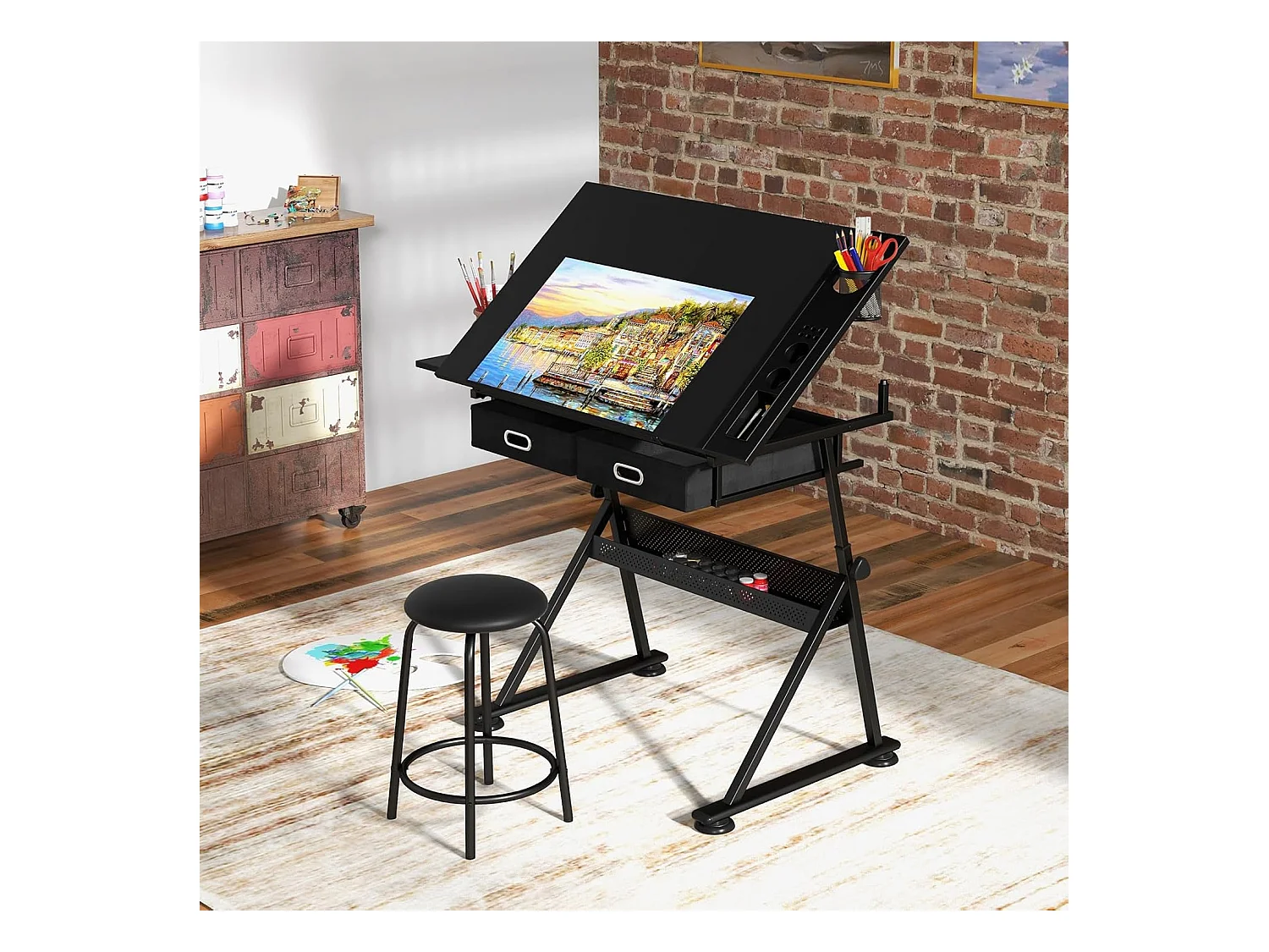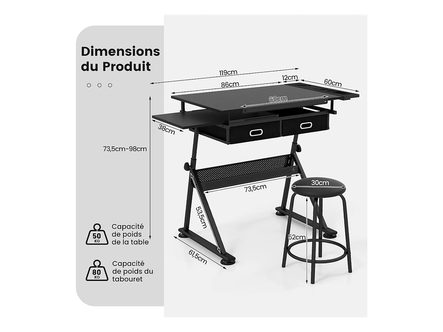 Table à Dessin Inclinable, Bureau à Dessin avec Tabouret, 2 Grands Tiroirs, Porte-Stylo, Hauteur Réglable, pour Peinture, 61,5 x 119 x (73,5-98) cm, Noir