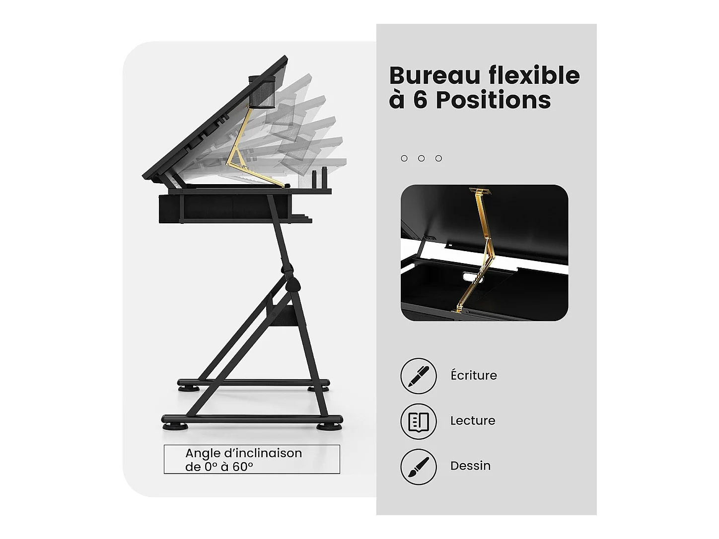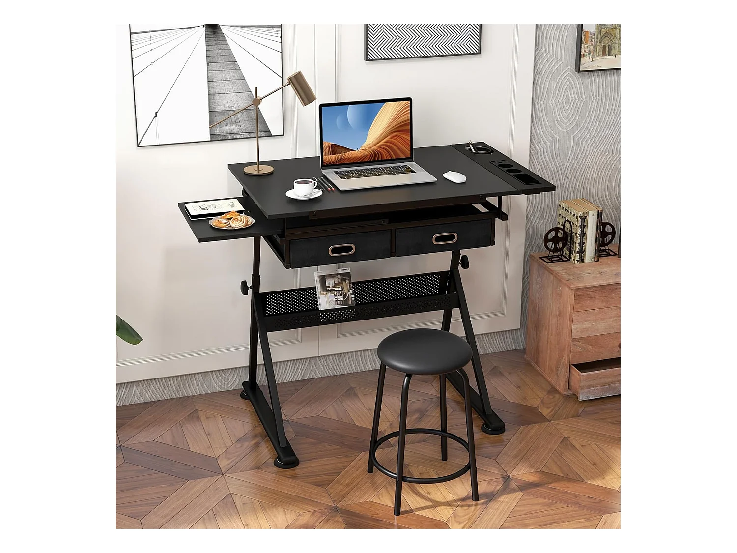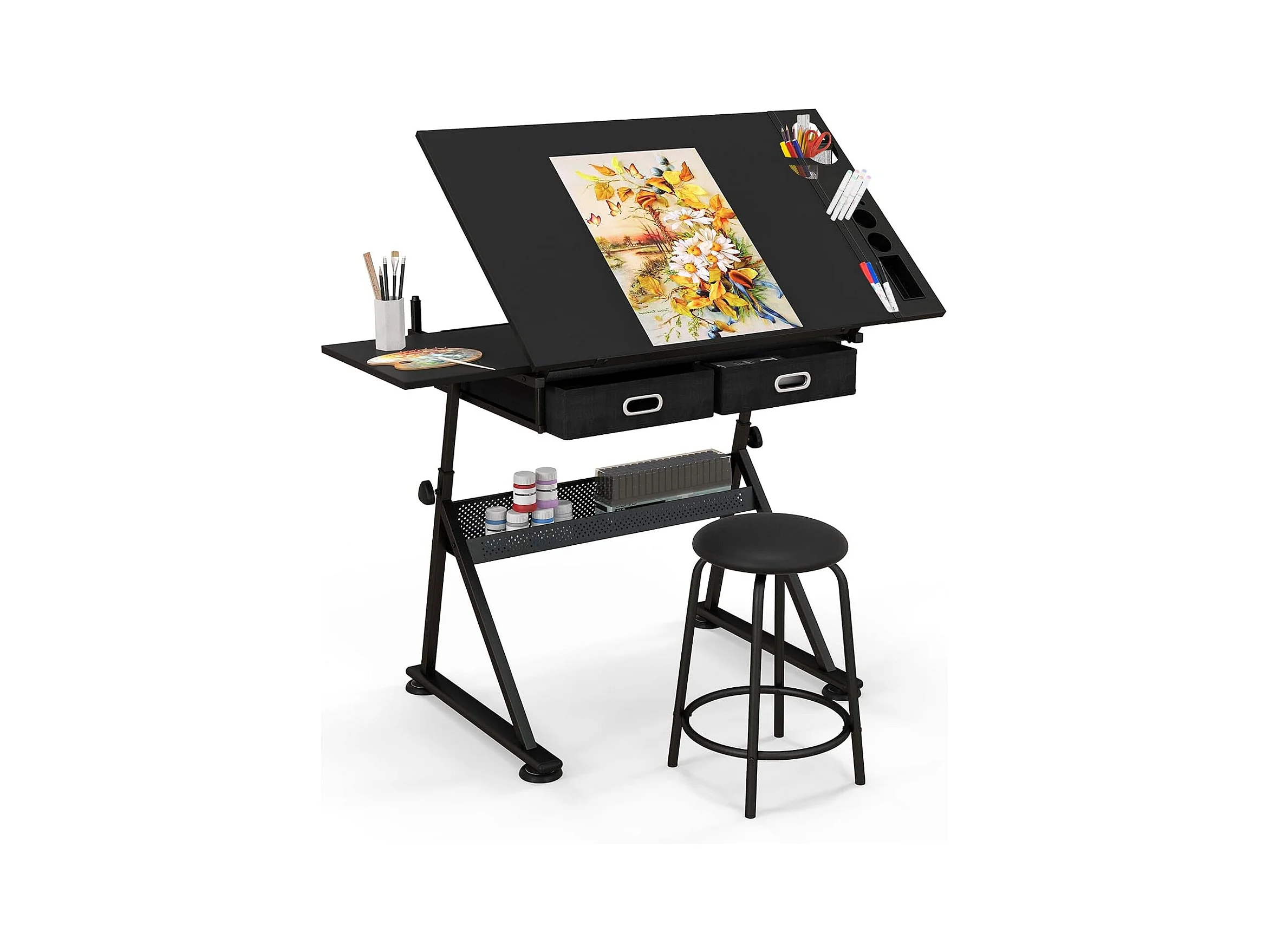 Table à Dessin Inclinable, Bureau à Dessin avec Tabouret, 2 Grands Tiroirs, Porte-Stylo, Hauteur Réglable, pour Peinture, 61,5 x 119 x (73,5-98) cm, Noir