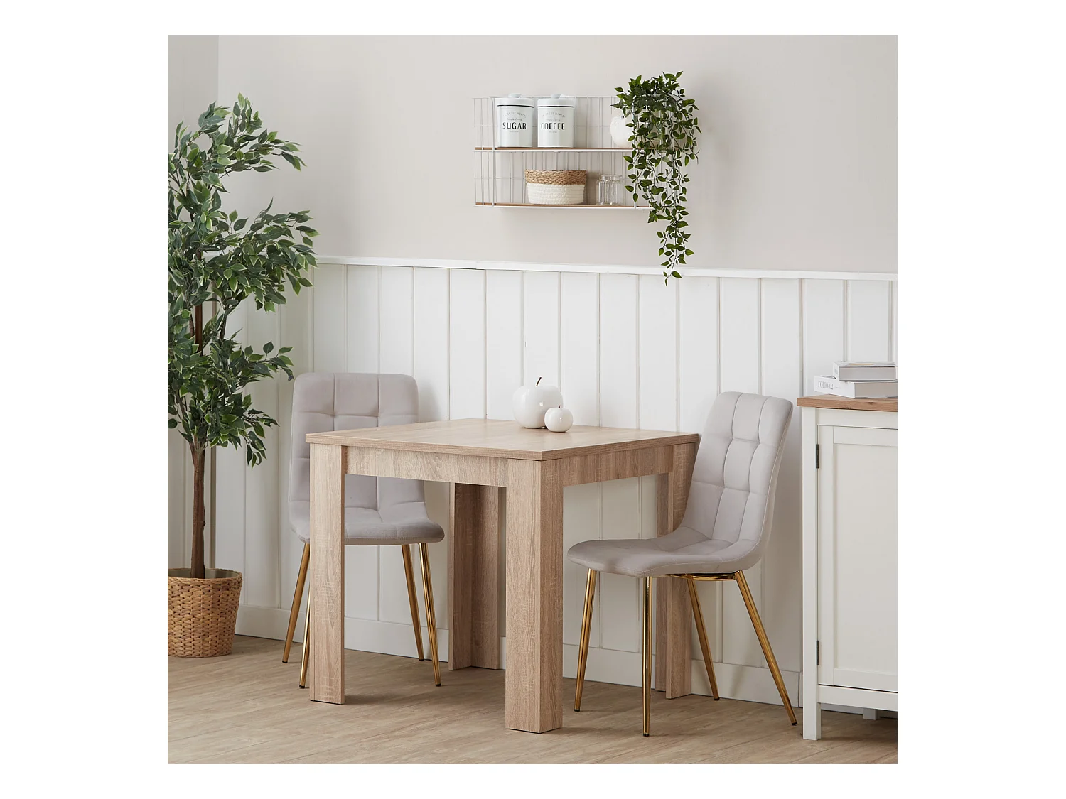Table à manger 80x80x75 cm chêne sonoma naturel Table de salle à manger avec 2 chaises en velours crème
