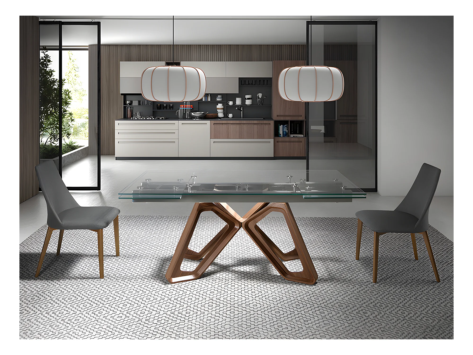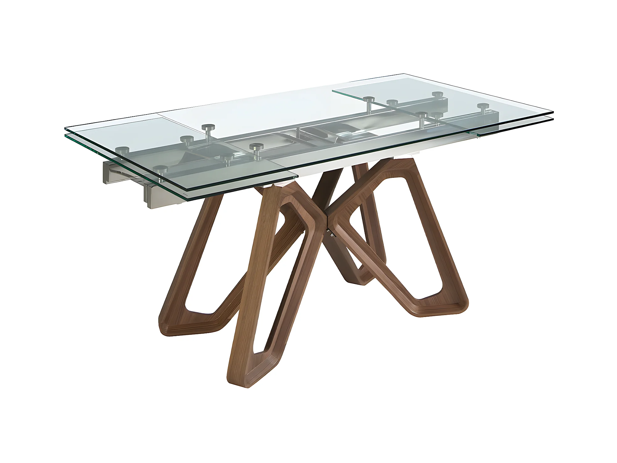 Table de salle à manger rectangulaire à rallonge en verre trempé, noyer et acier chromé 1159 ANGEL CERDA