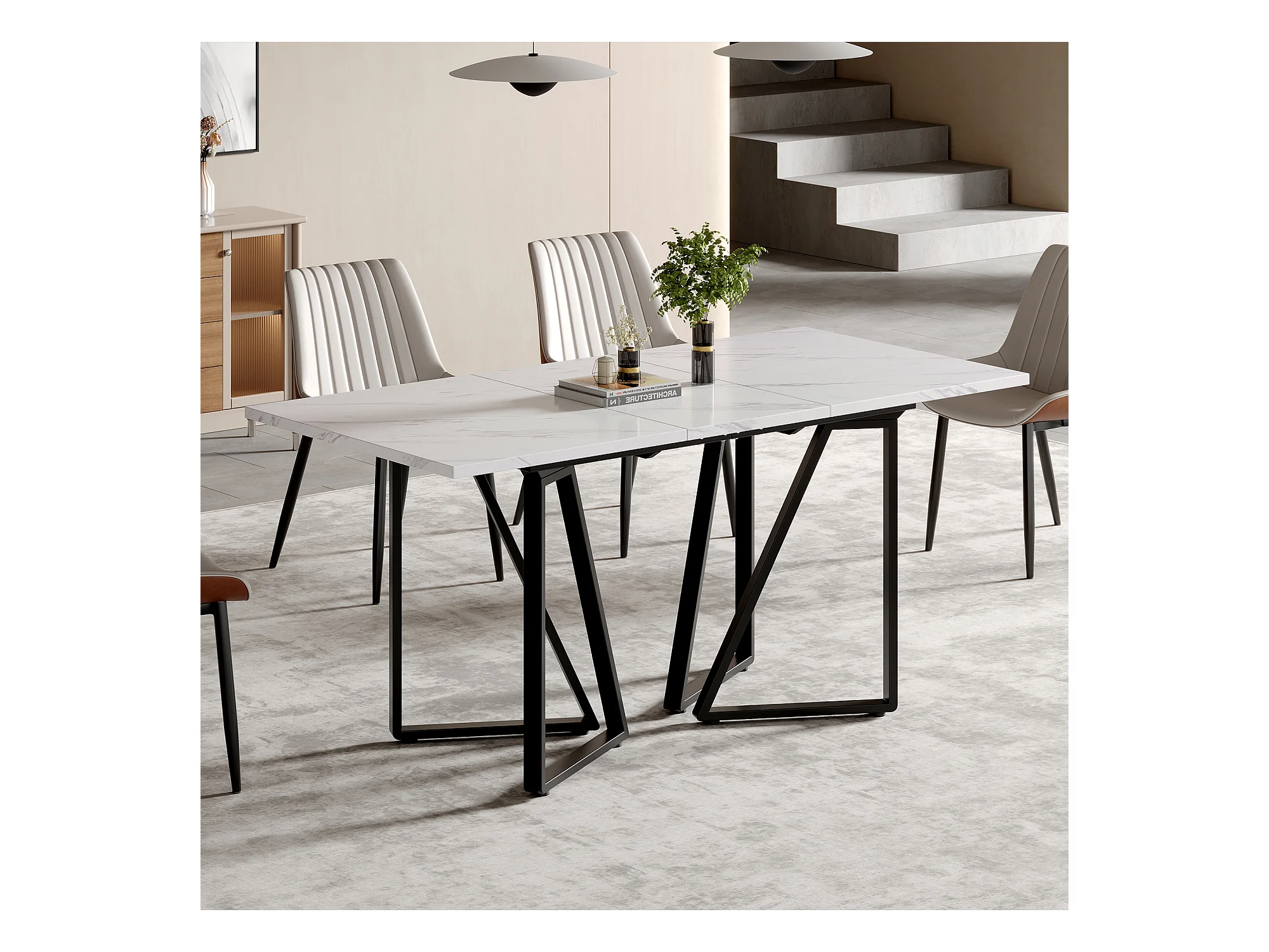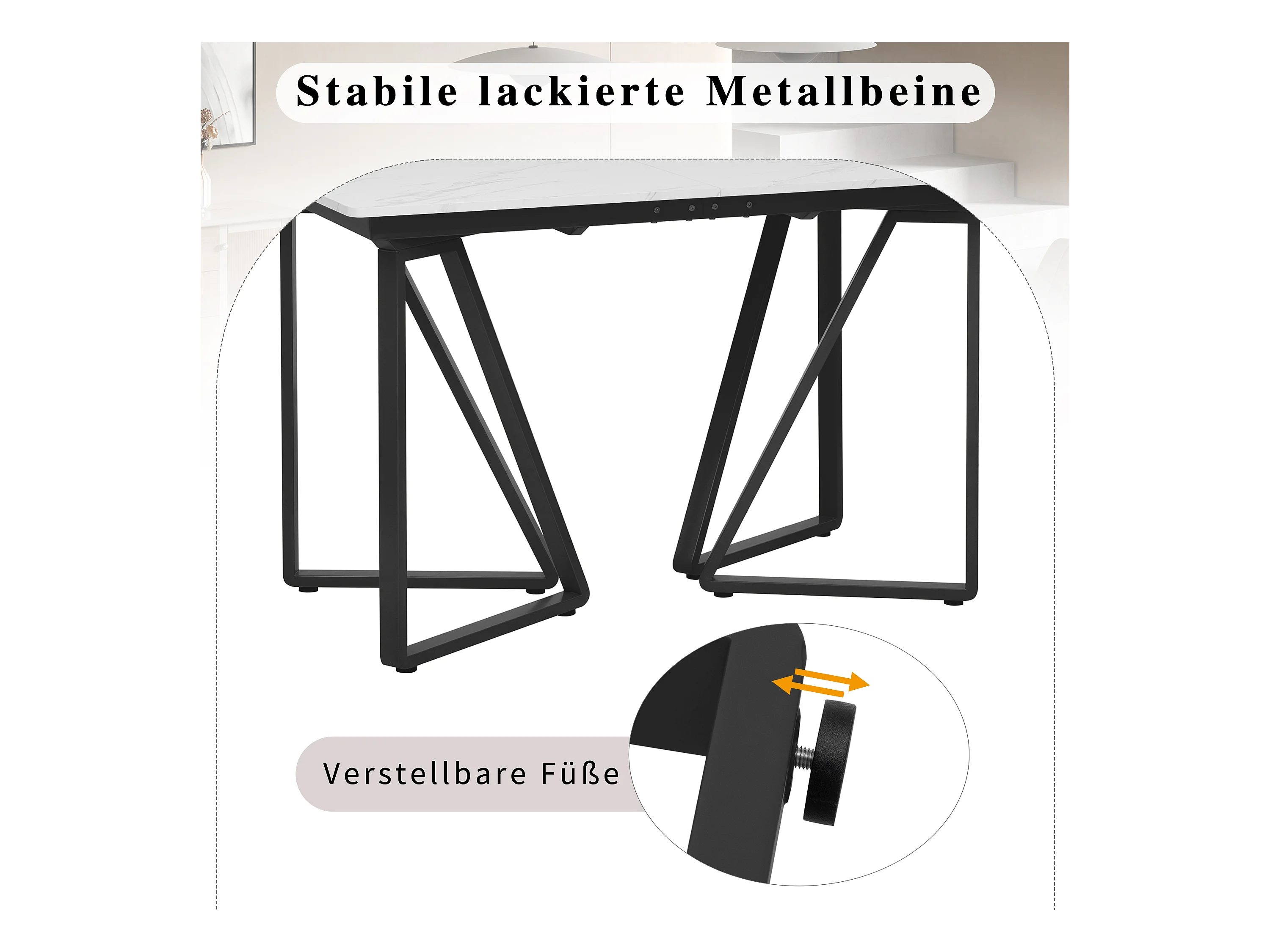 Table à manger télescopique 140/180x80x75 cm, plateau MDF blanc avec motifs marbre, pieds en métal noir (140/180x80x75 cm)