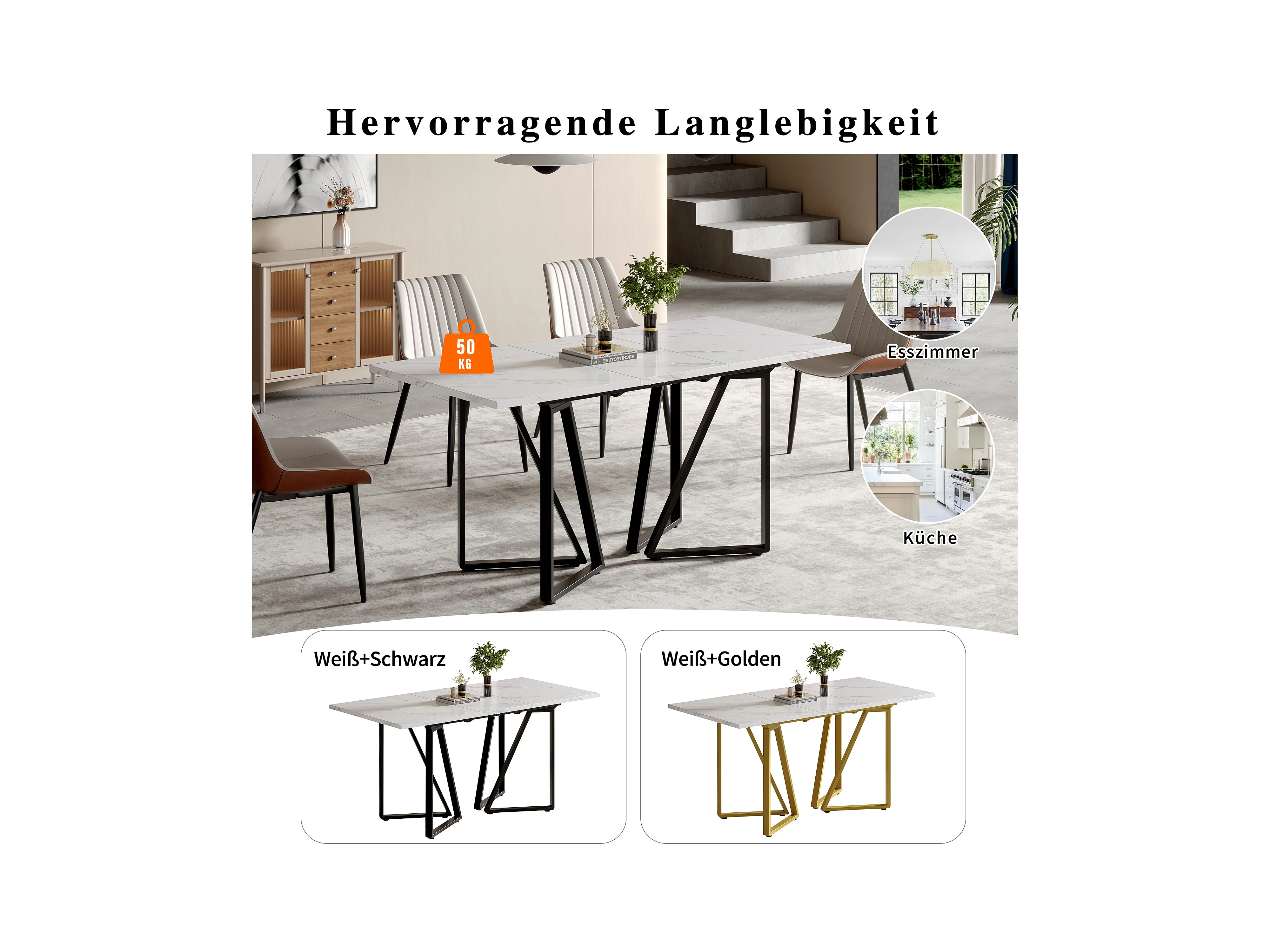 Table à manger avec motif marbre, extensible, pieds métalliques avec repose-pieds réglables, idéale pour salle à manger et cuisine (160x73x74 cm)