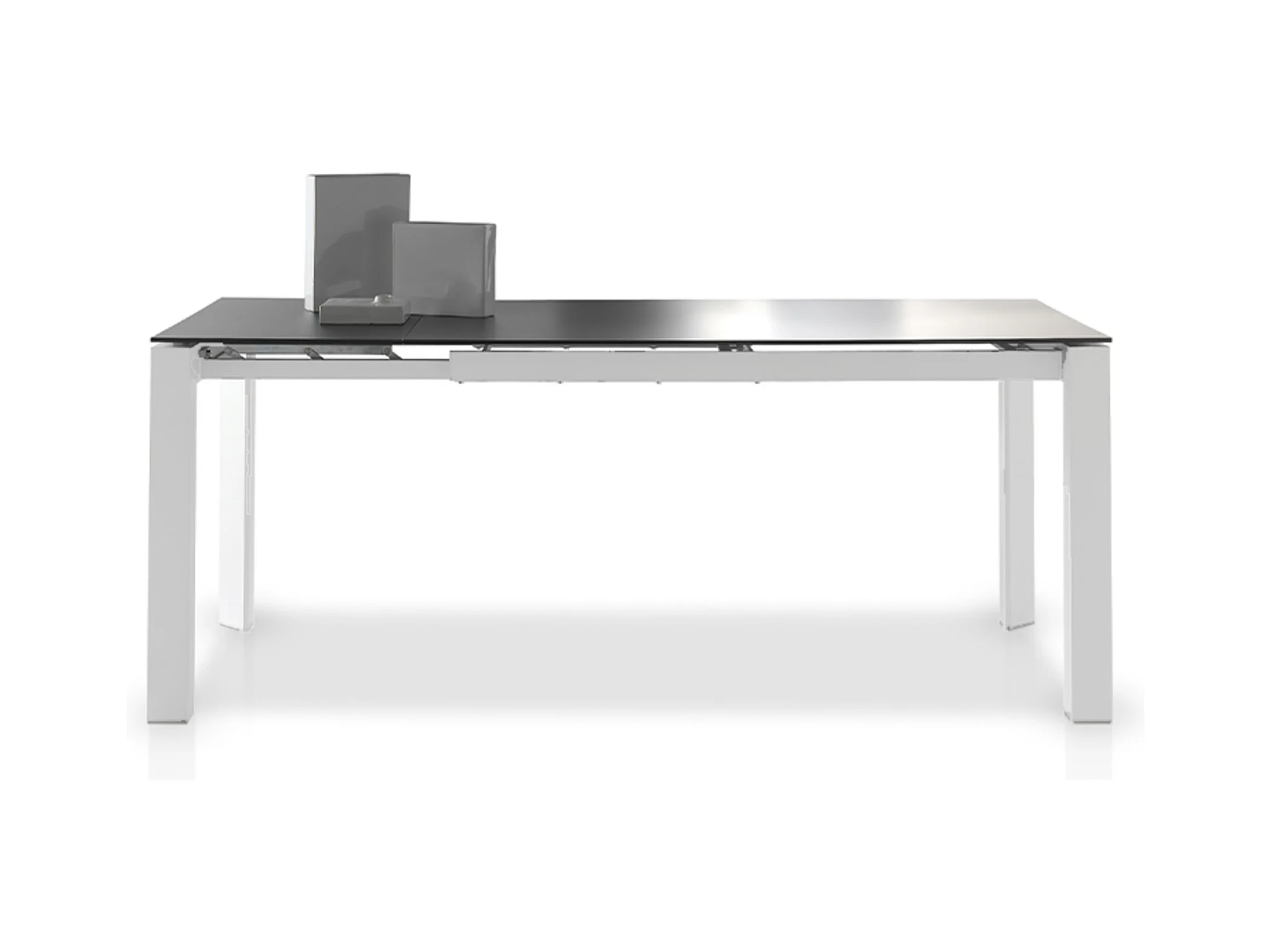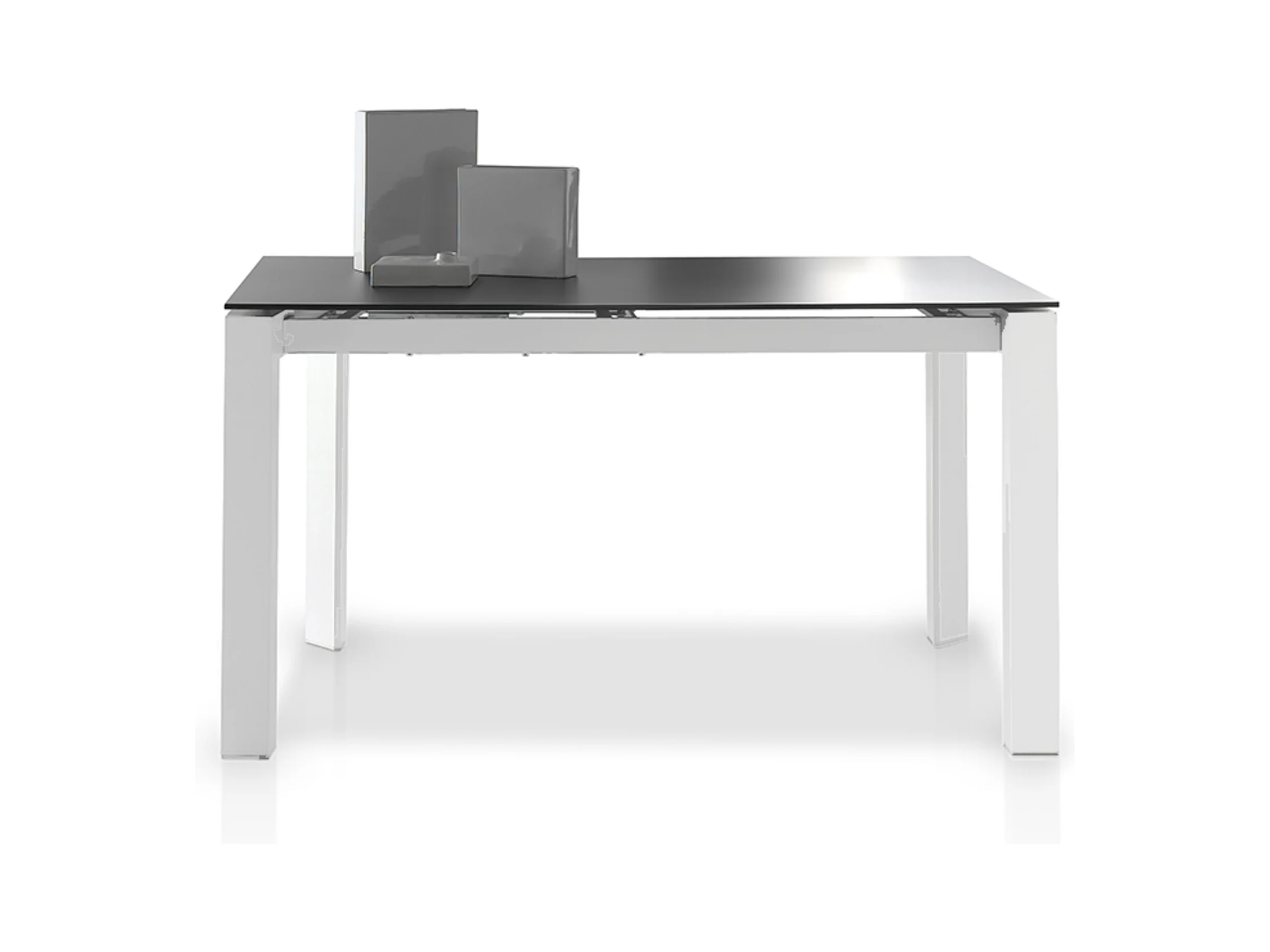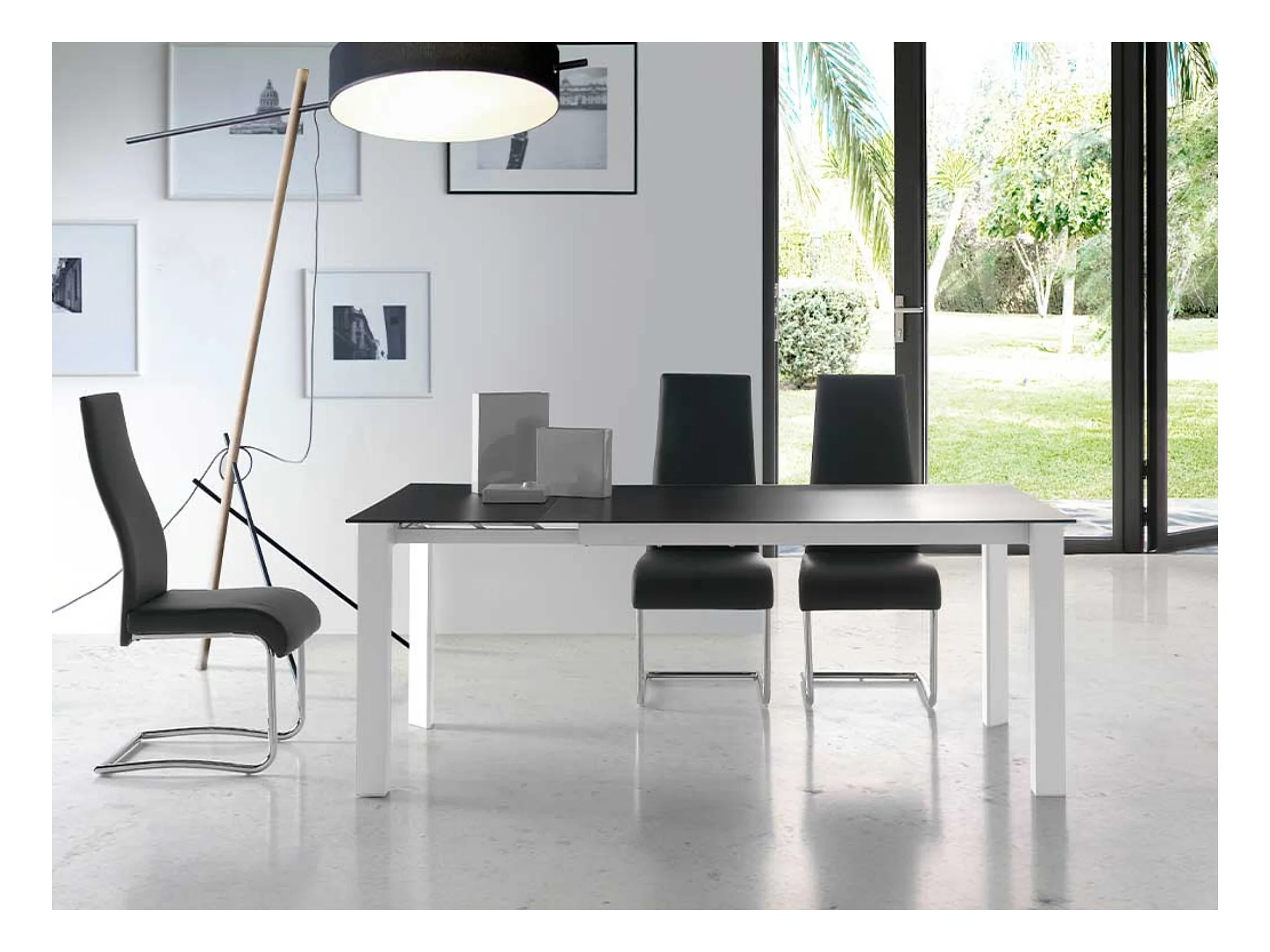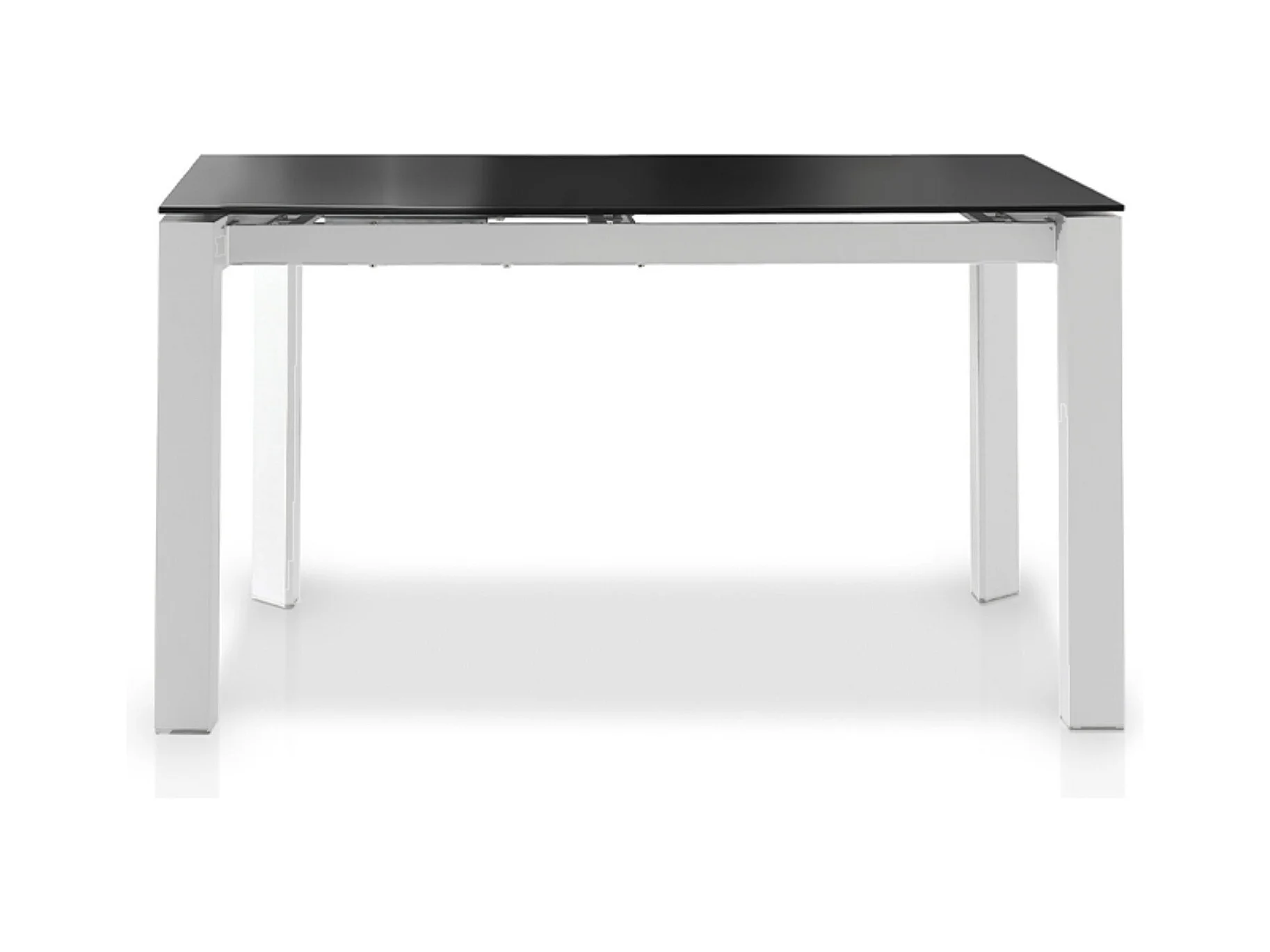Table à manger design extensible verre teinté noir et pieds métal blanc Mikale 140 à 190cm