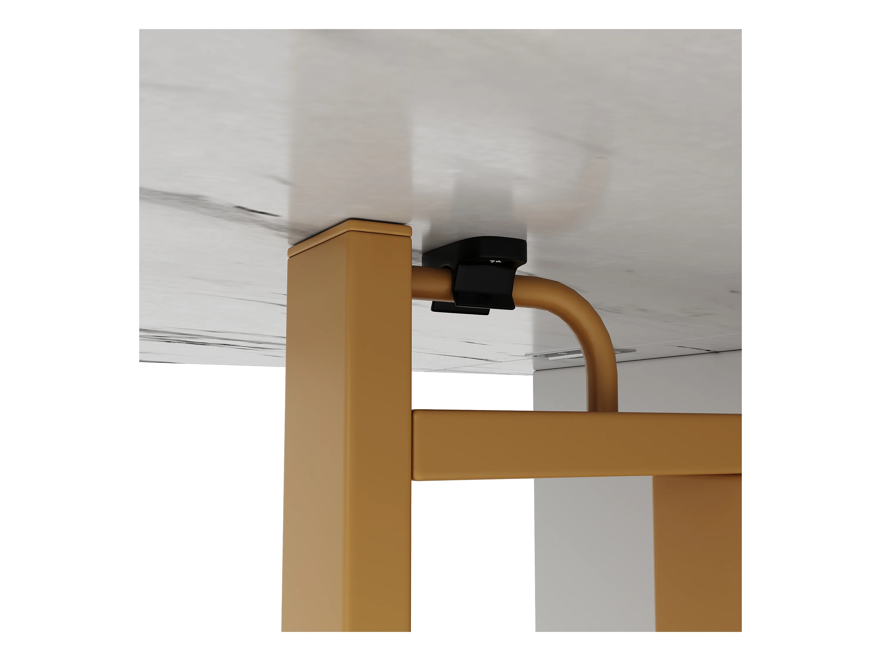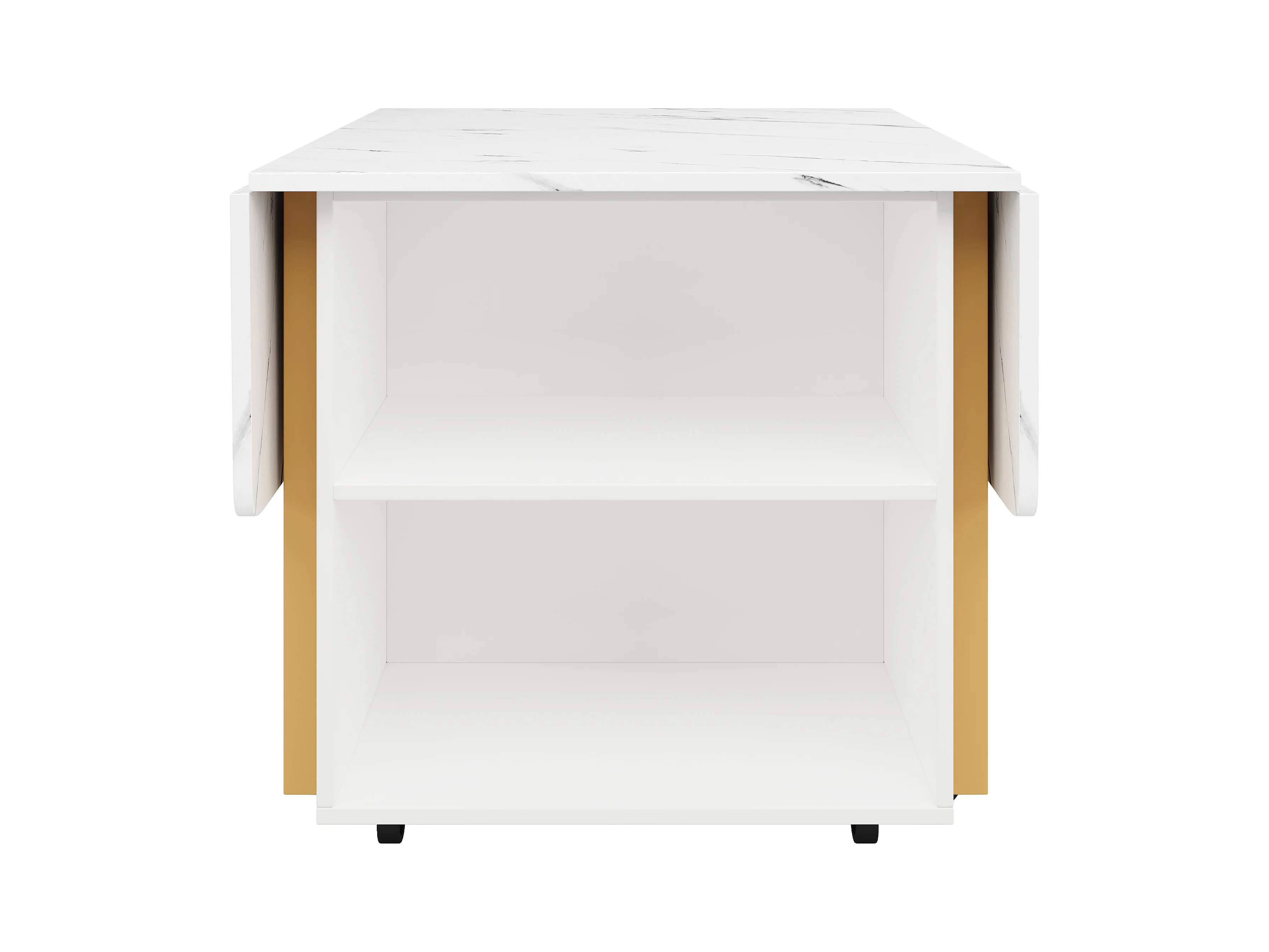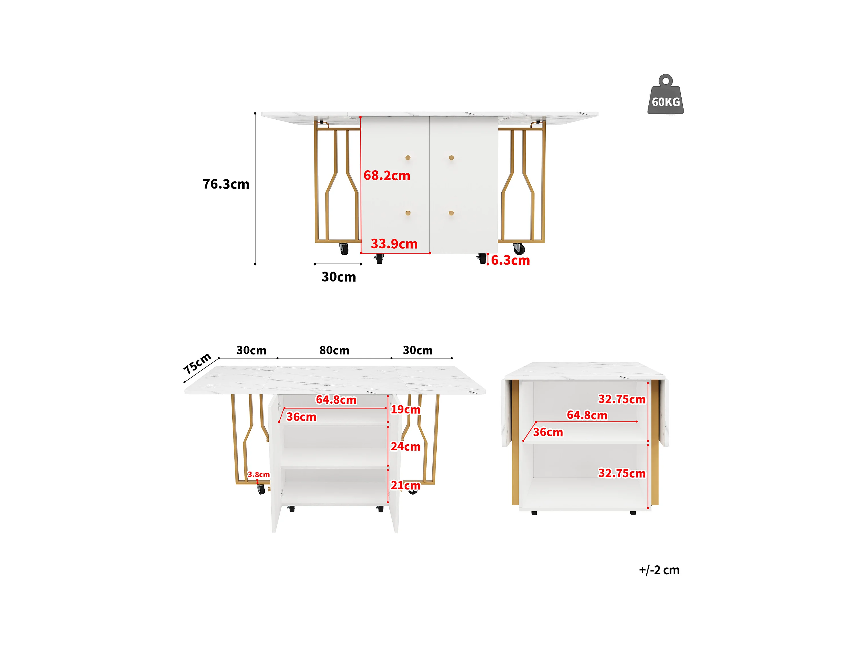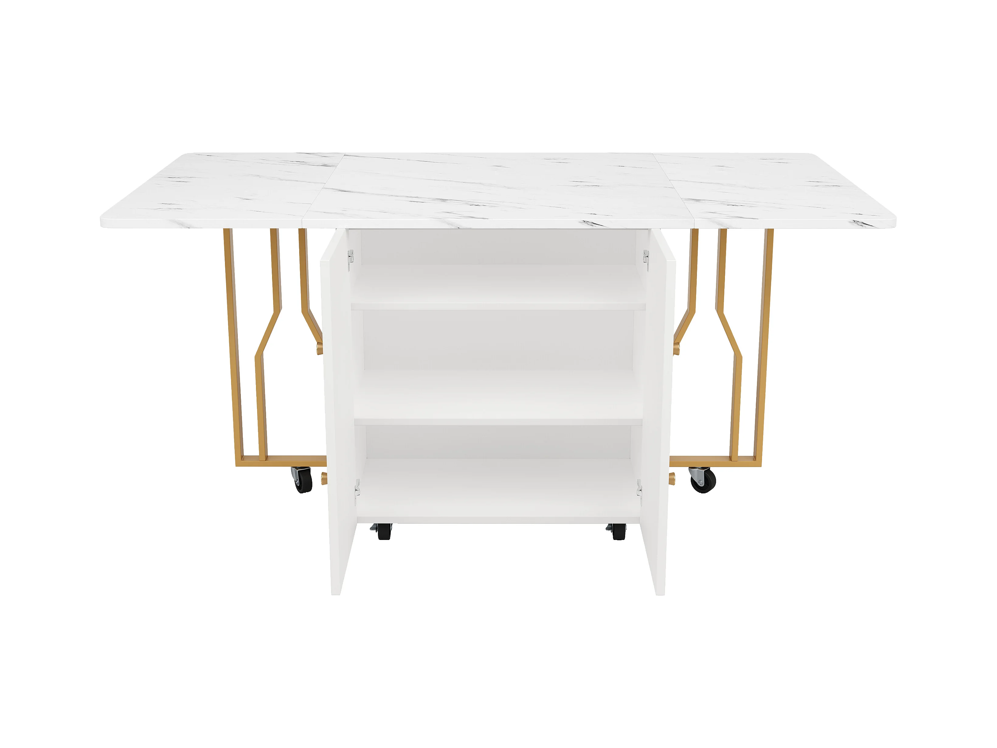 Table à manger extensible 4-8 personnes avec placard, 75x140cm en MDF, placage marbre blanc avec pied doré