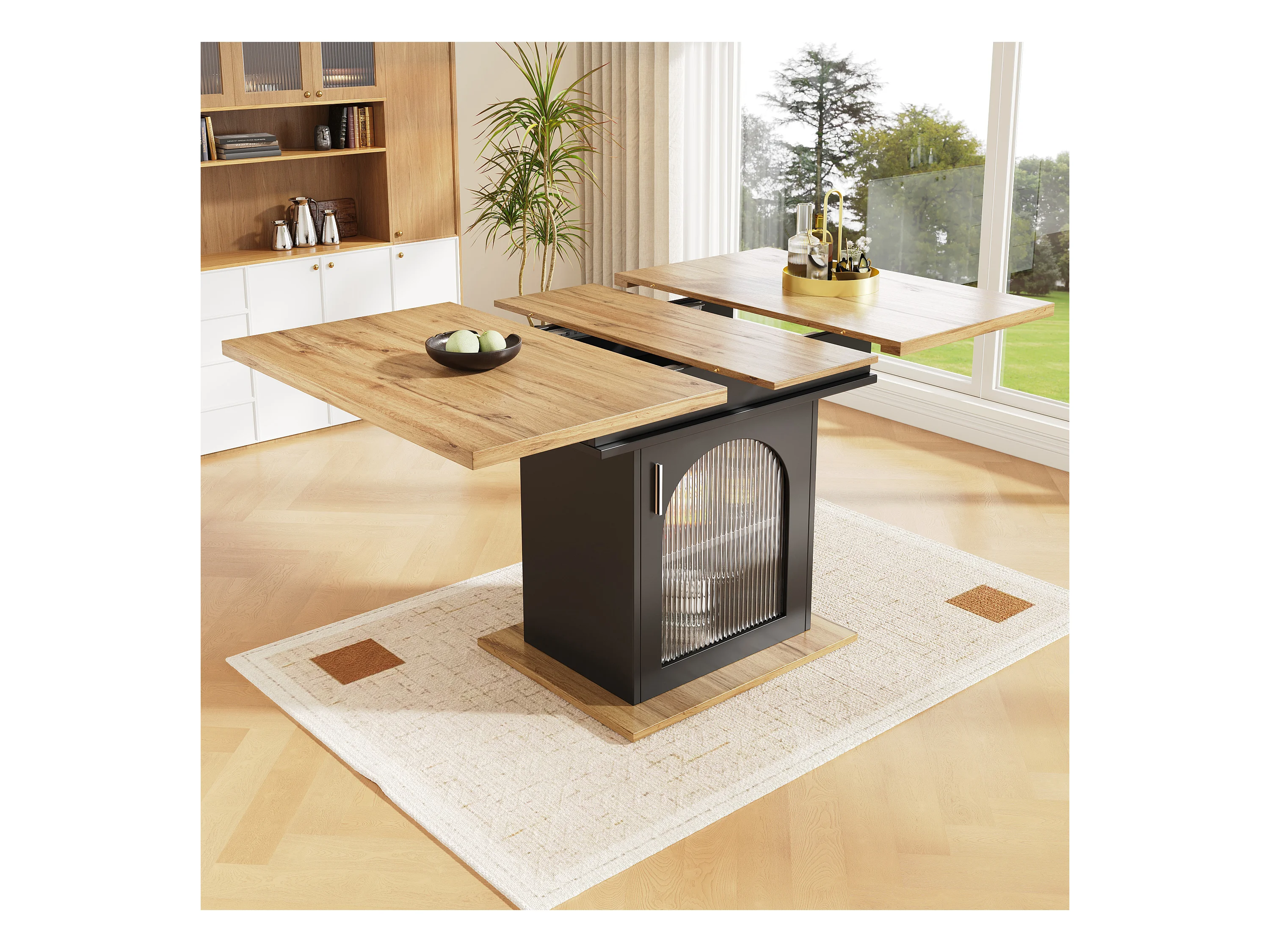 Table à manger extensible blanc - Table à manger avec trois compartiments de rangement et portes vitrées - plateau en bois - rangement ouvert