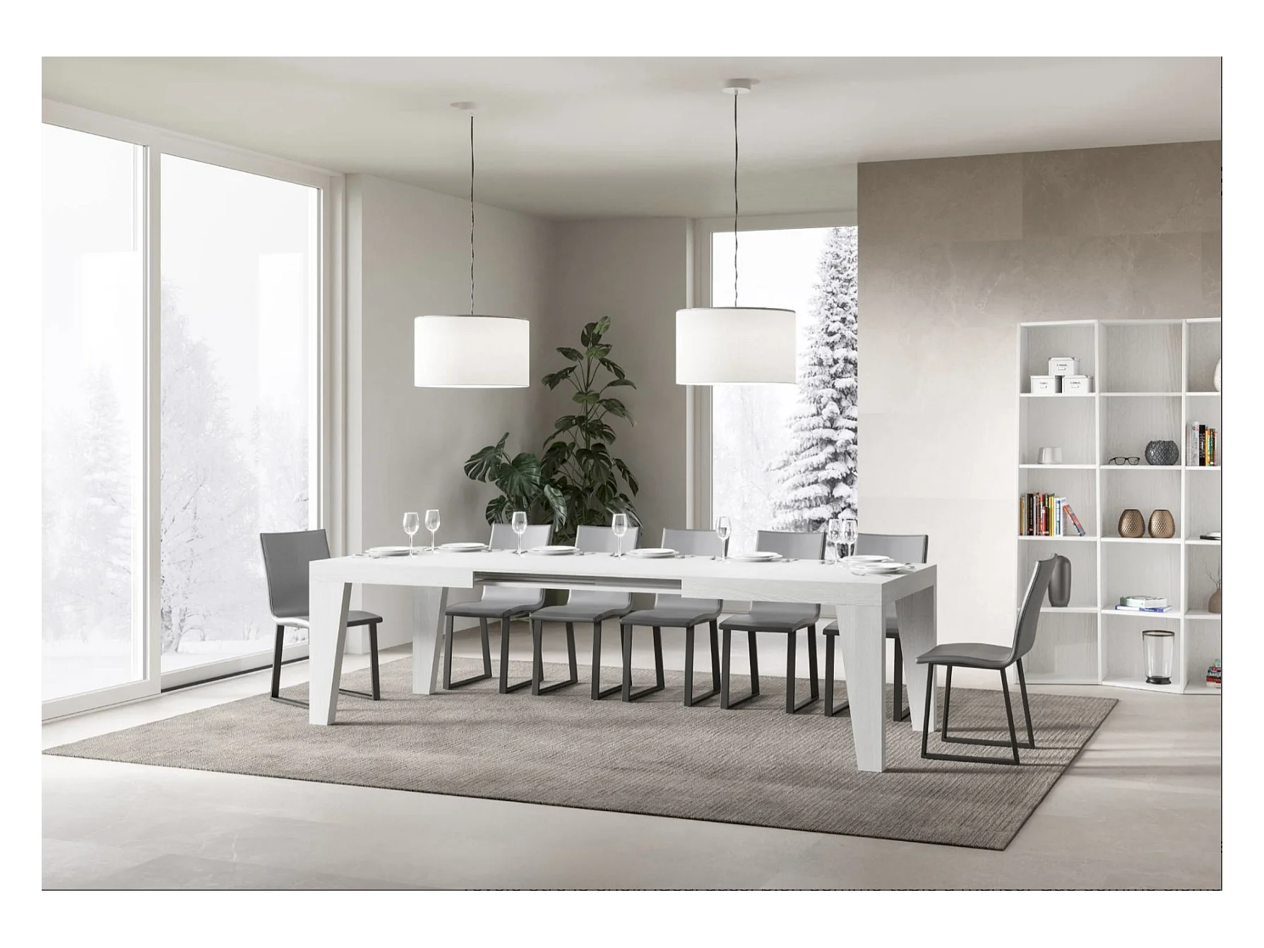 Table à manger extensible bois Naxo-Couleur Blanc-4 pieds-5 rallonges fines-180 à 440cm