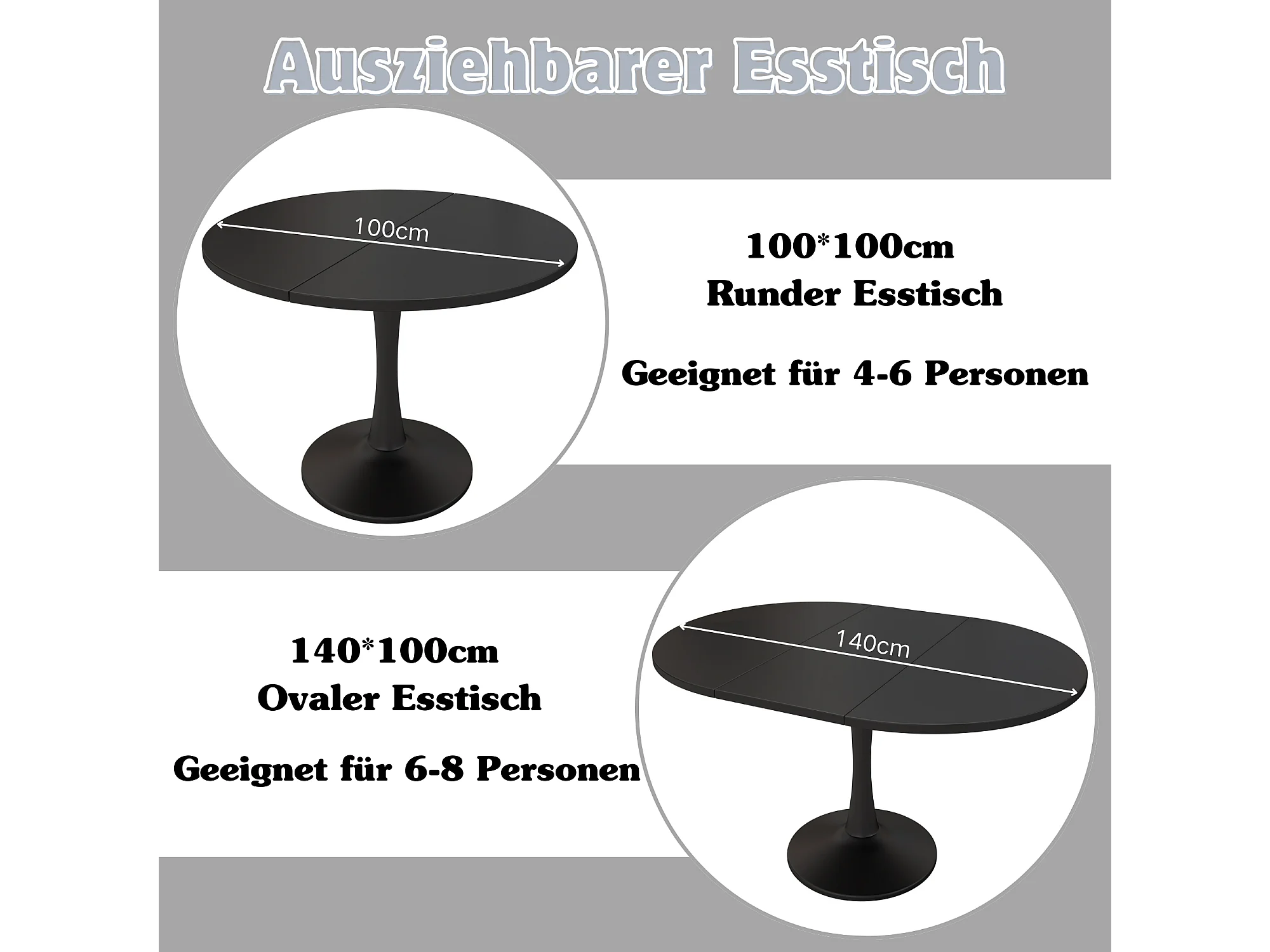 Table à manger extensible, table ovale, table de café et de loisirs, MDF, noir, (100/140 x 100 x 75 cm)