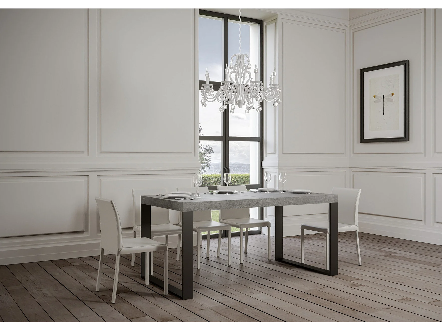Table à manger extensible Tiroz-Couleur Gris ciment-Sur roulettes-2 rallonges fines-140 à 244cm