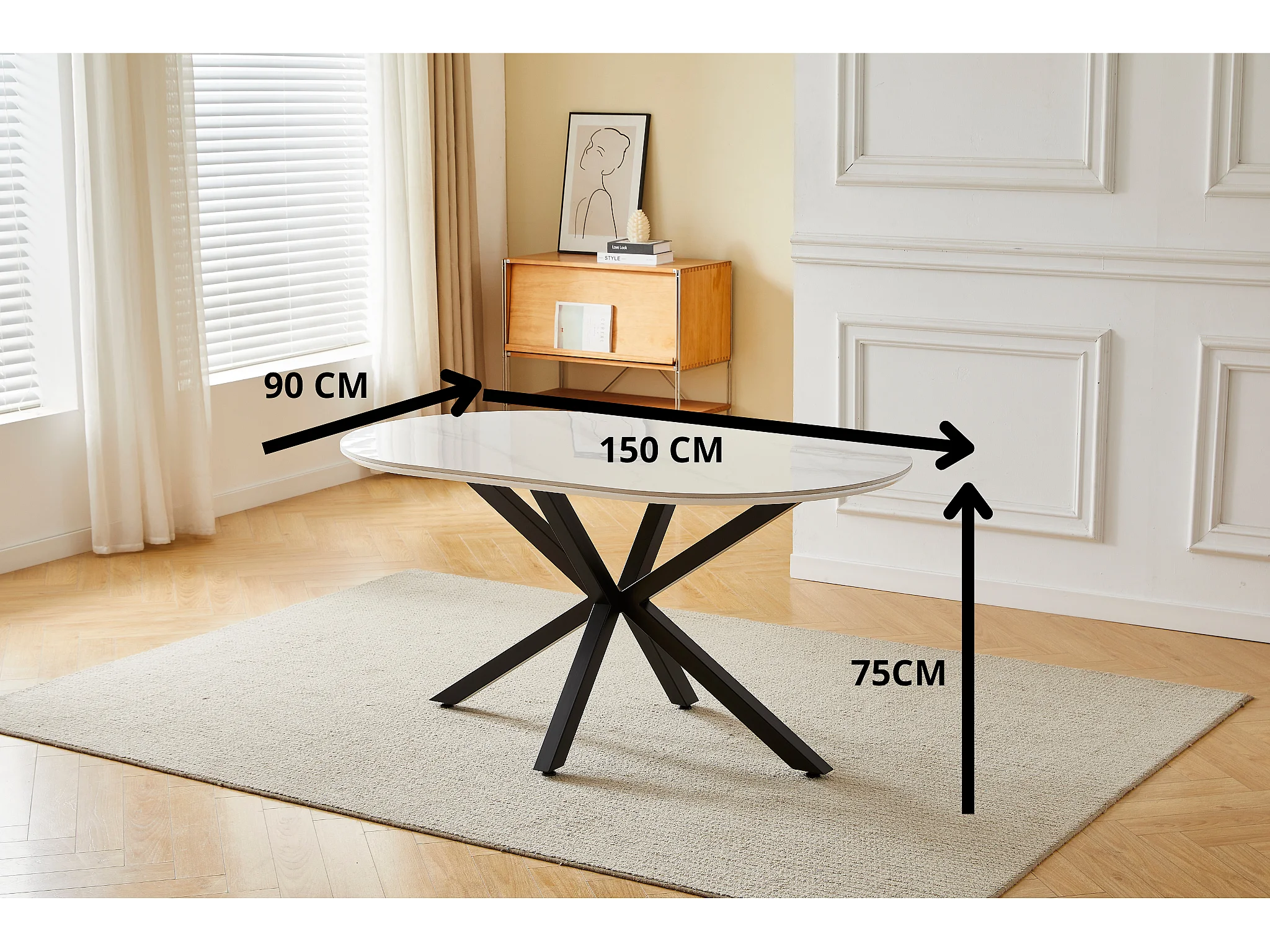 Table à manger LUCIA - 6 personnes - Plateau en céramique effet marbre blanc - Pieds en métal noir