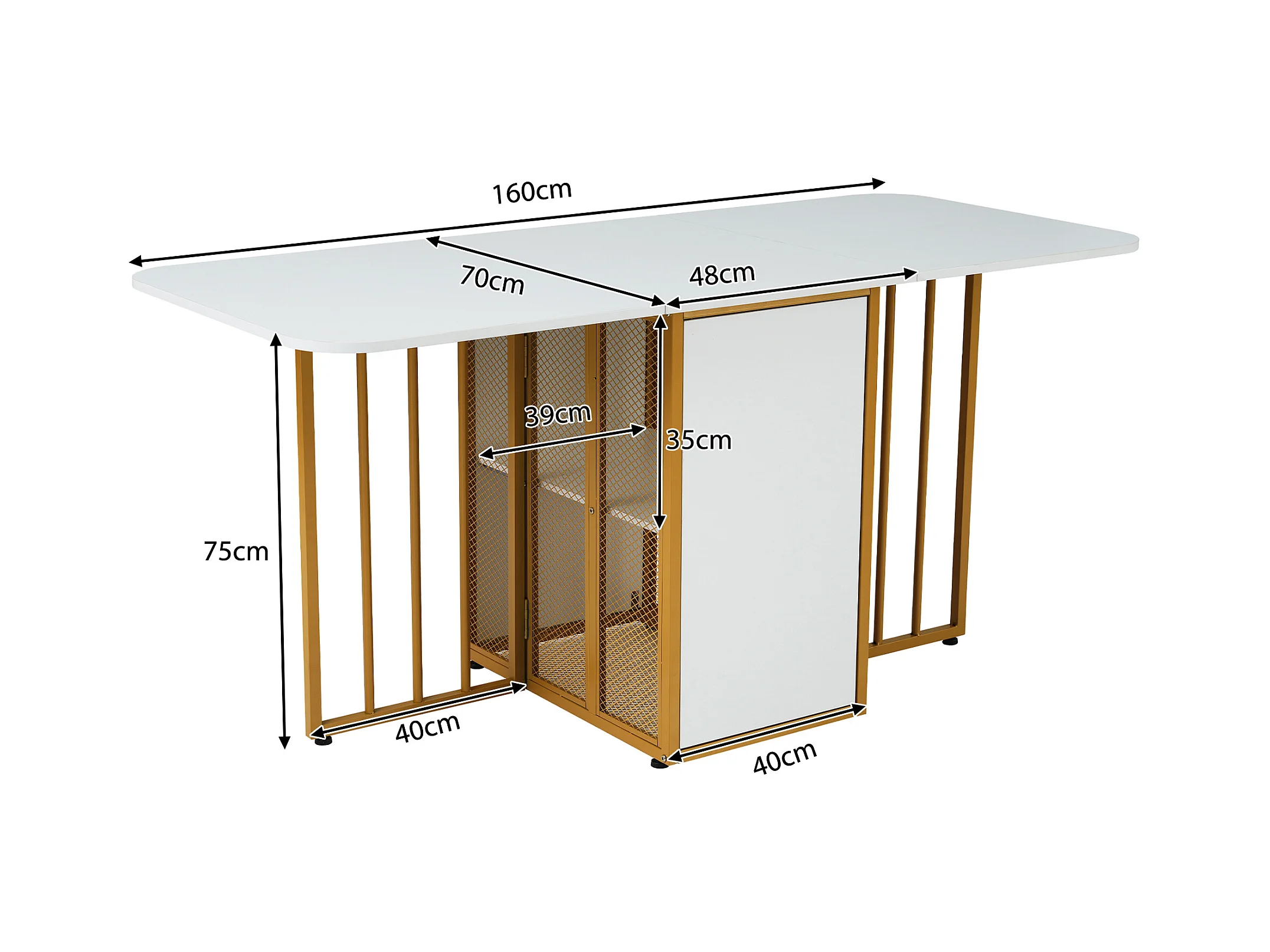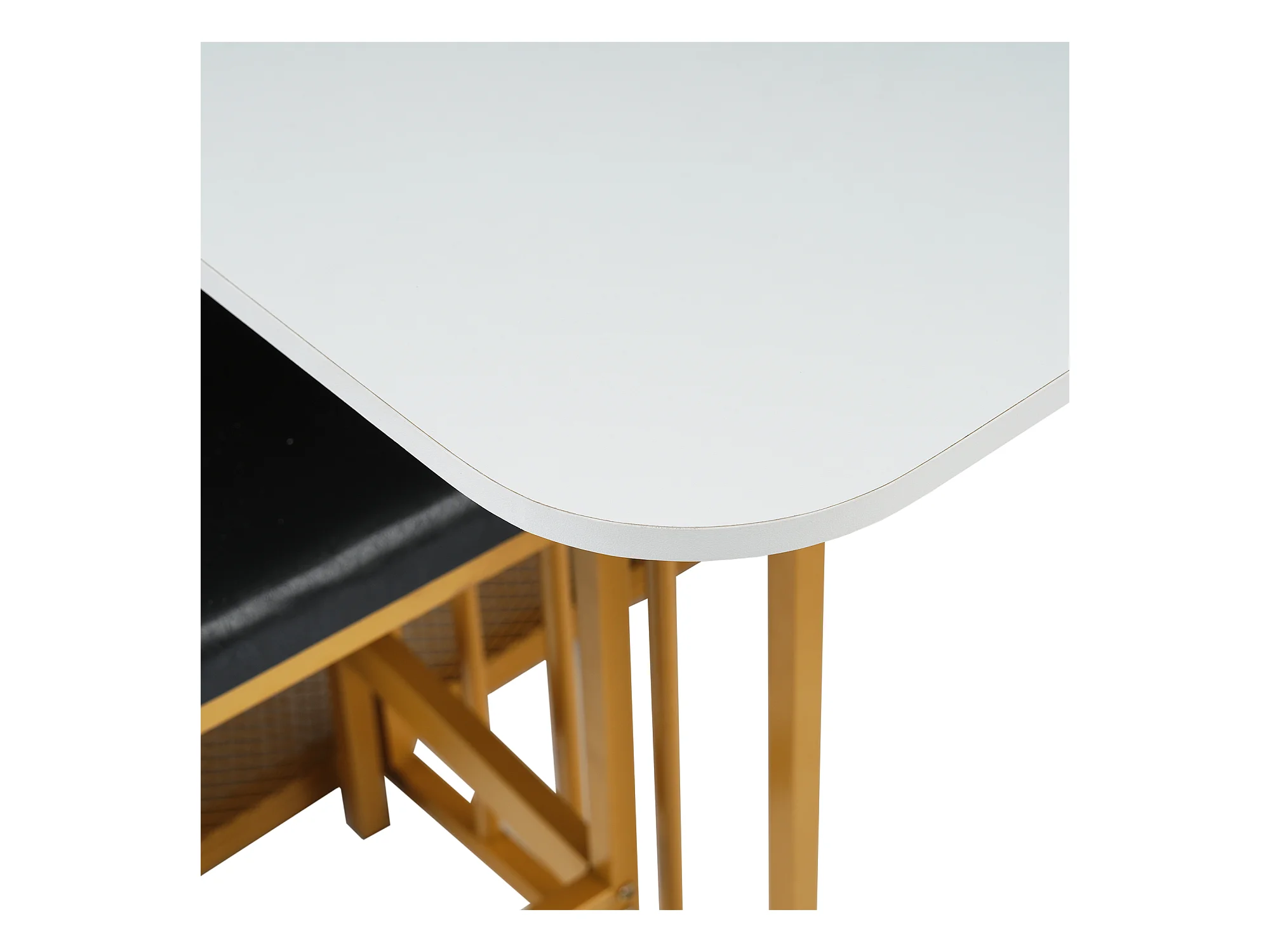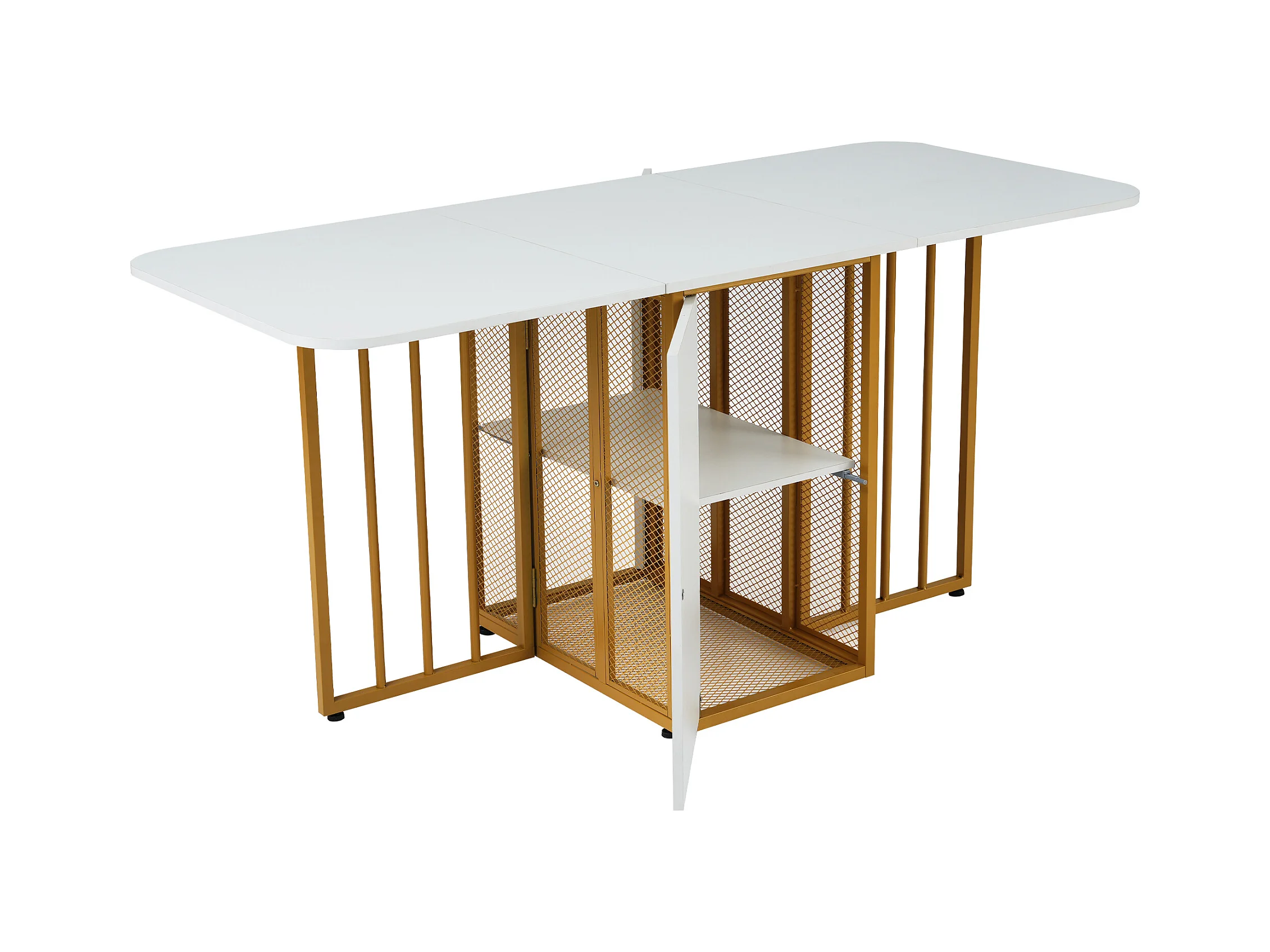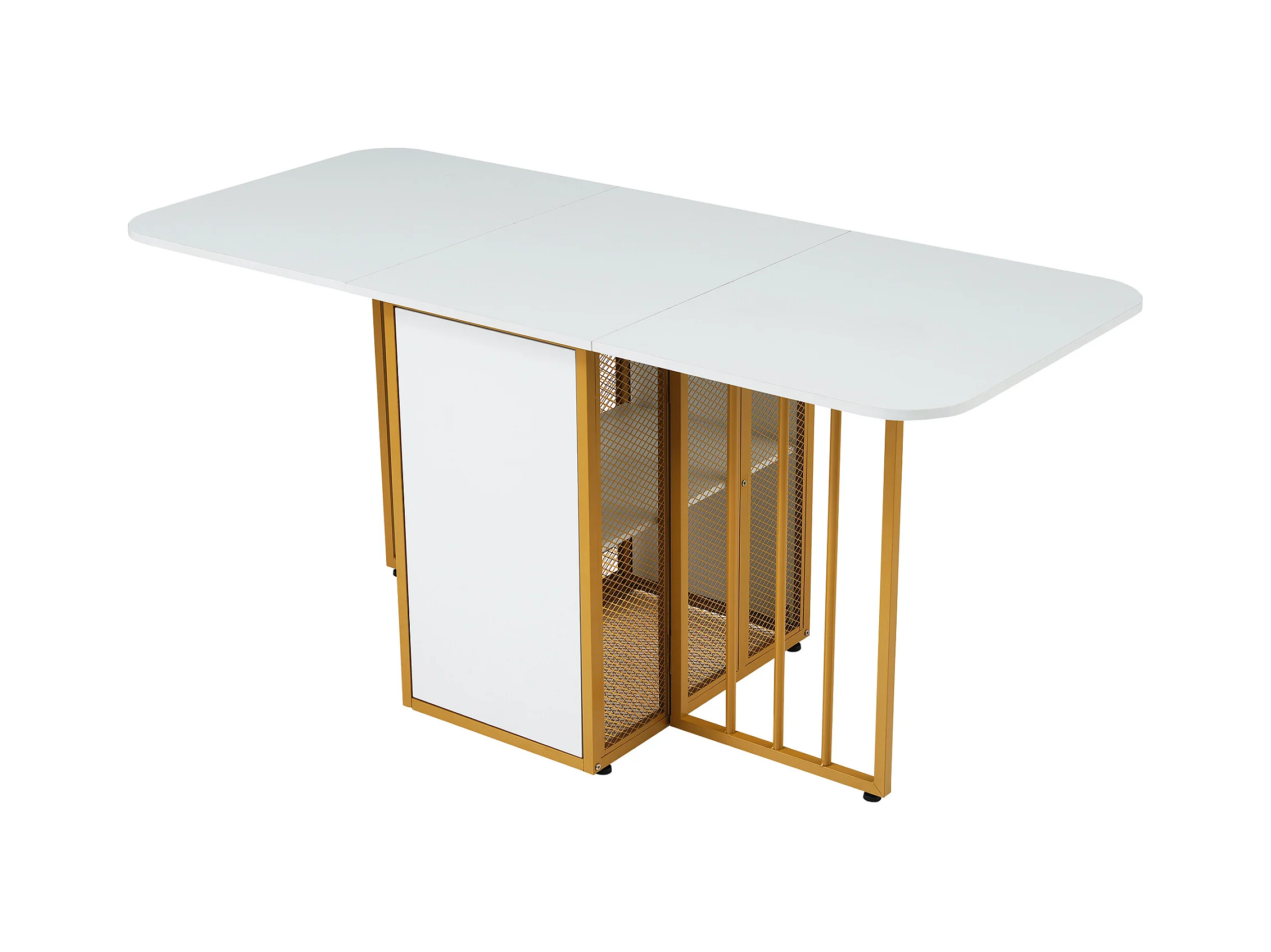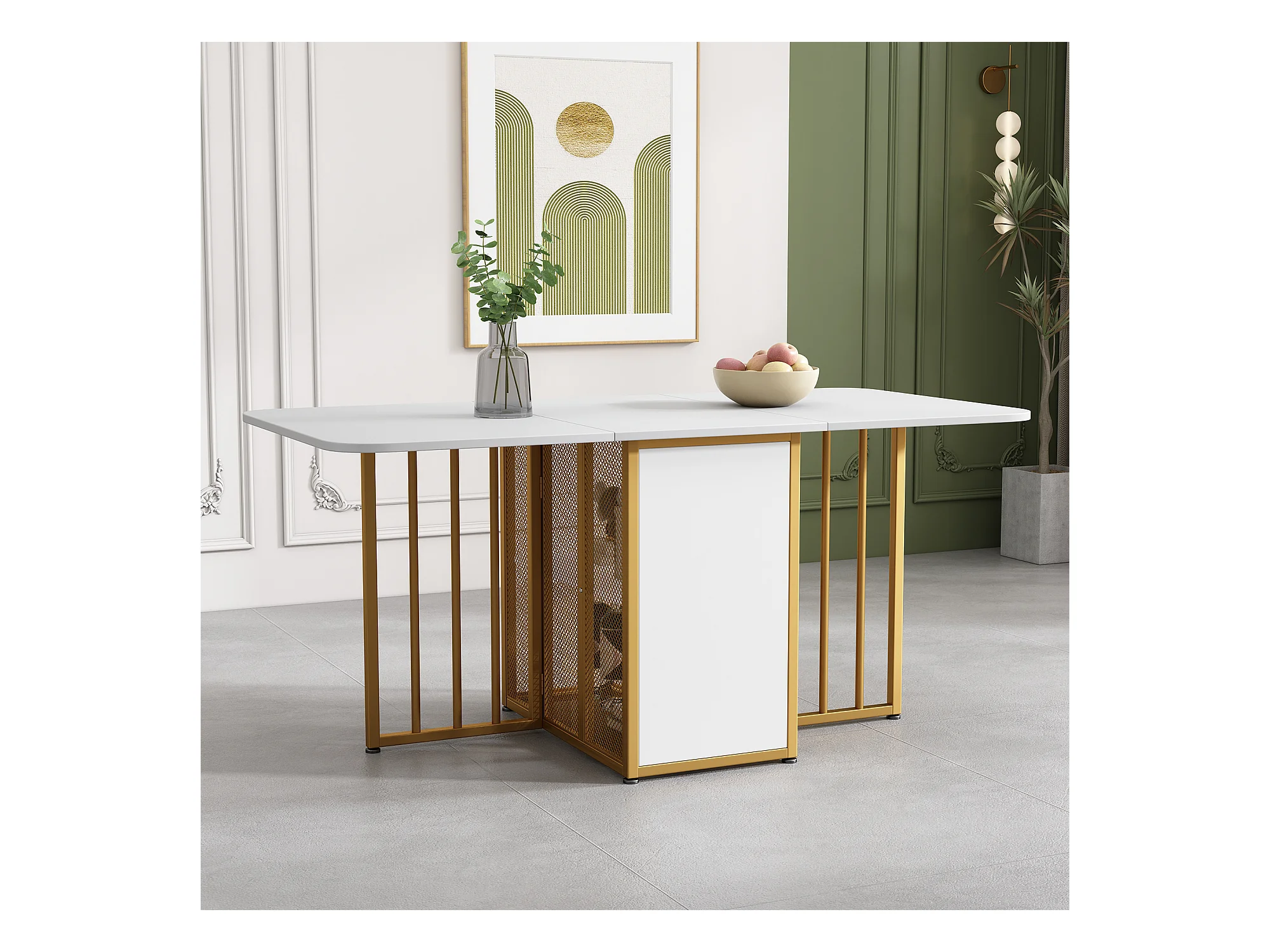 Table à Manger Rectangulaire 4 à 6 Couverts avec 2 Etagères - Panneaux de Particules - Pièds en Métal Doré - Blanc