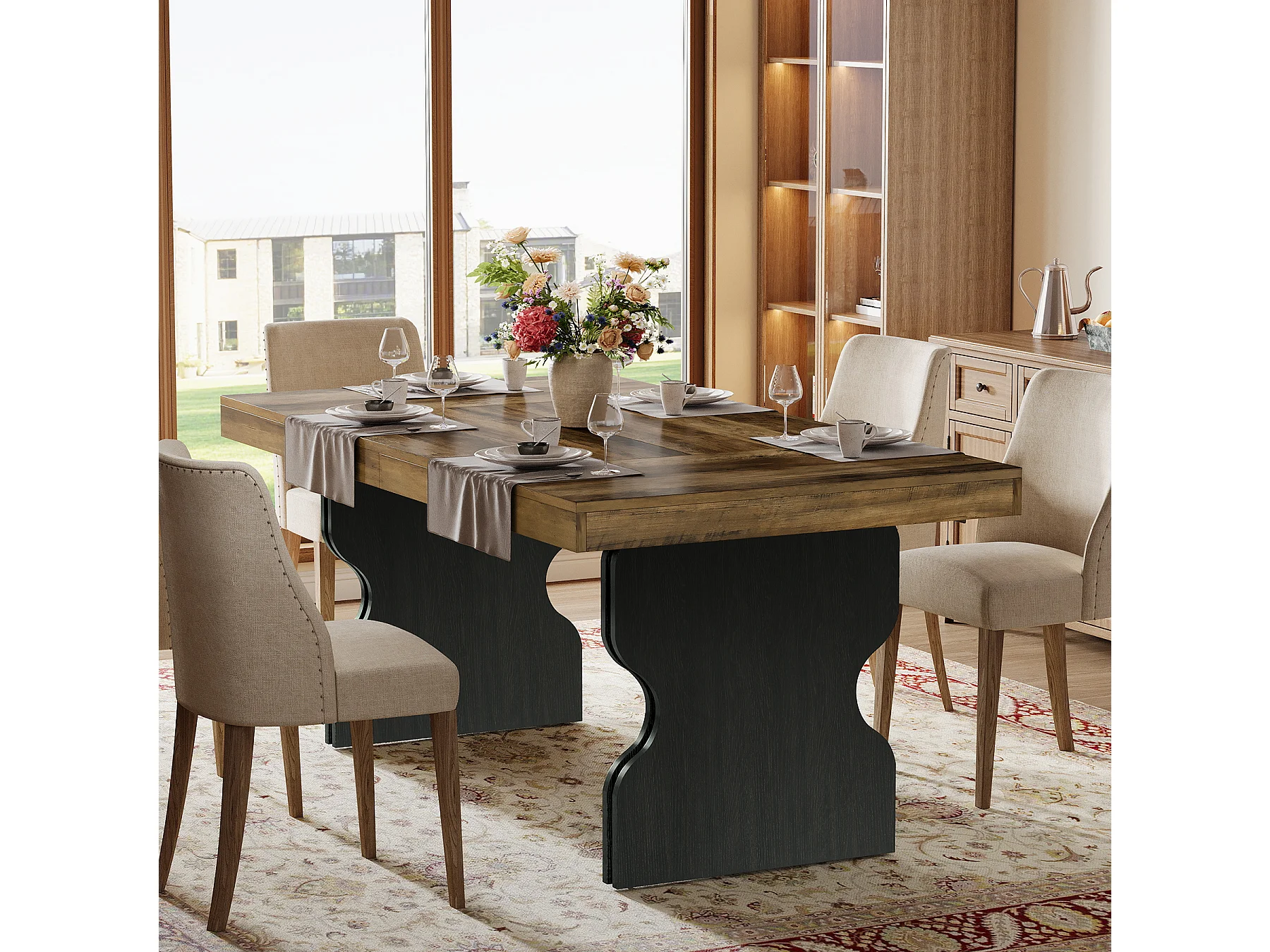Table à manger rectangulaire de 160 cm pour 4 à 6 personnes, grande table de cuisine, marron et noir (table seule)
