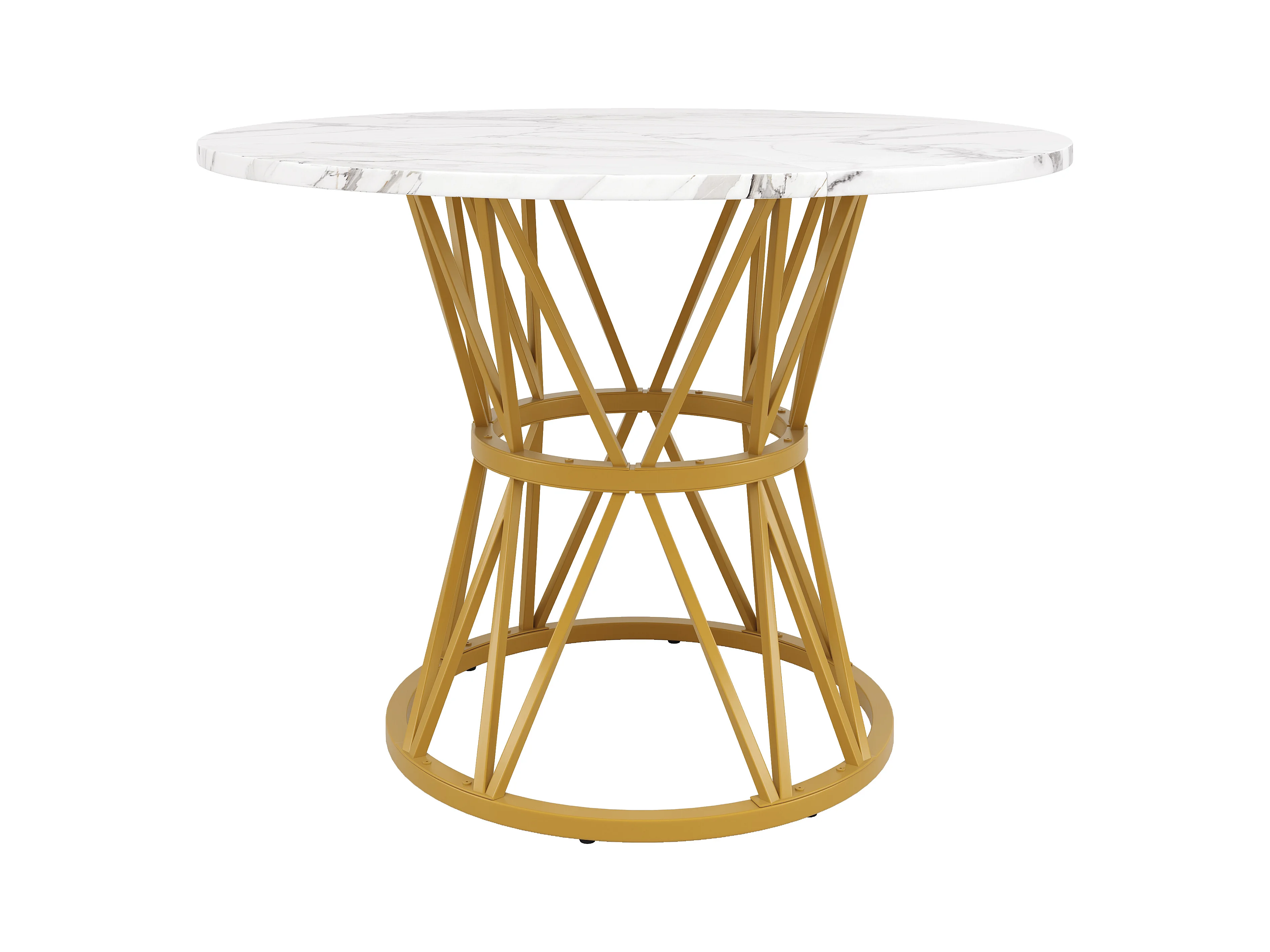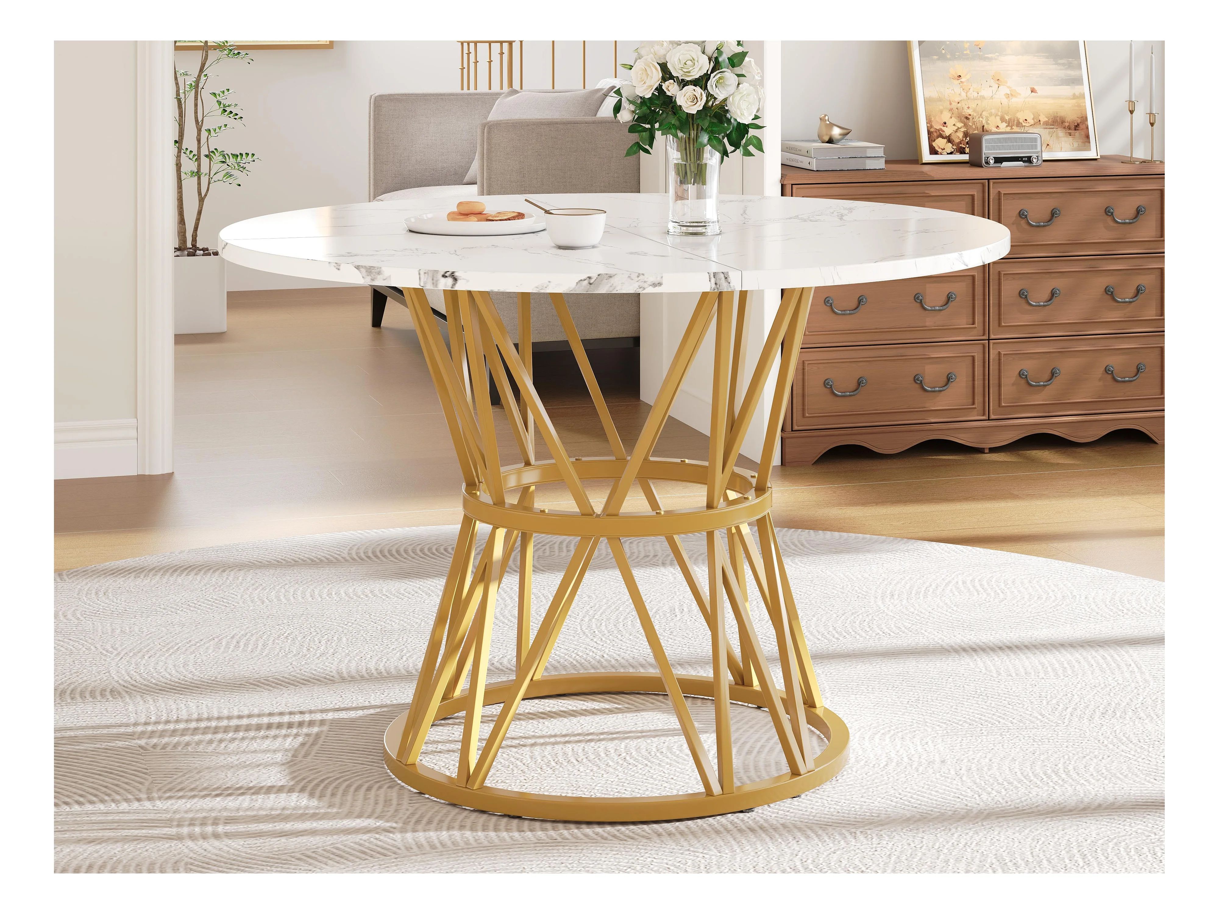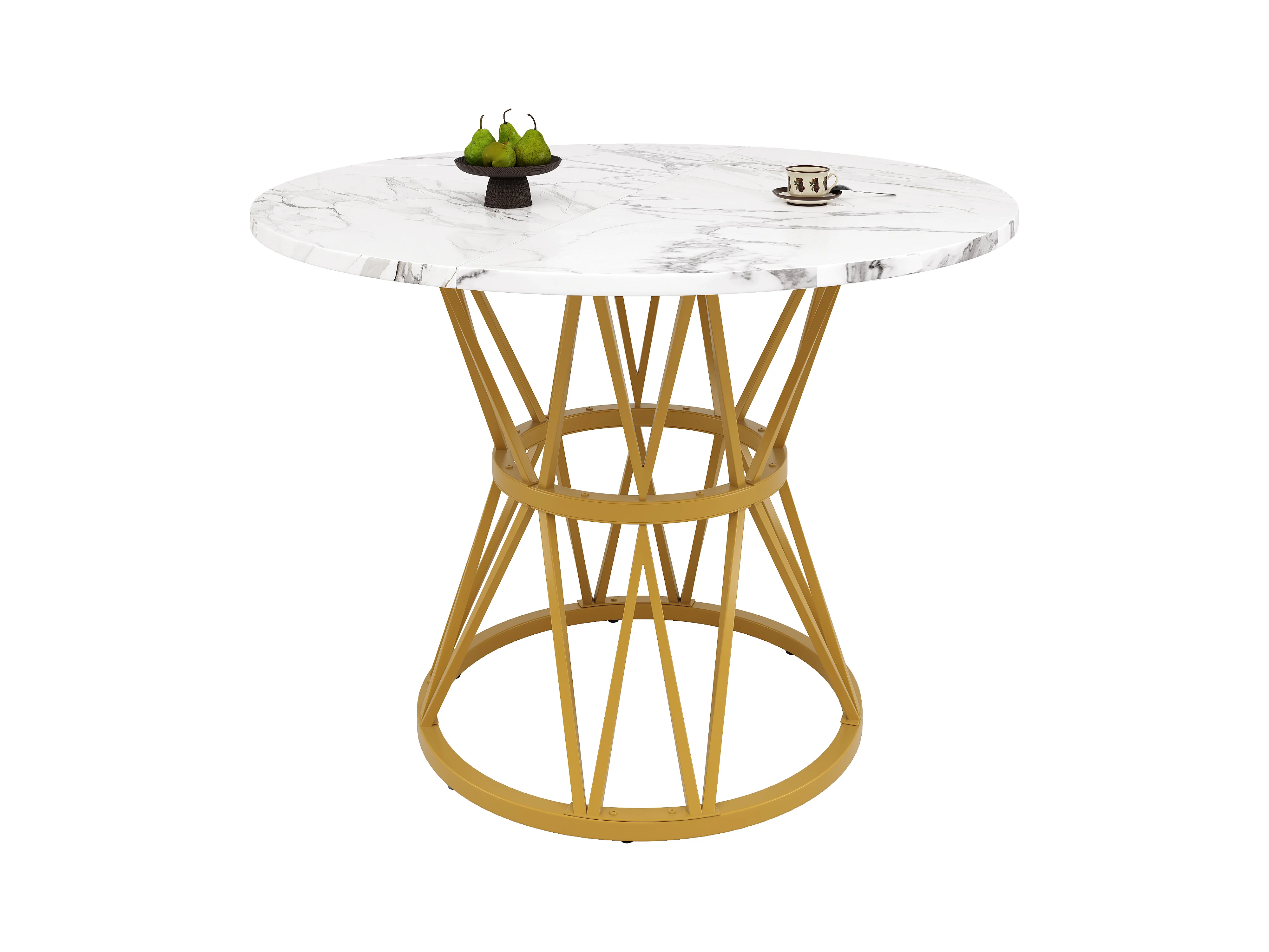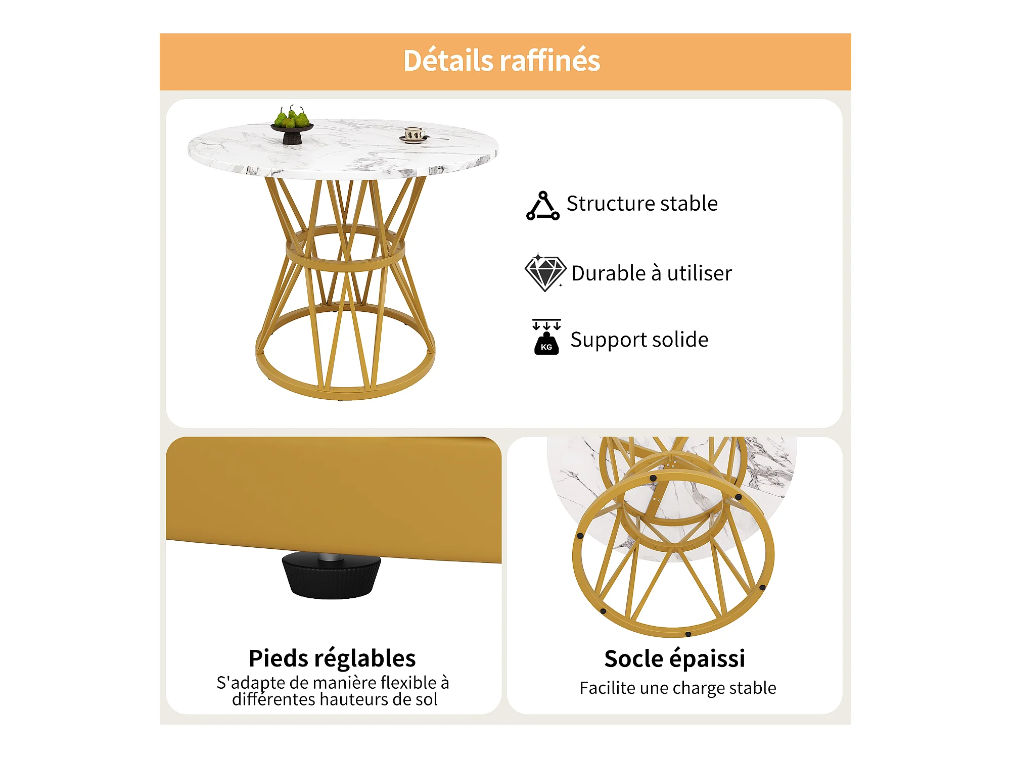 Table à manger ronde 100x100x76cm - Cadre en métal - placage à motif marbre - 2 à 6 personnes - Blanc & Doré