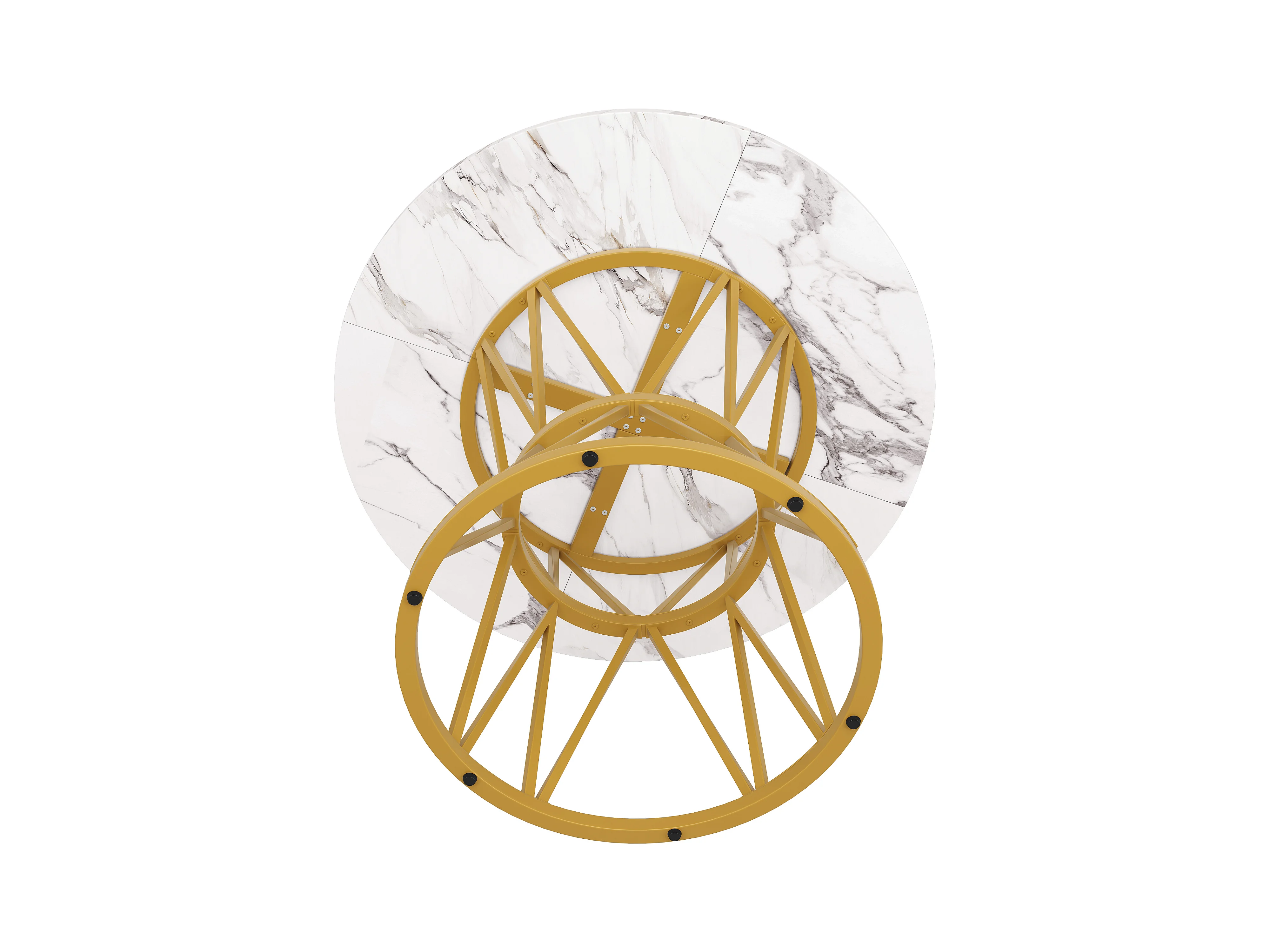 Table à manger ronde moderne (diamètre 1m) - support métallique en forme de X - plateau a motif de marbre - Blanc&Doré