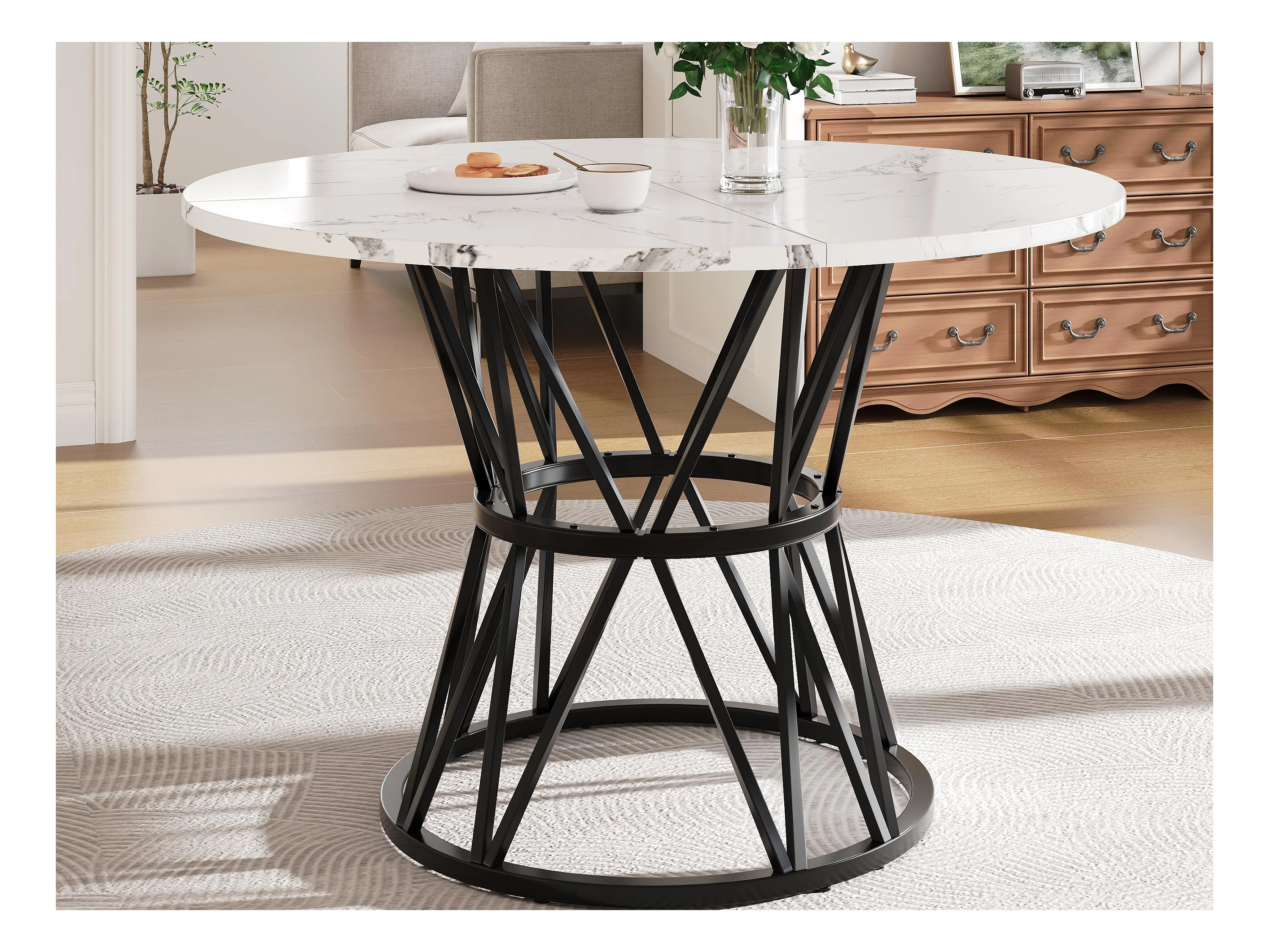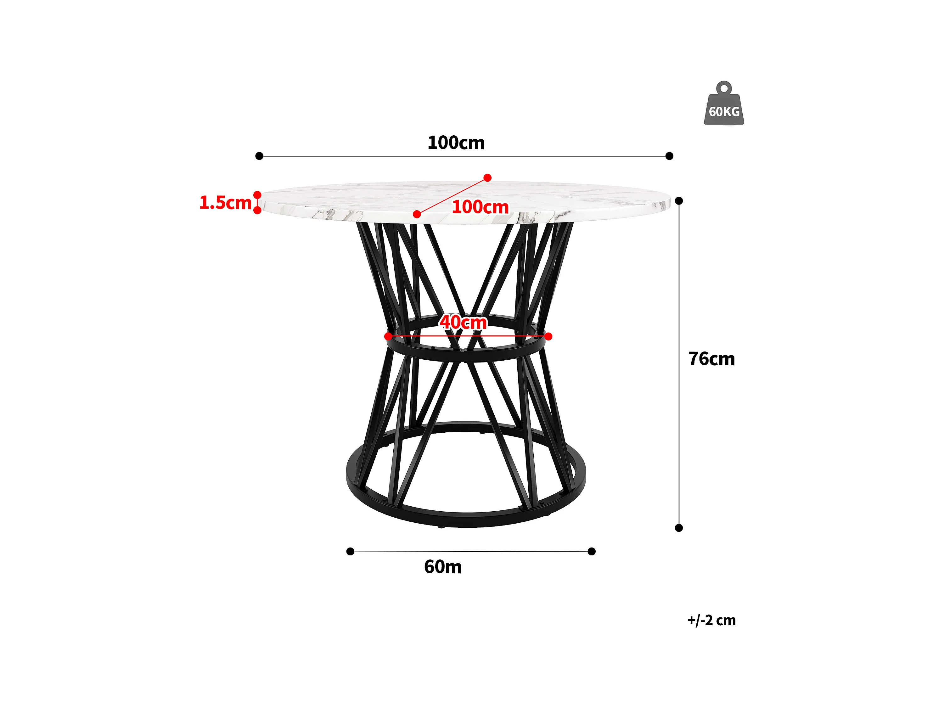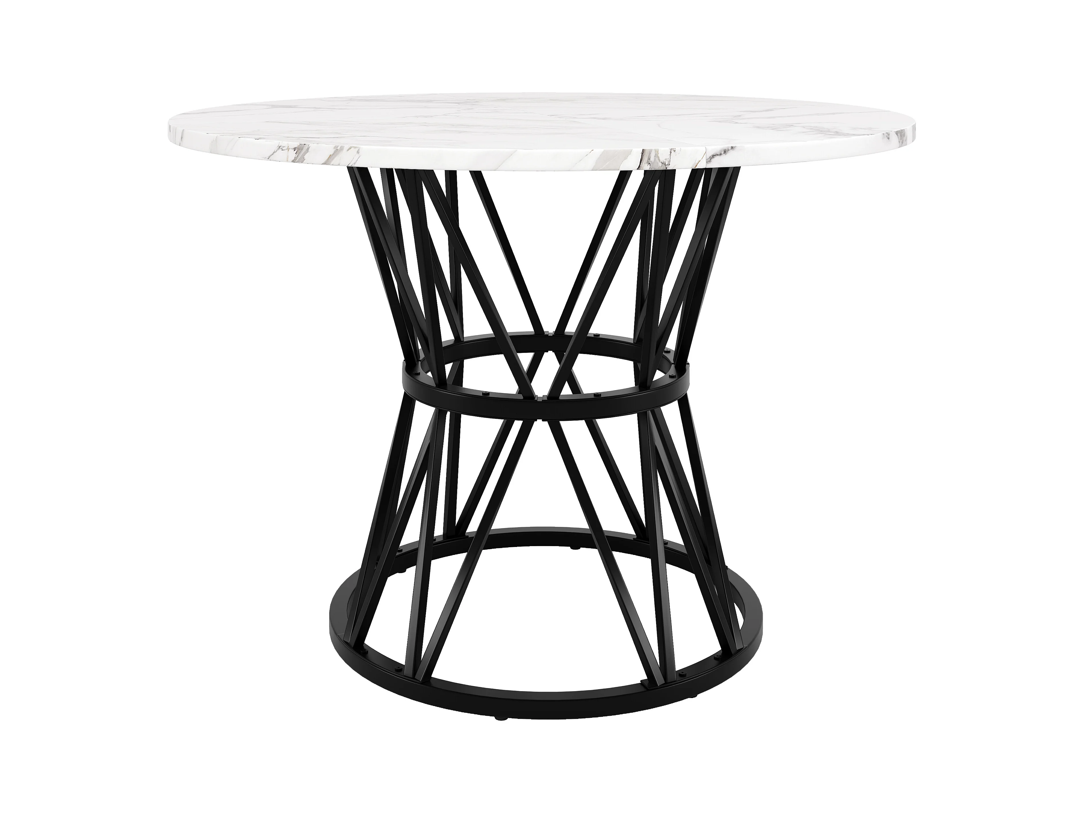 Table à manger ronde - 4 personnes - placage à motif marbre - Cadre en métal - MDF - Blanc & Noir