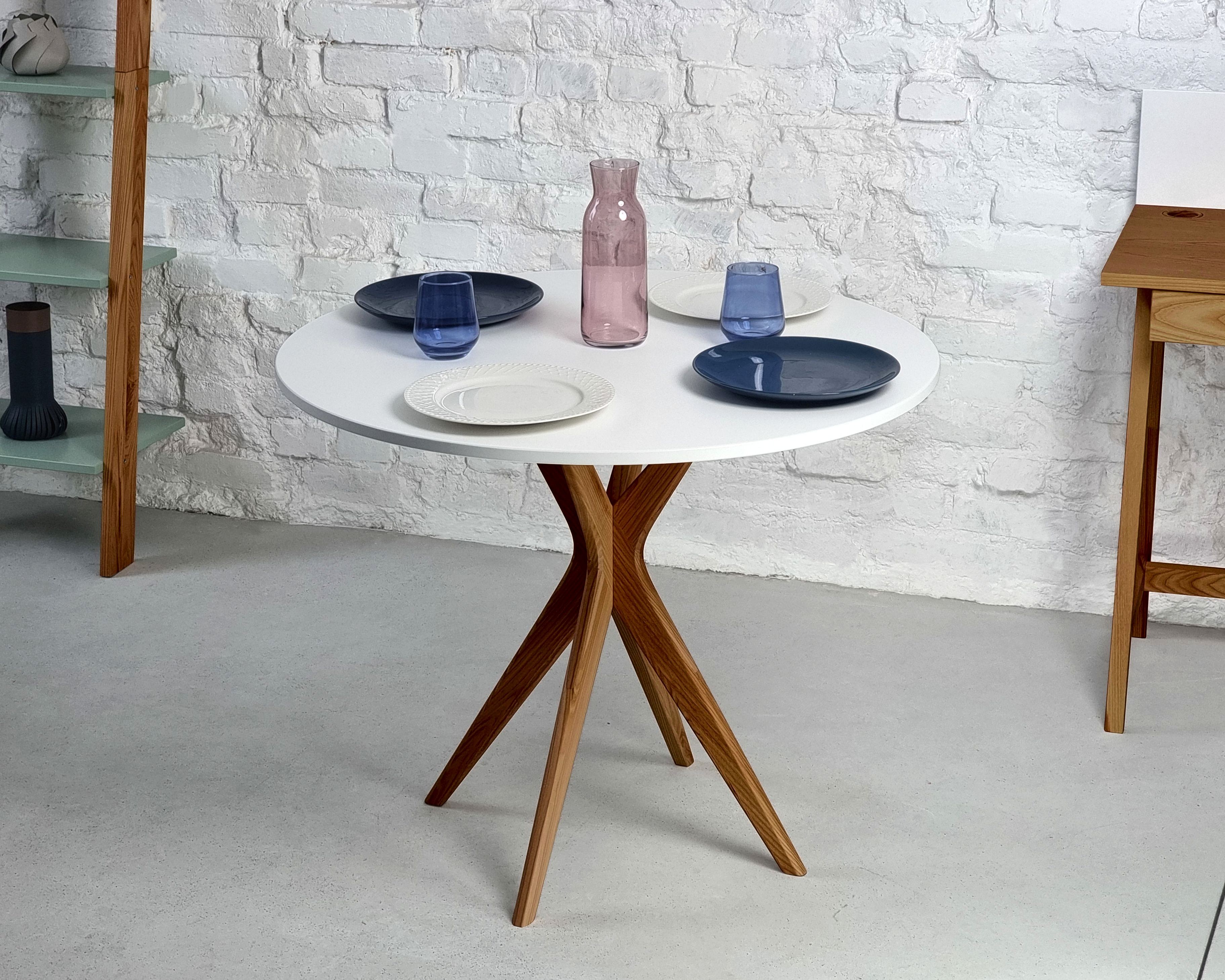 Table à manger ronde 90cm Jubi Blanc Craie | Pied en frêne teinté chêne