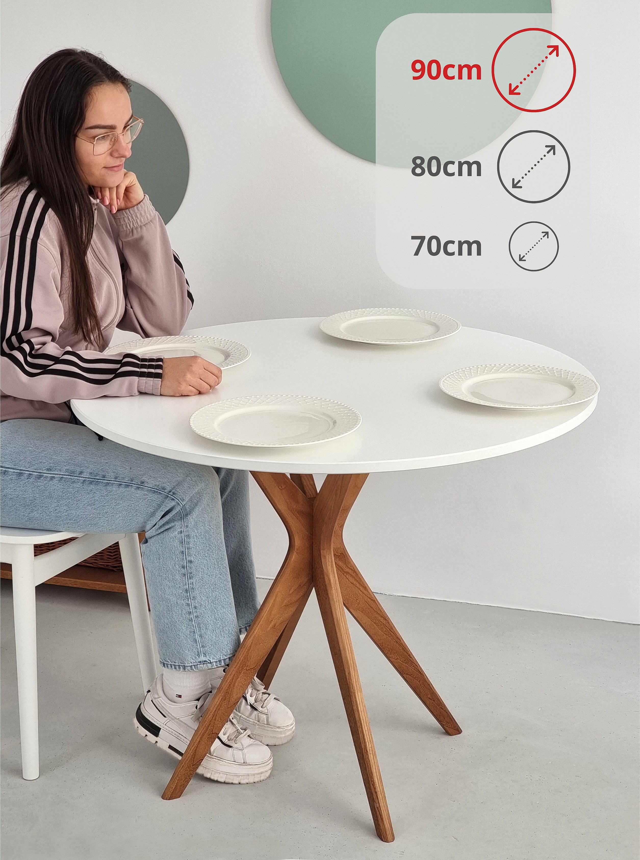Table à manger ronde fixe ZEN, 90x90x77cm, Capacité jusqu'à 4 personnes, Couleur chêne, Pieds métalliques couleur blanc laqué mat
