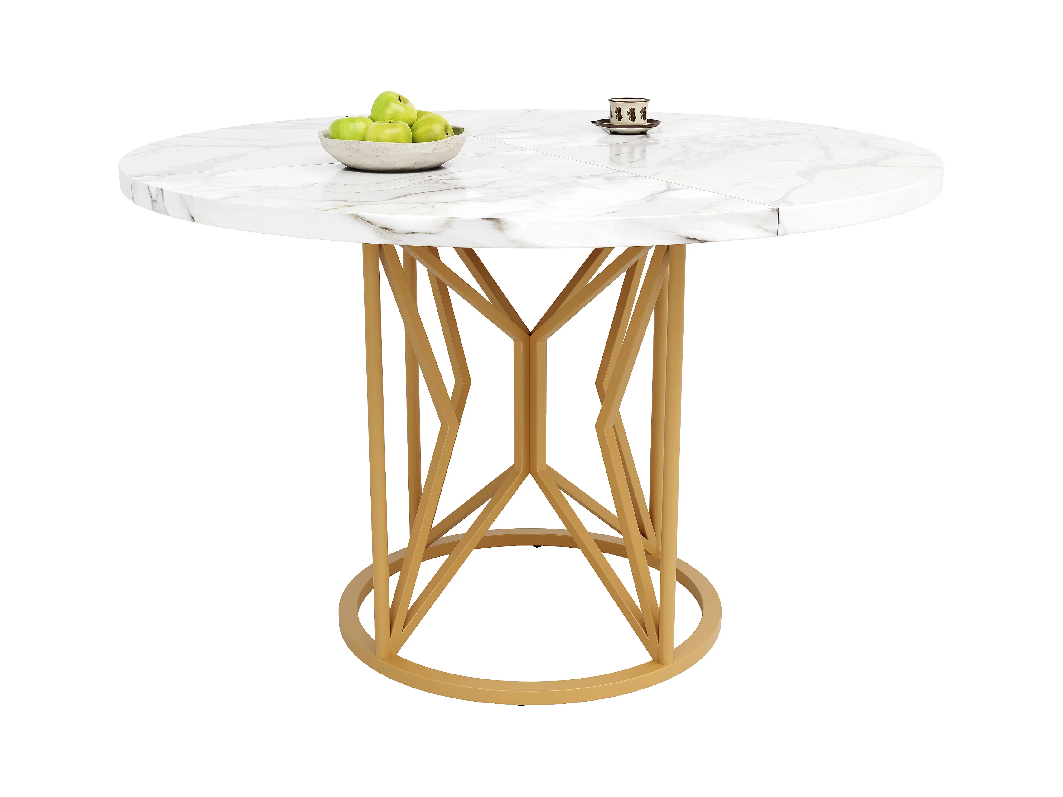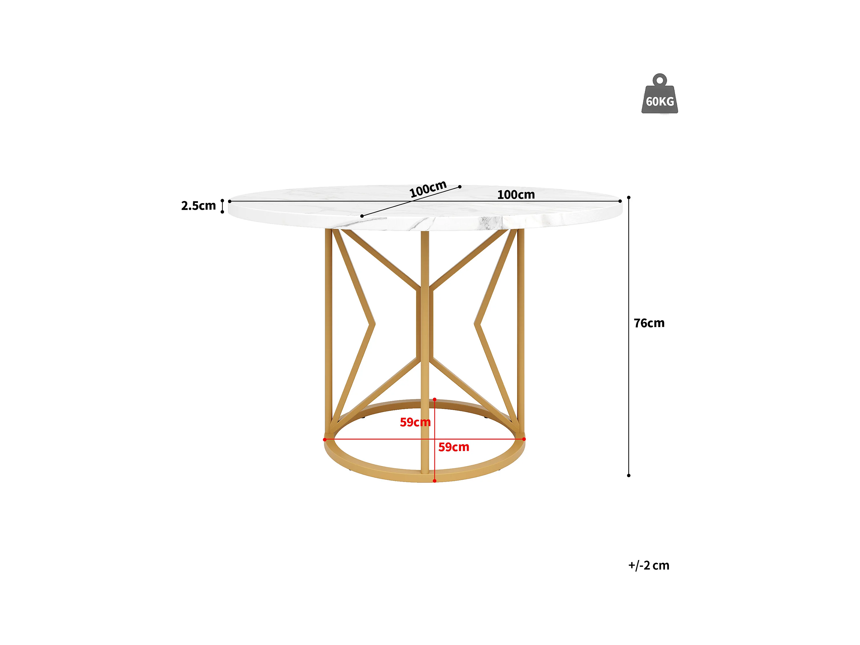 Table à manger ronde 100x100x76cm - Cadre en métal - placage à motif marbre - 2 à 6 personnes - Blanc & Doré